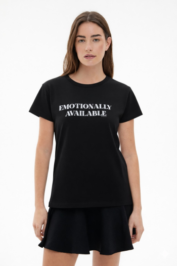REMERA DE JERSEY CON CORTE CLÁSICO Y CUELLO REDONDO. ESTAMPA FRONTAL CON APLIQUE HOTFIX EN TONO AZUL QUE APORTA BRILLO Y PROTAGONISMO. MANGA CORTA Y CALCE RELAJADO, IDEAL PARA COMPLETAR LOOKS CASUALES.