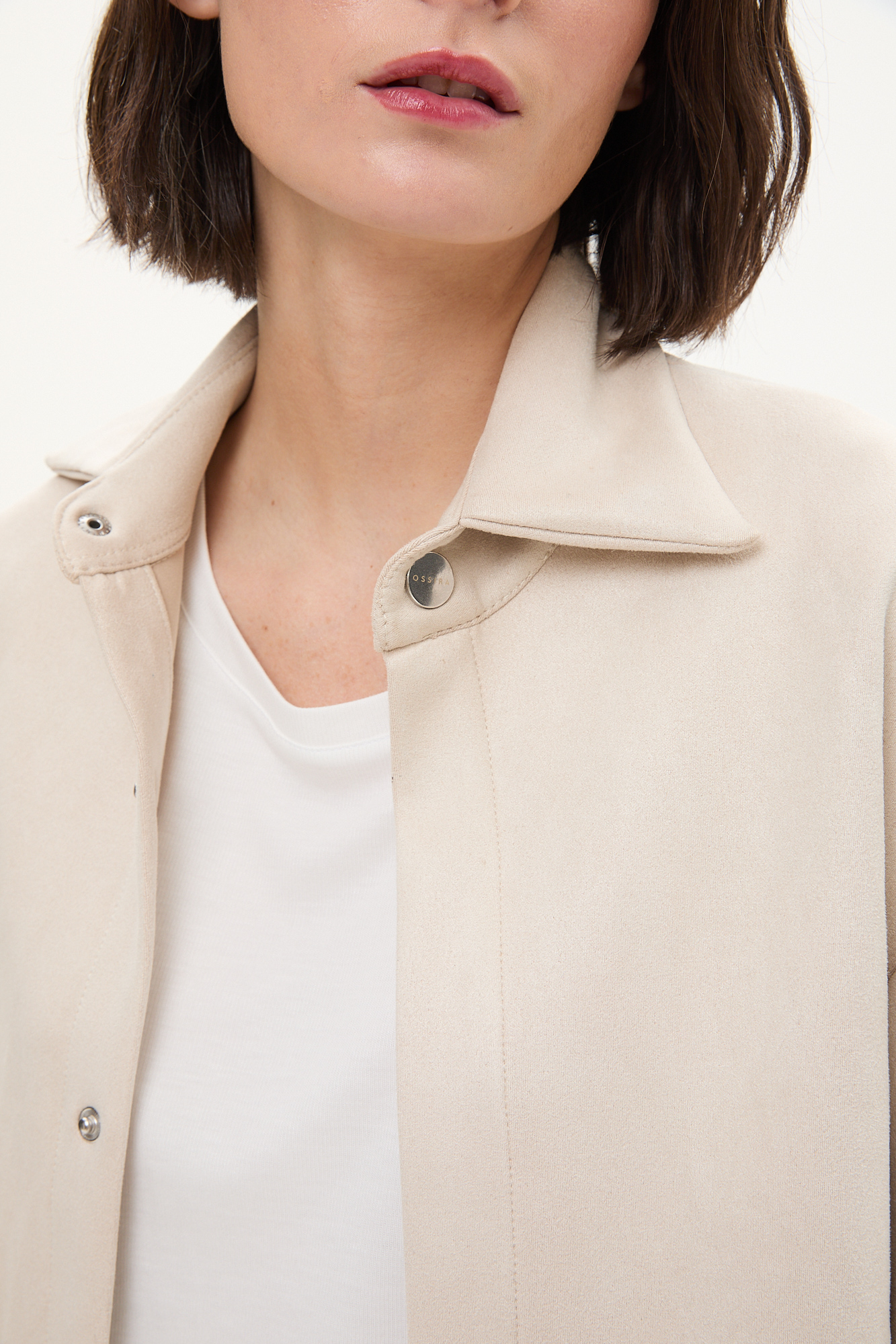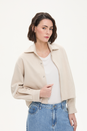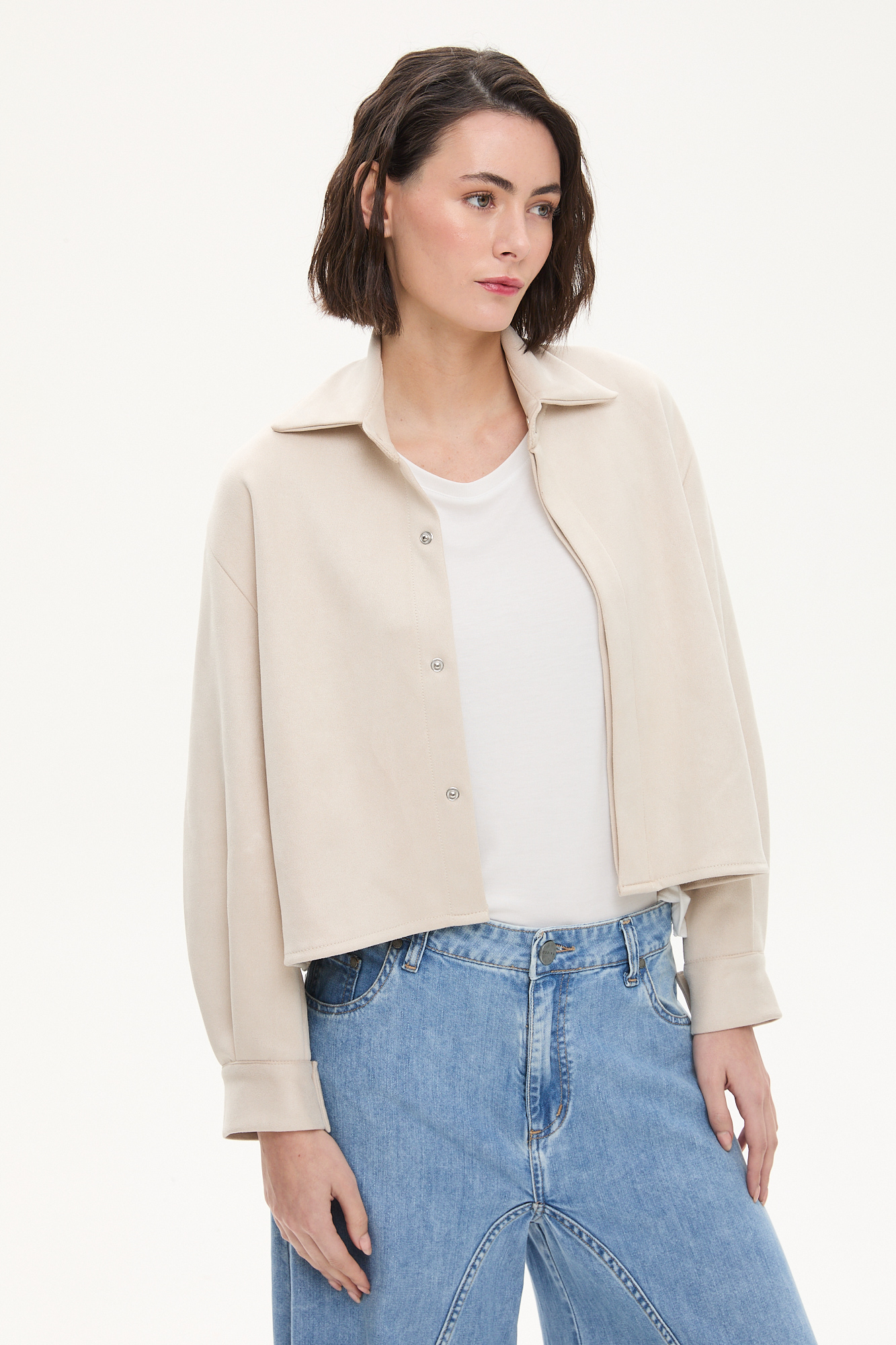 CONFECCIONADA EN GAMUZA SUAVE. CORTE RECTO Y CORTO CON CUELLO CLÁSICO Y MANGA LARGA. CIERRE FRONTAL CON BROCHES METÁLICOS A PRESIÓN Y TERMINACIONES PROLIJAS. 94% POLIÉSTER · 6% SPANDEX.