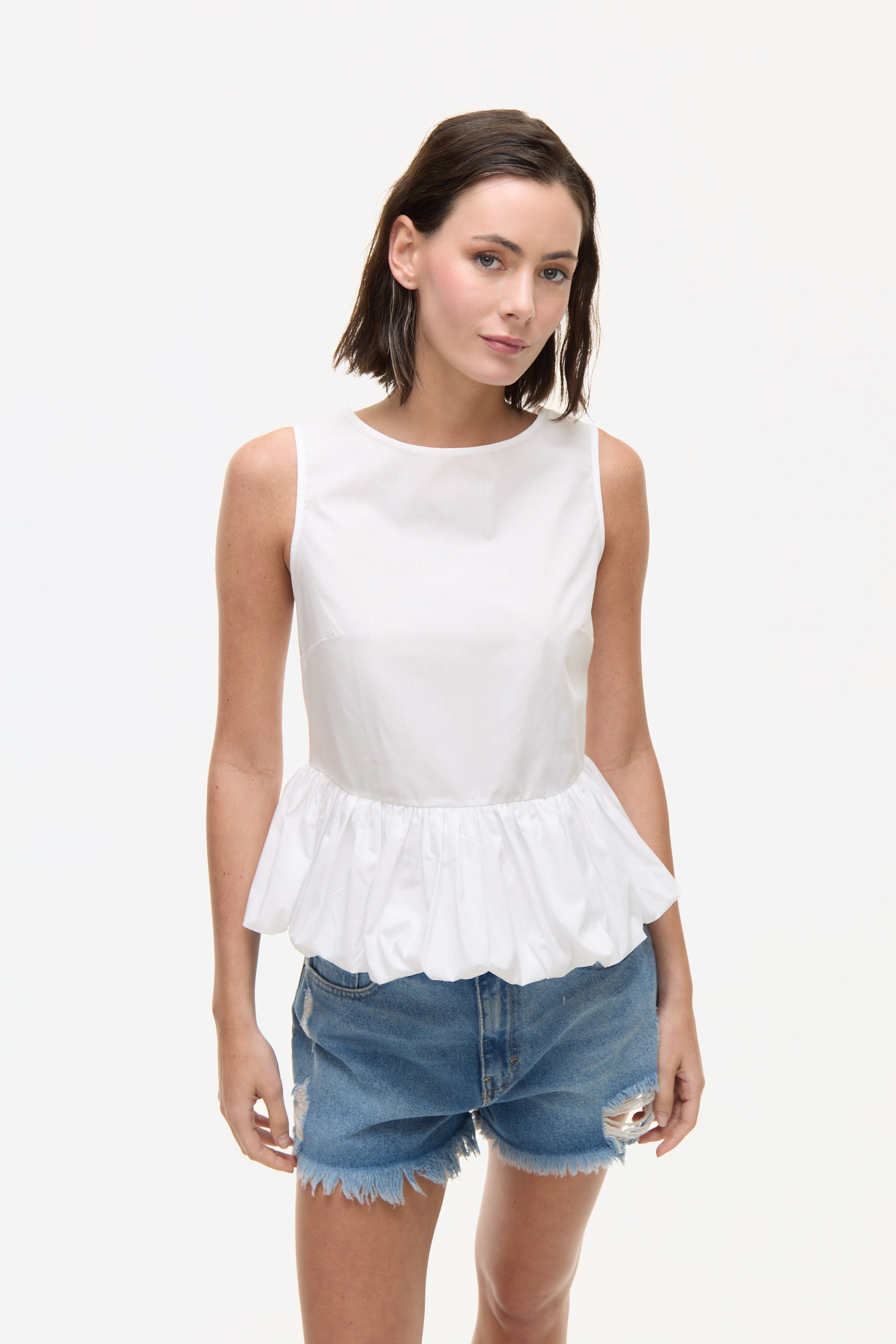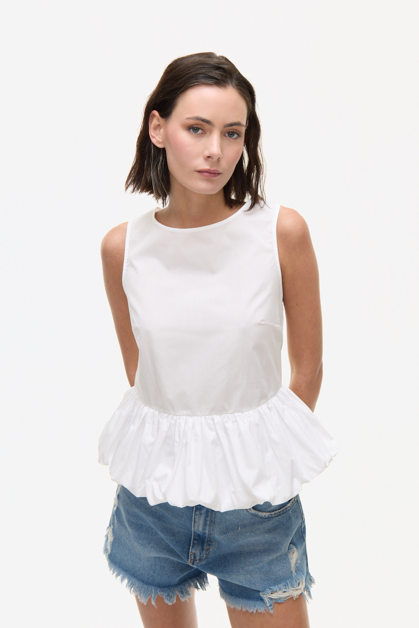 TOP CONFECCIONADO EN TEJIDO DE ALGODÓN. DISEÑO SIN MANGAS Y DE CALCE RELAJADO, CON ESCOTE CERRADO AL FRENTE Y ESPALDA PROFUNDA EN V CON LAZO DE AJUSTE.100% ALGODÓN.