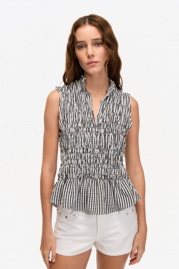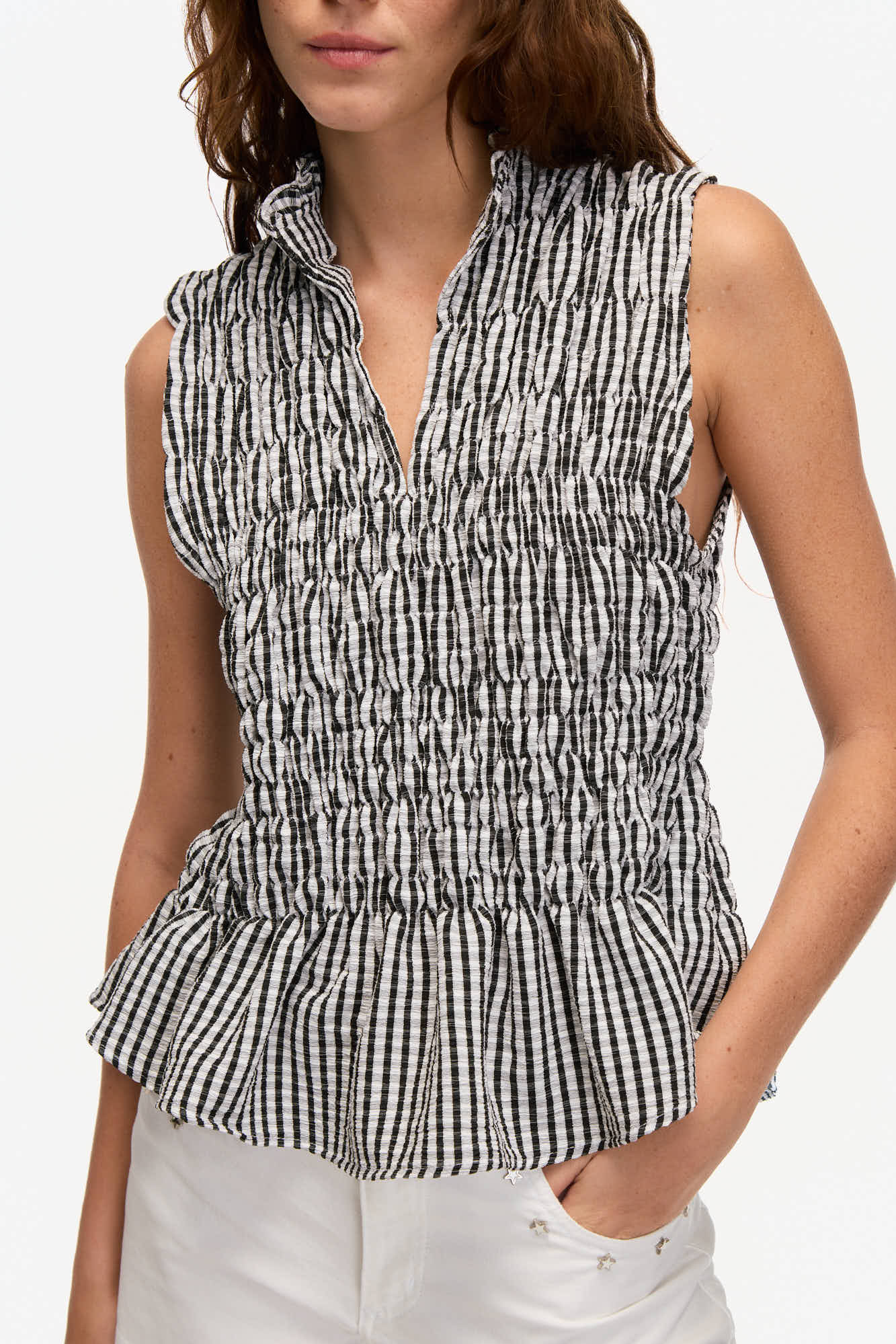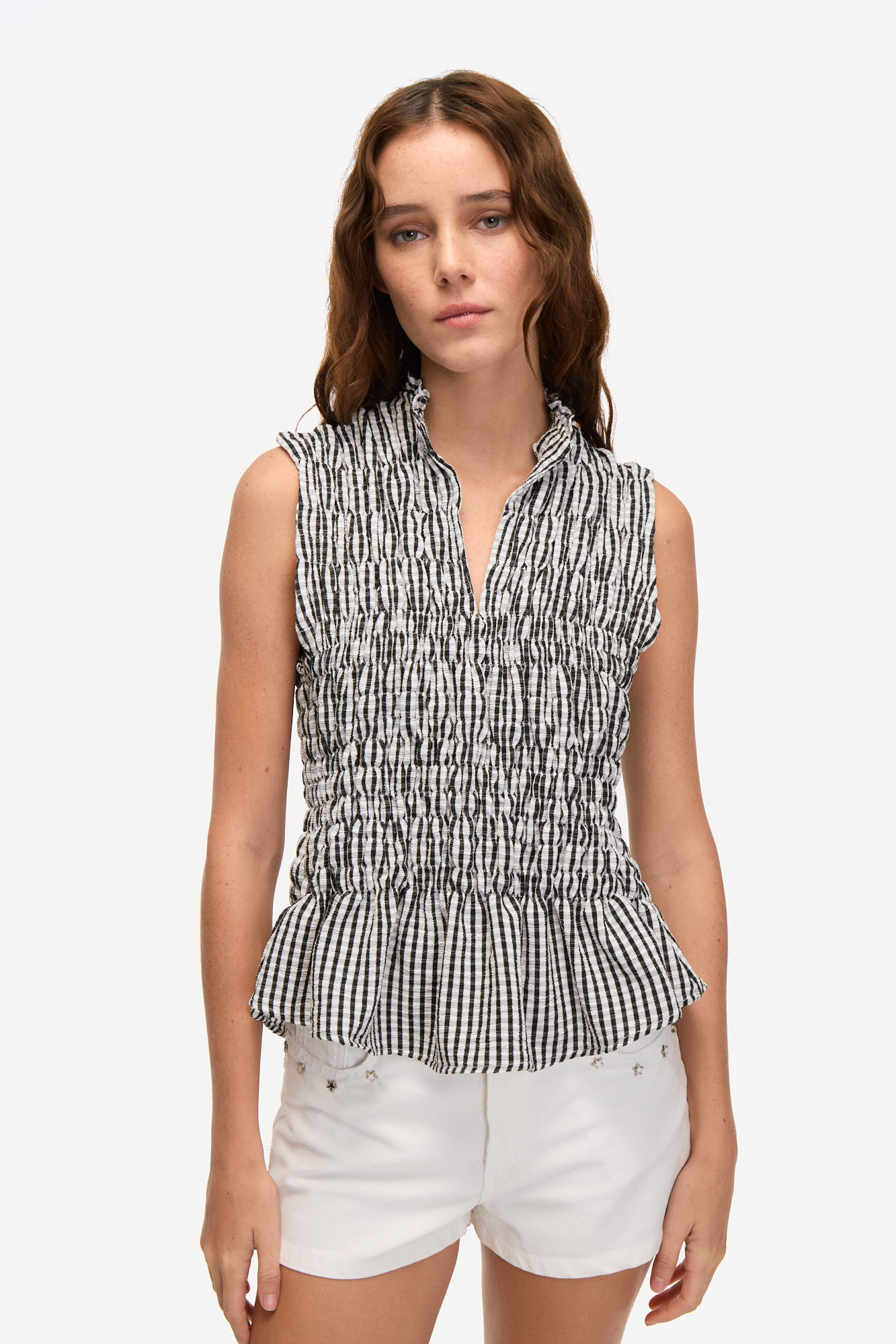 TOP EN TEJIDO LIVIANO TEXTURADO. DISEÑO SIN MANGAS, CALCE ENTALLADO, CUELLO MAO CON ESCOTE EN V Y FRENTE FRUNCIDO TIPO SMOCK. TERMINACIÓN CON VOLADO EN EL RUEDO Y ESTAMPA RAYADA EN TONOS SUAVES.