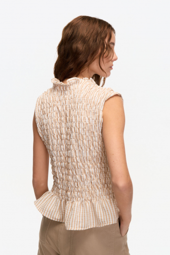 TOP EN TEJIDO LIVIANO TEXTURADO. DISEÑO SIN MANGAS, CALCE ENTALLADO, CUELLO MAO CON ESCOTE EN V Y FRENTE FRUNCIDO TIPO SMOCK. TERMINACIÓN CON VOLADO EN EL RUEDO Y ESTAMPA RAYADA EN TONOS SUAVES.
