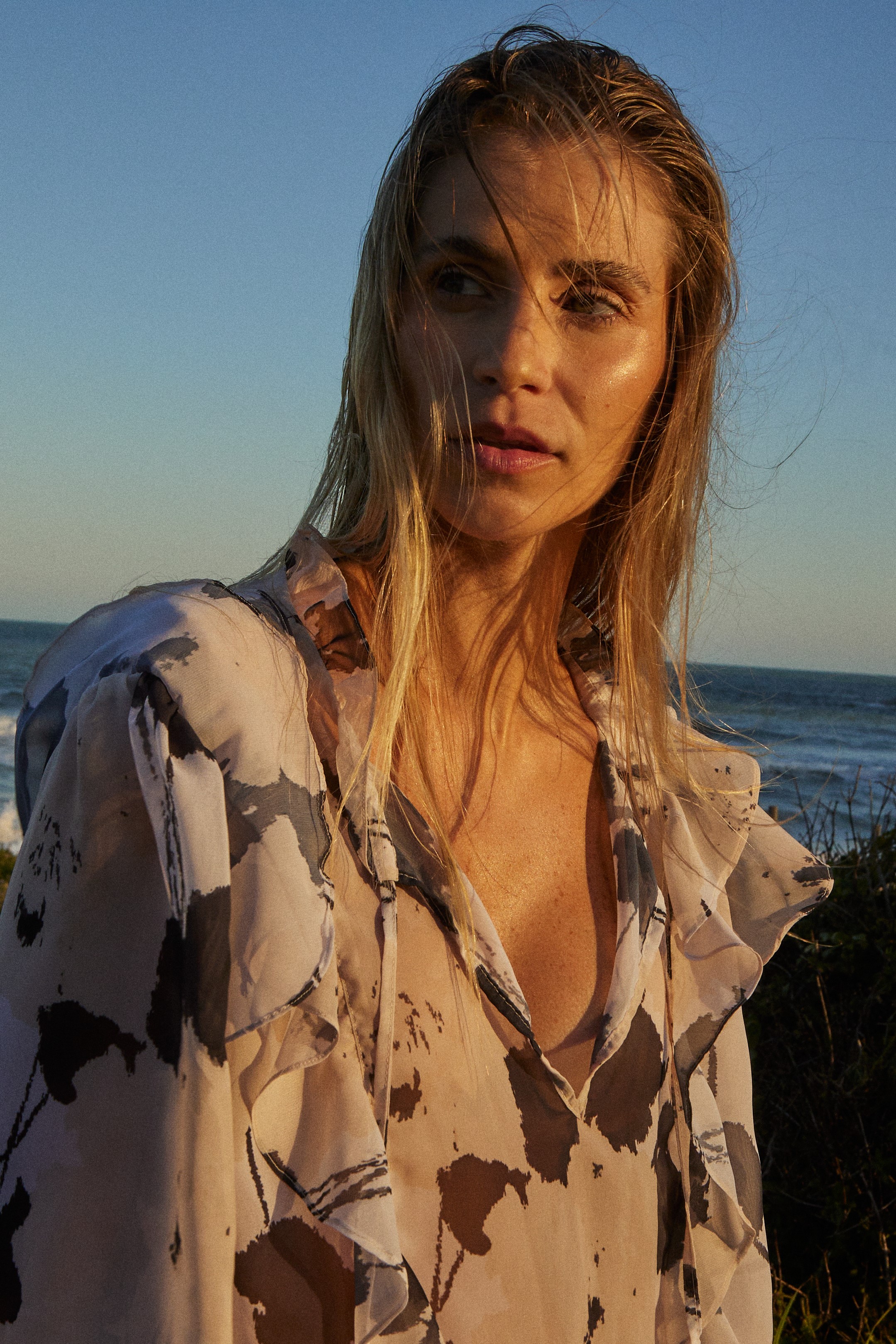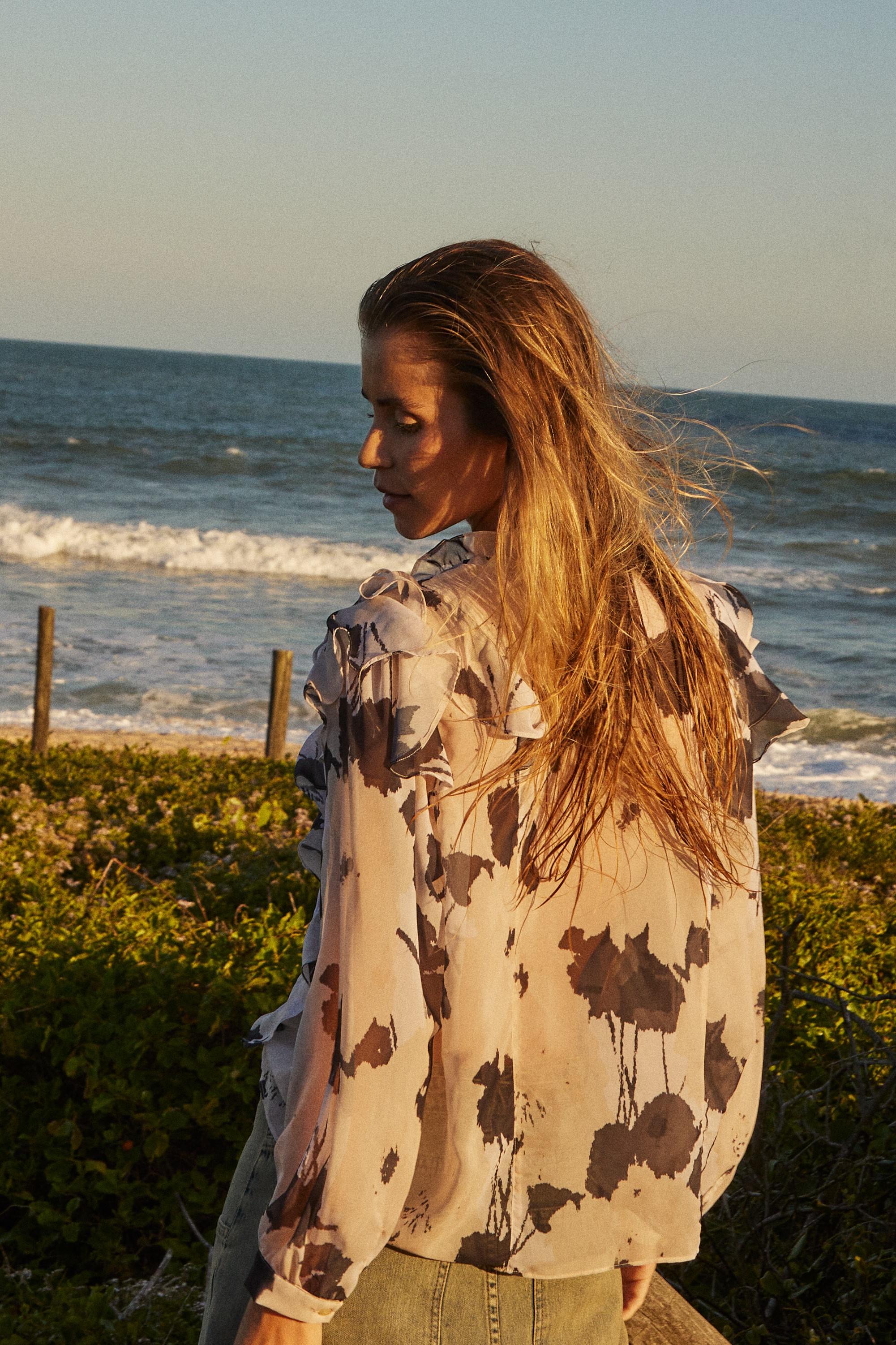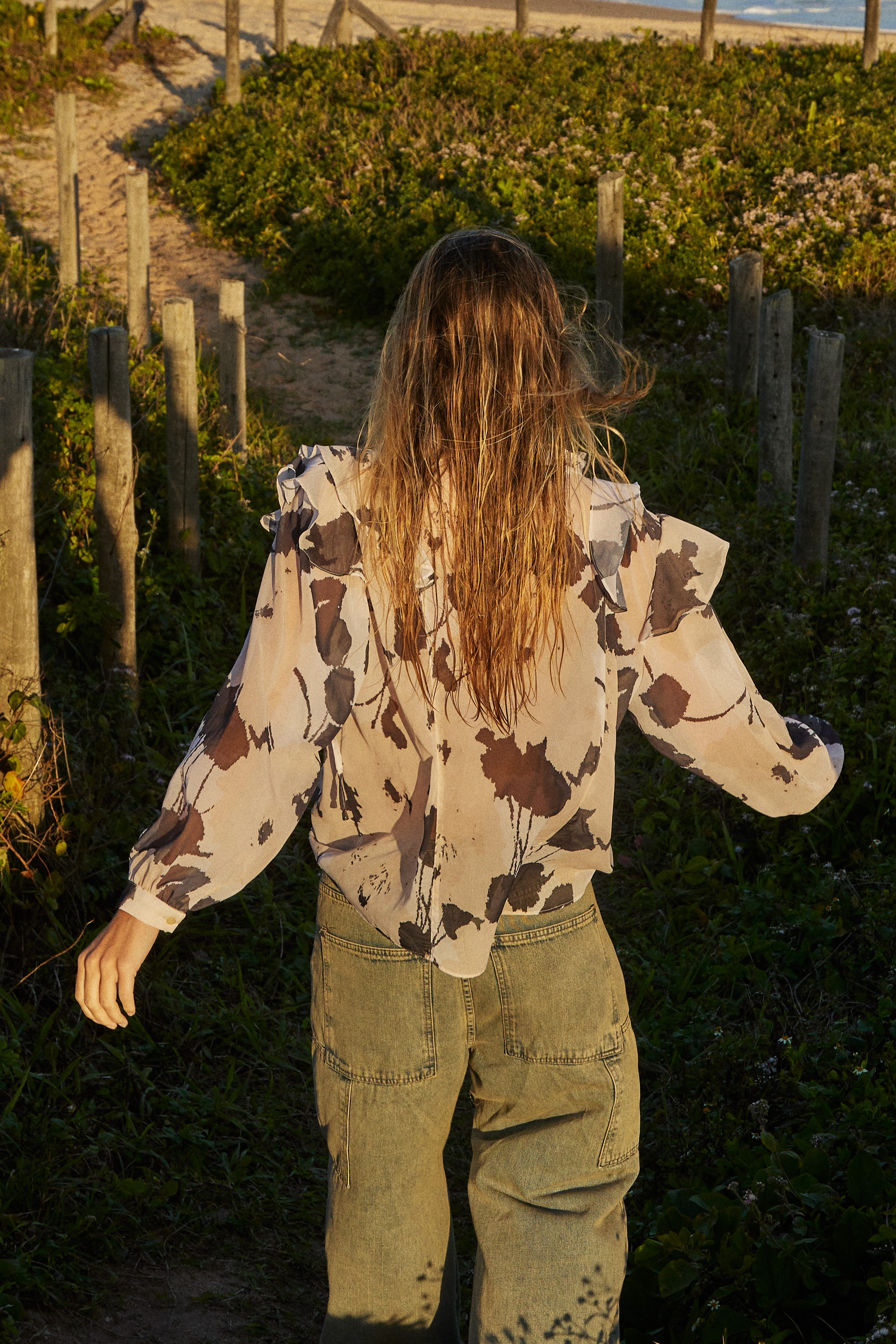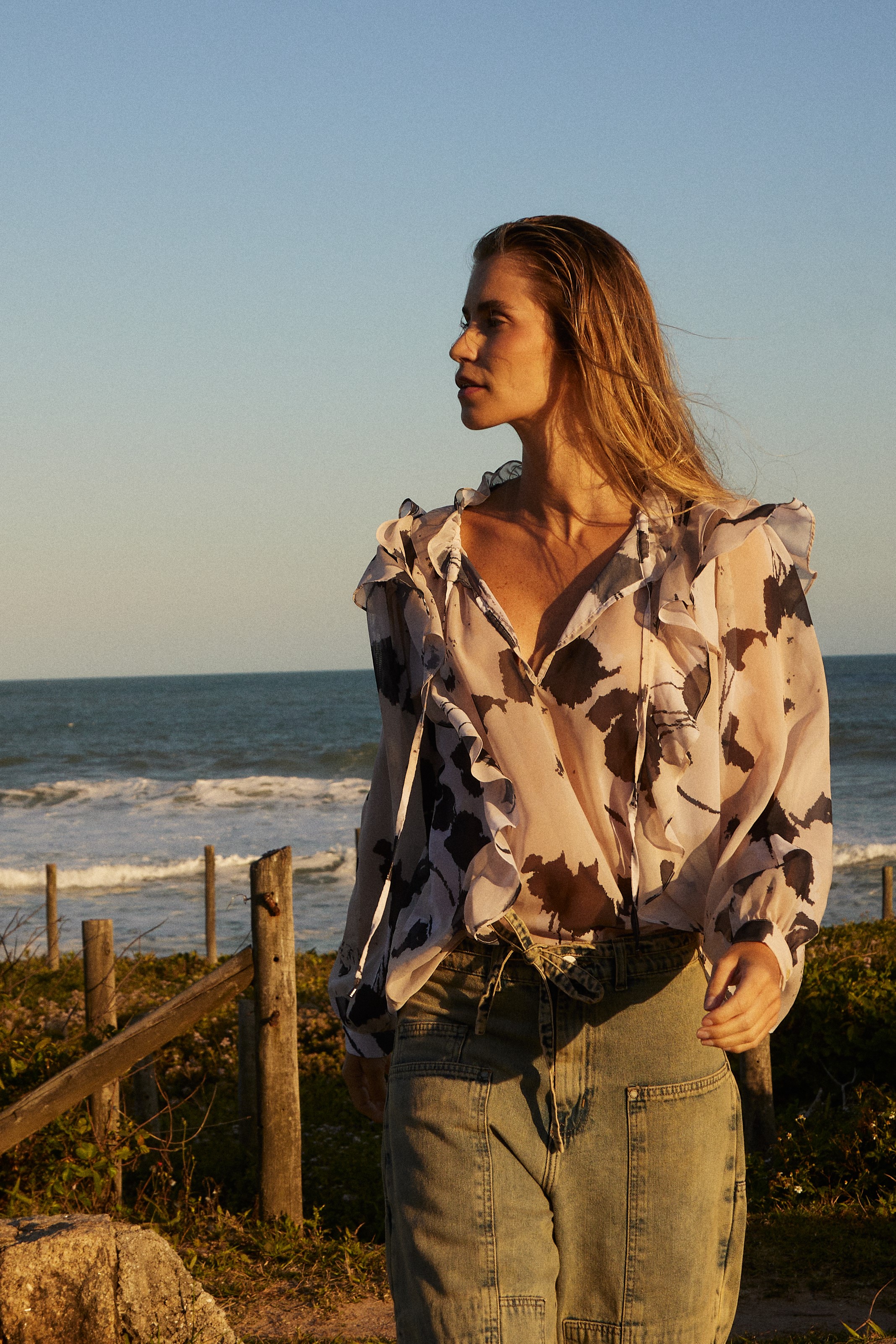 CONFECCIONADA EN GASA ESTAMPADA. DISEÑO CON ESCOTE EN V Y VOLADOS APLICADOS EN DELANTERO Y HOMBROS. MANGA LARGA CON CAÍDA SUAVE. 100% POLIÉSTER.
