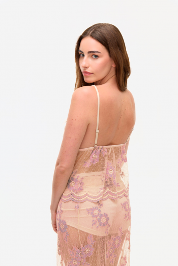 TOP DE MICROTUL BORDADO CON DISEÑO FLORAL EN TONOS BEIGE. MODELO TRIÁNGULO CON BRETEL FINO REGULABLE Y DELANTERO CON LAZO AJUSTABLE PARA ADAPTAR EL CALCE. TEJIDO TRANSLÚCIDO Y LIGERO.100% POLIESTER.