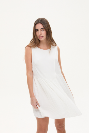 VESTIDO SIN MANGAS CONFECCIONADO EN 100% POLIÉSTER. ESCOTE REDONDO Y DISEÑO LISO EN LA PARTE SUPERIOR. FALDA CON PLIEGUES QUE APORTAN MOVIMIENTO Y TEXTURA. CORTE RECTO CON CAÍDA FLUIDA. 100% POLIÉSTER