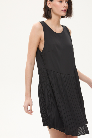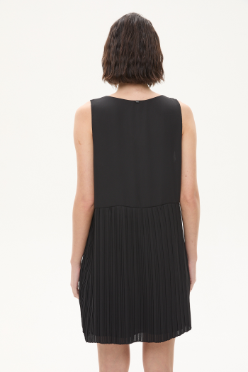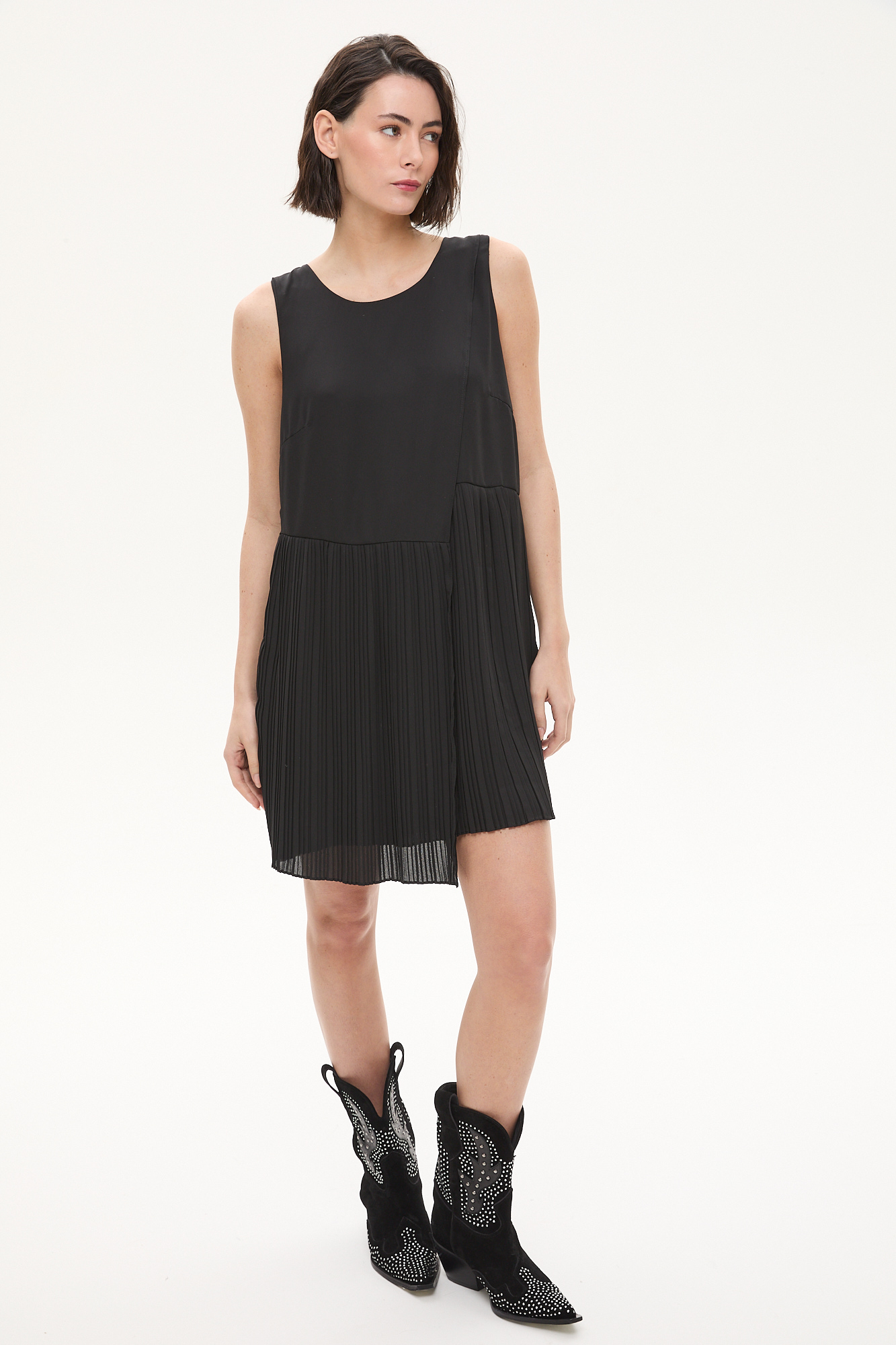 VESTIDO SIN MANGAS CONFECCIONADO EN 100% POLIÉSTER. ESCOTE REDONDO Y DISEÑO LISO EN LA PARTE SUPERIOR. FALDA CON PLIEGUES QUE APORTAN MOVIMIENTO Y TEXTURA. CORTE RECTO CON CAÍDA FLUIDA. 100% POLIÉSTER