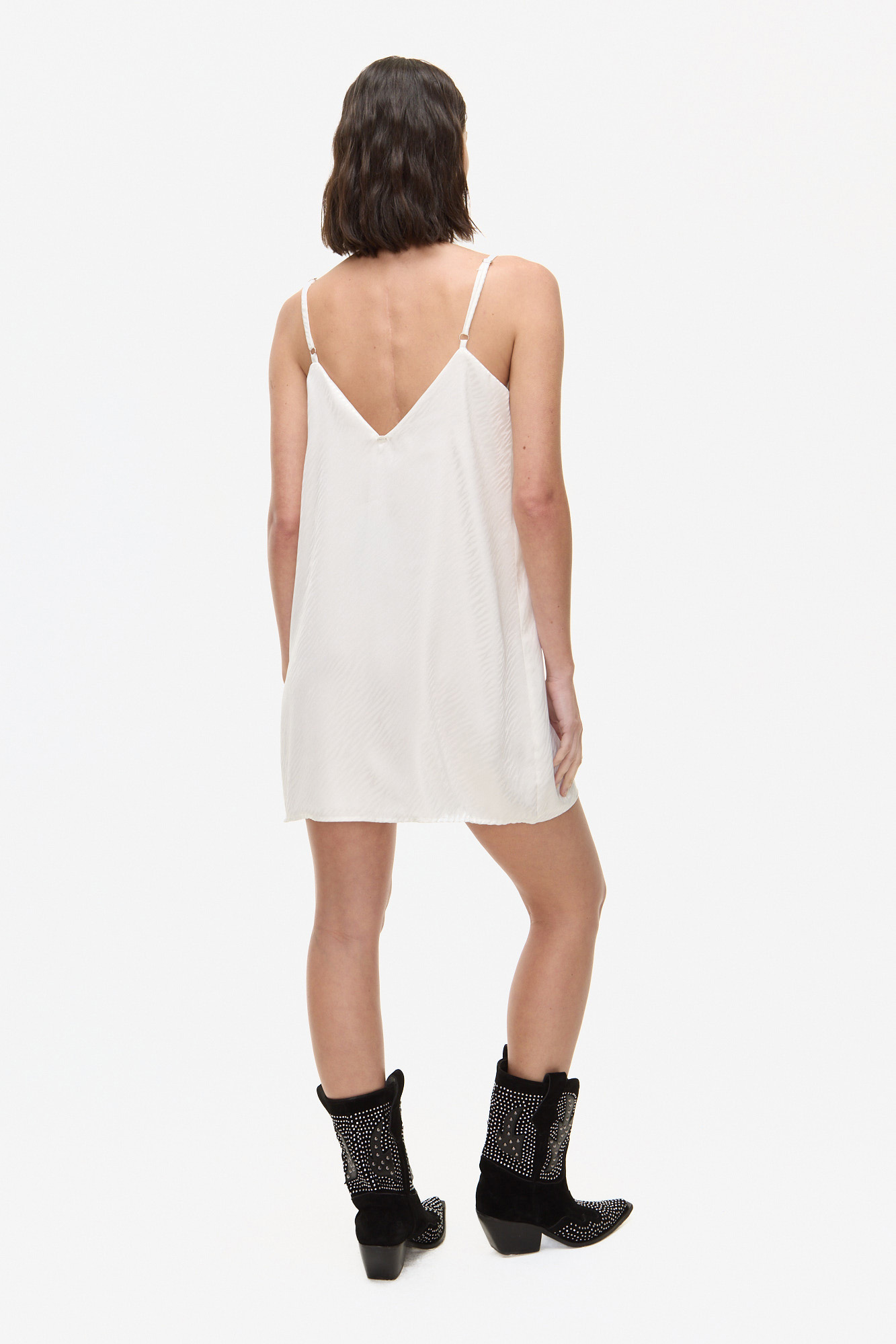 CONFECCIONADO EN TEJIDO SATINADO DE POLIÉSTER. VESTIDO LIVIANO CON BRETEL FINO REGULABLE, ESCOTE EN “V” Y APLIQUES DE FLECOS BRILLANTES EN EL CONTORNO SUPERIOR. CAÍDA SUAVE, CALCE RELAJADO Y TERMINACIONES CUIDADAS.