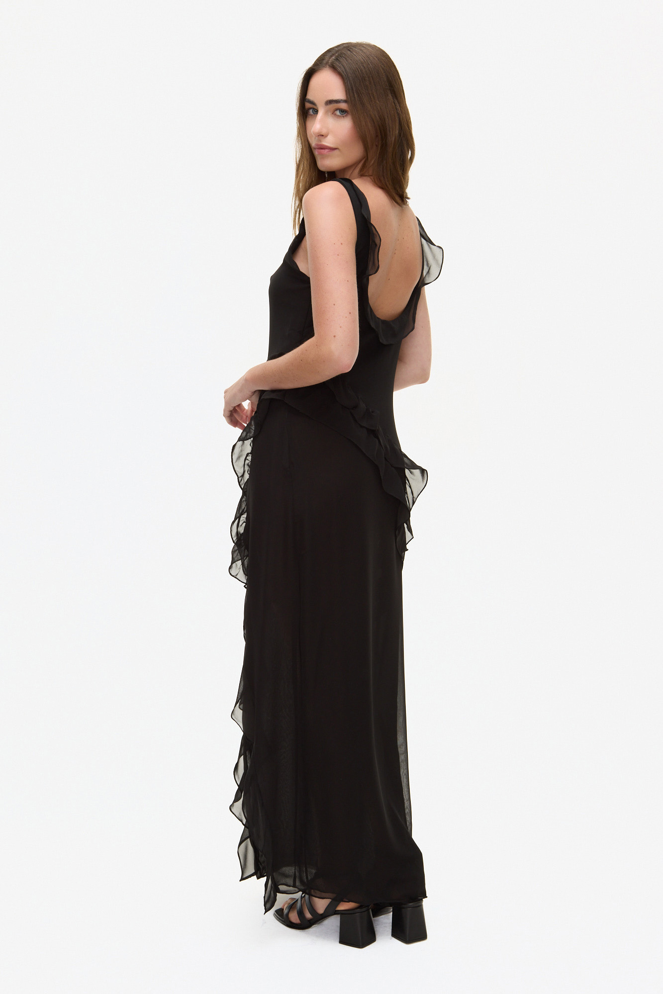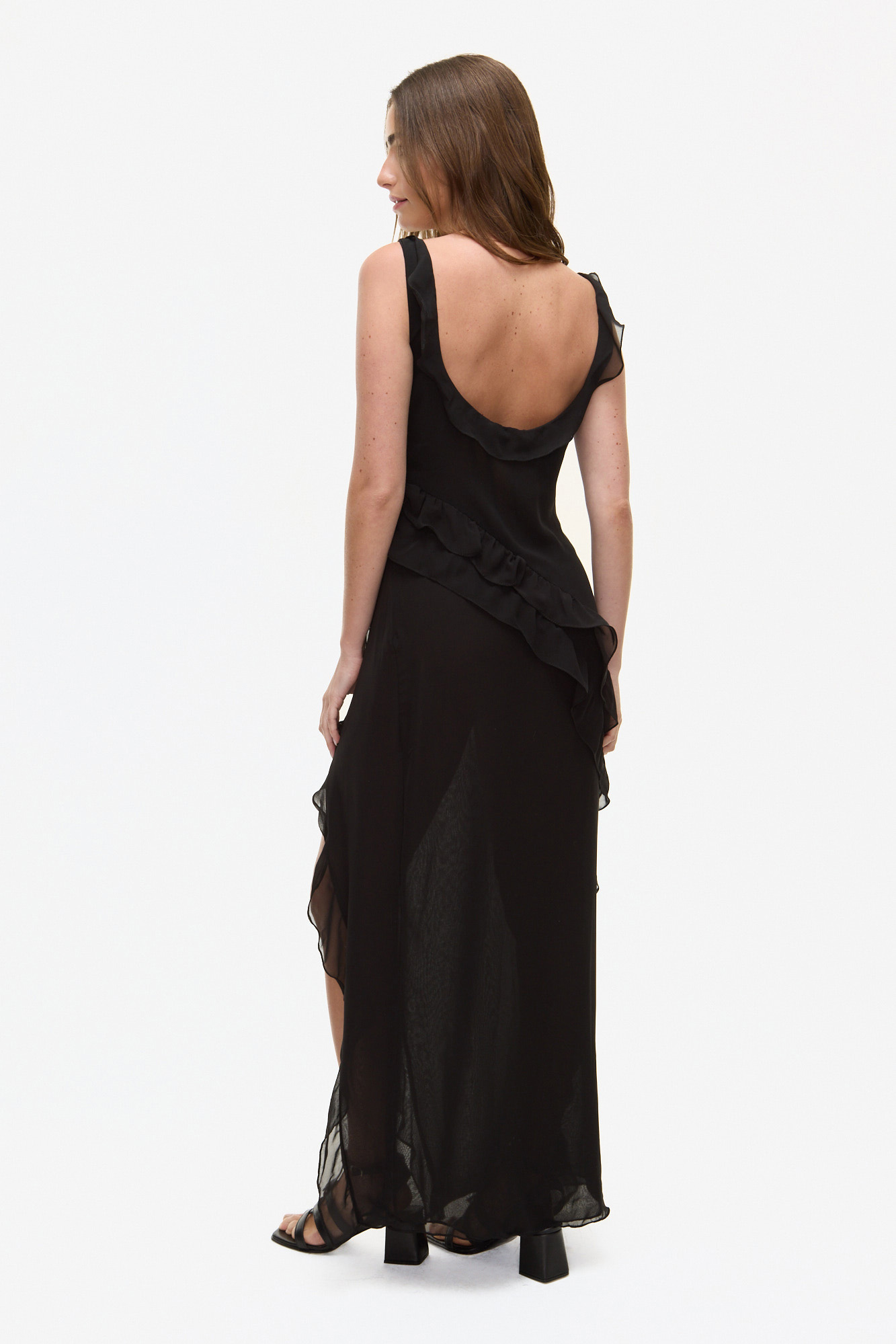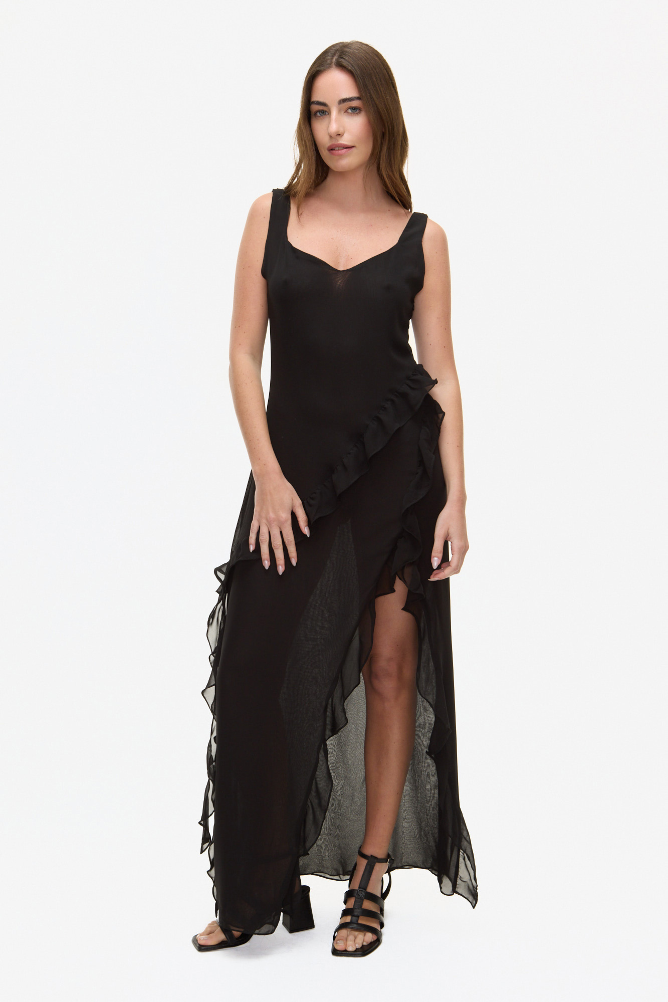 VESTIDO LARGO CONFECCIONADO EN POLIÉSTER. DISEÑO DE CALCE RELAJADO CON ESCOTE SUAVE Y TIRAS ANCHAS. PRESENTA VOLADOS A CONTRATONO QUE ACOMPAÑAN LA CAÍDA DE LA PRENDA Y APORTAN MOVIMIENTO, CON ABERTURA FRONTAL QUE REALZA LA SILUETA. ACABADO LIVIANO, DE TEXTURA FLUIDA Y TERMINACIONES LIMPIAS.