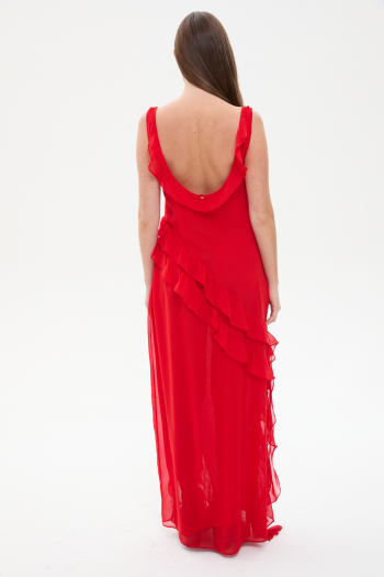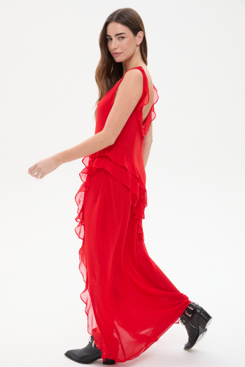 VESTIDO LARGO CONFECCIONADO EN POLIÉSTER. DISEÑO DE CALCE RELAJADO CON ESCOTE SUAVE Y TIRAS ANCHAS. PRESENTA VOLADOS A CONTRATONO QUE ACOMPAÑAN LA CAÍDA DE LA PRENDA Y APORTAN MOVIMIENTO, CON ABERTURA FRONTAL QUE REALZA LA SILUETA. ACABADO LIVIANO, DE TEXTURA FLUIDA Y TERMINACIONES LIMPIAS. 100% POLIÉSTER