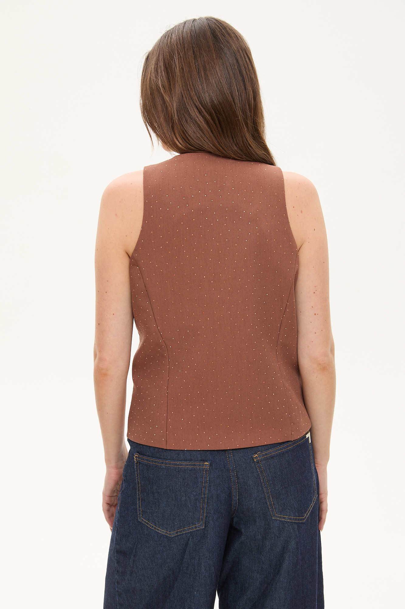CHALECO SASTRERO SIN MANGAS CON ESCOTE EN “V”. PRESENTA DISEÑO CON STRASS, BOTONES FRONTALES Y DOS BOLSILLOS ESTILO OJAL. SILUETA ENTALLADA Y LARGO A LA CADERA.100% POLIÉSTER.