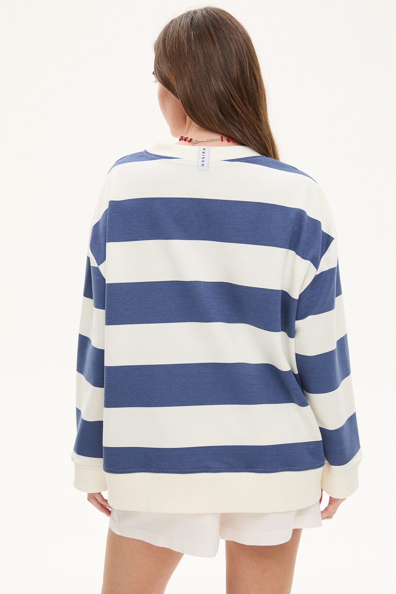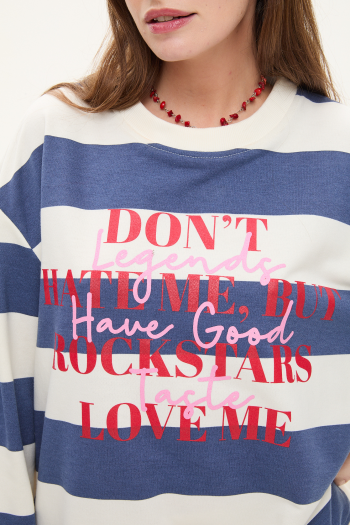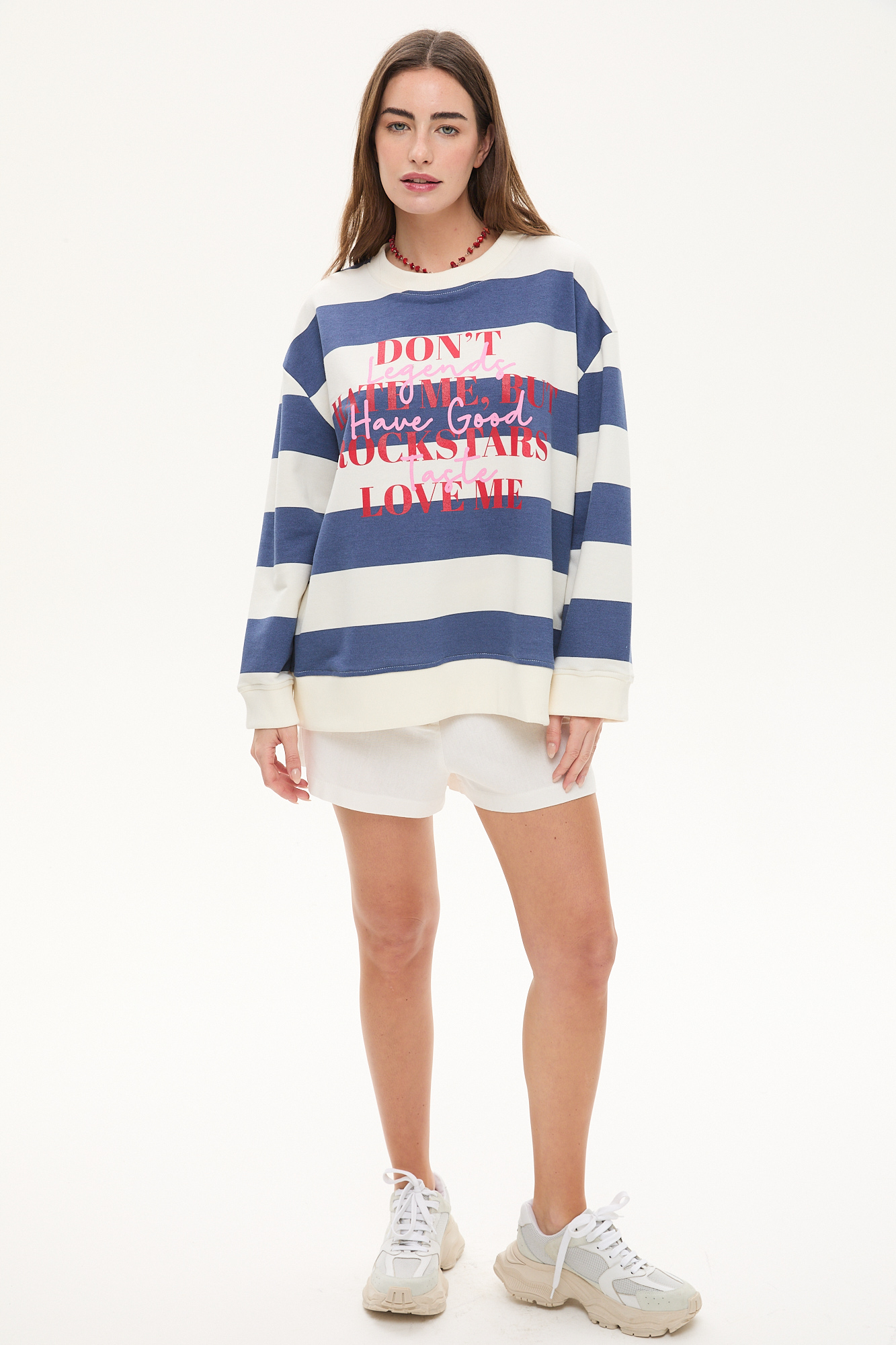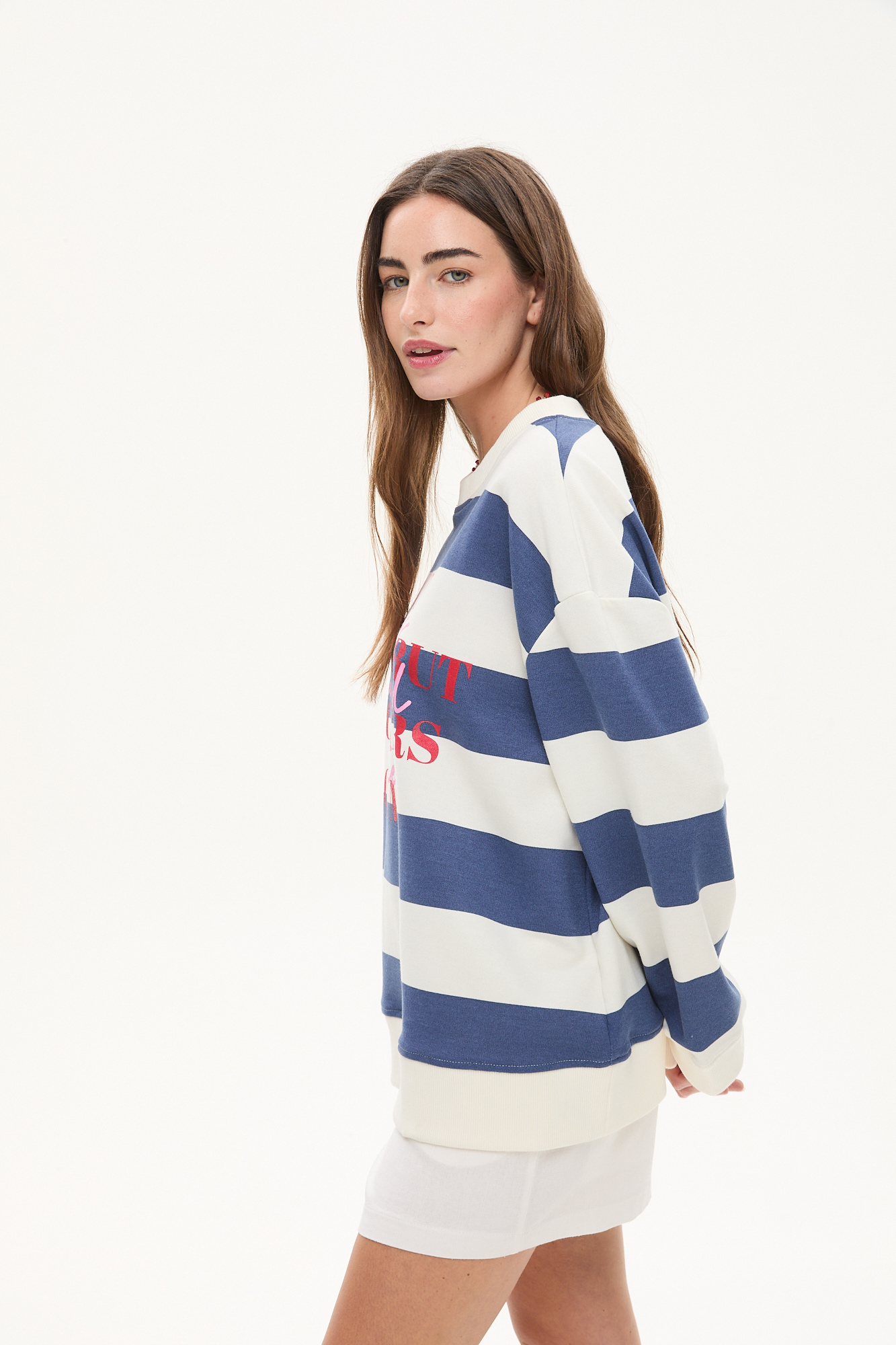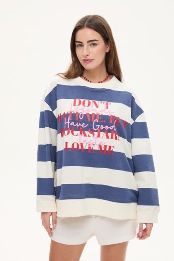 BUZO DE ALGODÓN RUSTICO RAYADO CON ESTAMPA EN COLOR. LARGO HASTA CADERA.
