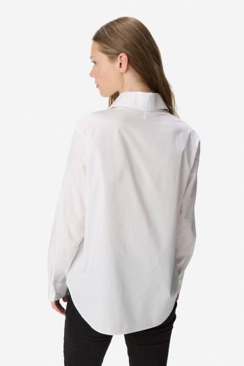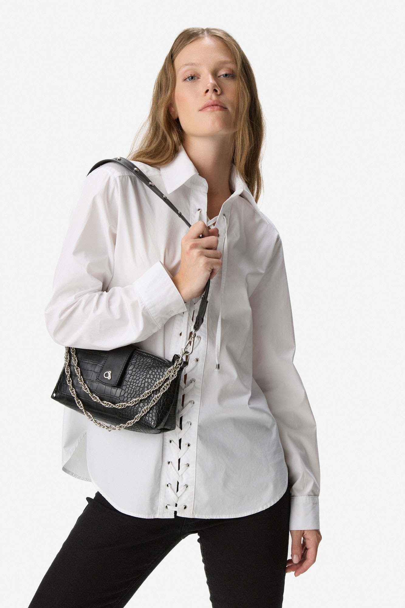 Camisa de calce holgado confeccionada en poplín de algodón premium. Destaca por su detalle frontal de ojalillos metálicos y acordonado regulable, que le aporta un giro moderno al diseño clásico. Posee cuello camisero tradicional, mangas largas con puños definidos y bajo redondeado. Una prenda versátil y sofisticada. 100% Algodón.