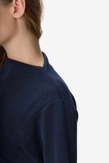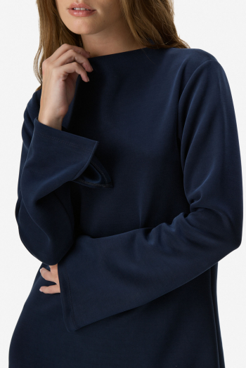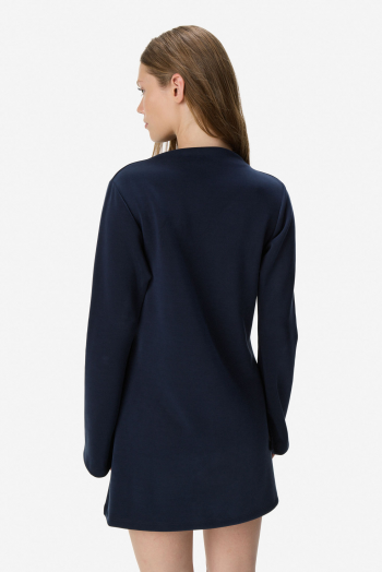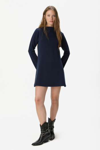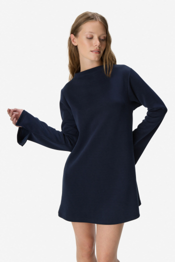 Vestido corto de silueta evasé confeccionado en punto liso de alta calidad. Presenta mangas largas y un sofisticado cuello alto tipo mock que estiliza el escote. Se encuentra totalmente forrado en su interior para asegurar una mejor estructura, suavidad al contacto con la piel y un calce impecable. 50% Poliéster 45% Rayón 5% Spandex.