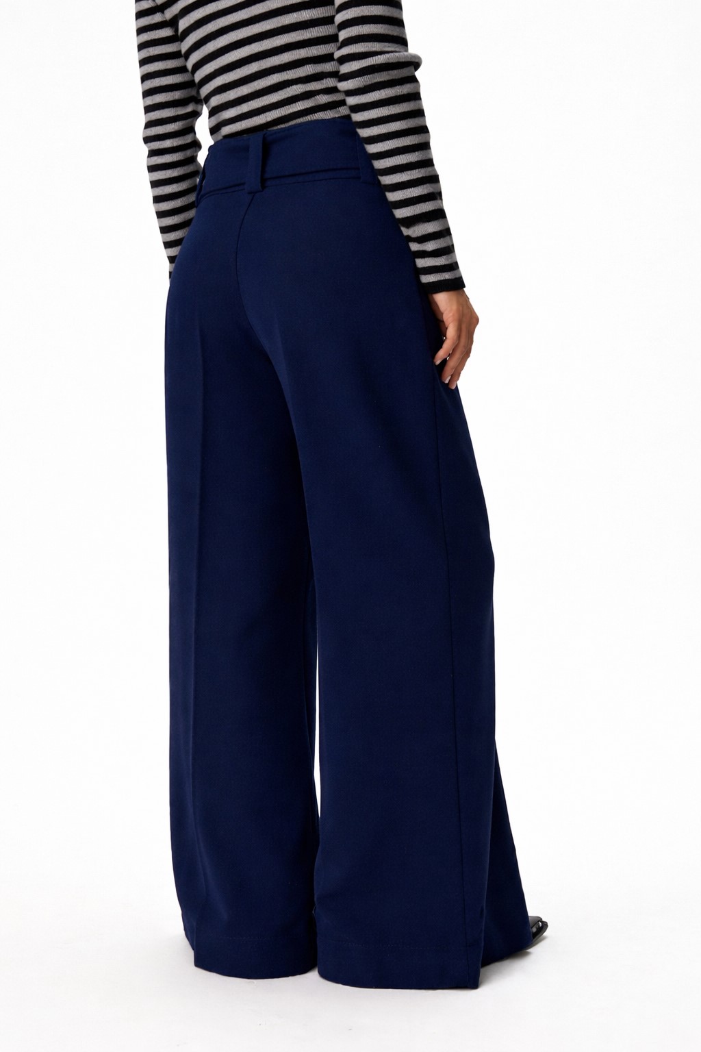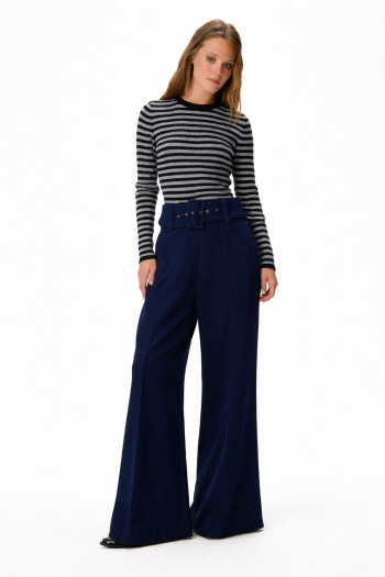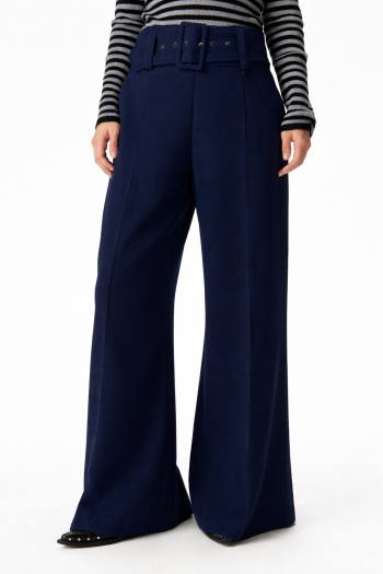 Pantalón de tiro alto con cinto y hebilla. Diseño de pierna amplia y caída fluida que estiliza la silueta, con bolsillos laterales y cintura estructurada. Incluye cinto a tono que realza el ajuste y aporta un detalle sofisticado. Ideal para looks elegantes y modernos. 63% poliéster 33% rayón 4% spandex