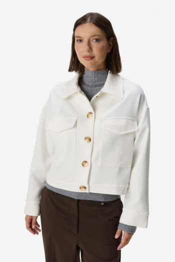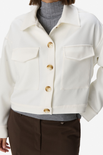Camisaco de paño, diseño minimalista de líneas limpias con botones frontales a tono dorado y bolsillos de parche en delantera. Cuello clásico y mangas largas con puño recto. Textura suave y estructurada que aporta calidez. Fit relajado y moderno. 63% Tencel 32% Rayon 5% Spandex