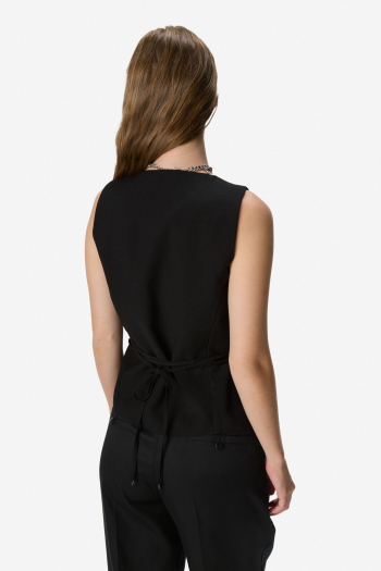 Chaleco sastrero sin mangas con escote en V y cierre frontal con botones. Presenta lazo para ajustar en la cintura que realza la silueta y aporta un toque femenino. Diseño elegante y versátil, ideal para looks formales o urbanos. 95% rayón, 15% poliéster.