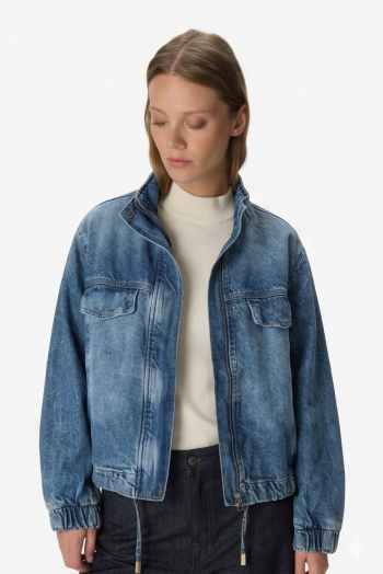 Campera bomber de jean de calce holgado y cuello subido. Presenta cierre frontal de cremallera metálica y múltiples bolsillos con solapa y broches. Diseño atemporal y versátil con terminaciones elásticas y lazos ajustables en la cintura, ideal para looks urbanos de alto impacto. 100% Algodón