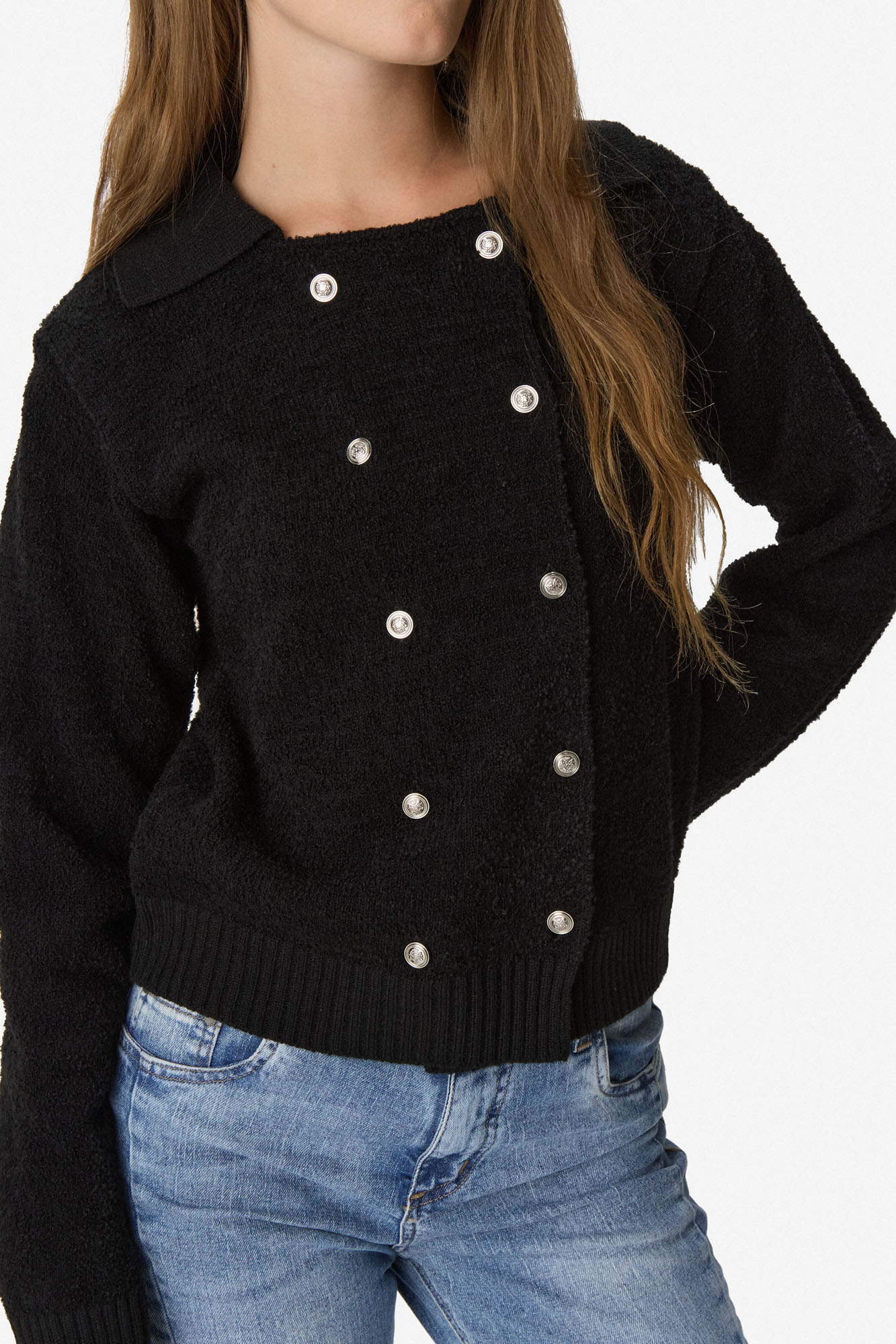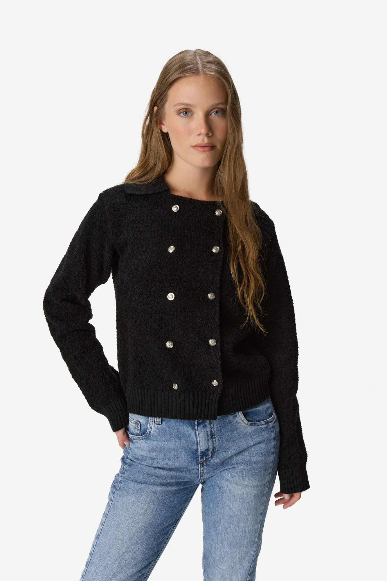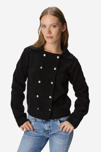 Cardigan tejido de manga larga en mezcla de poliéster y acrílico. Calce regular, cómodo y versátil para el uso diario. Diseño con cuello redondo y cierre frontal con botones metálicos que aportan un detalle moderno y elegante. Terminaciones acanaladas en puños y ruedo que mejoran el ajuste. 50% Poliéster 50% Acrílico.