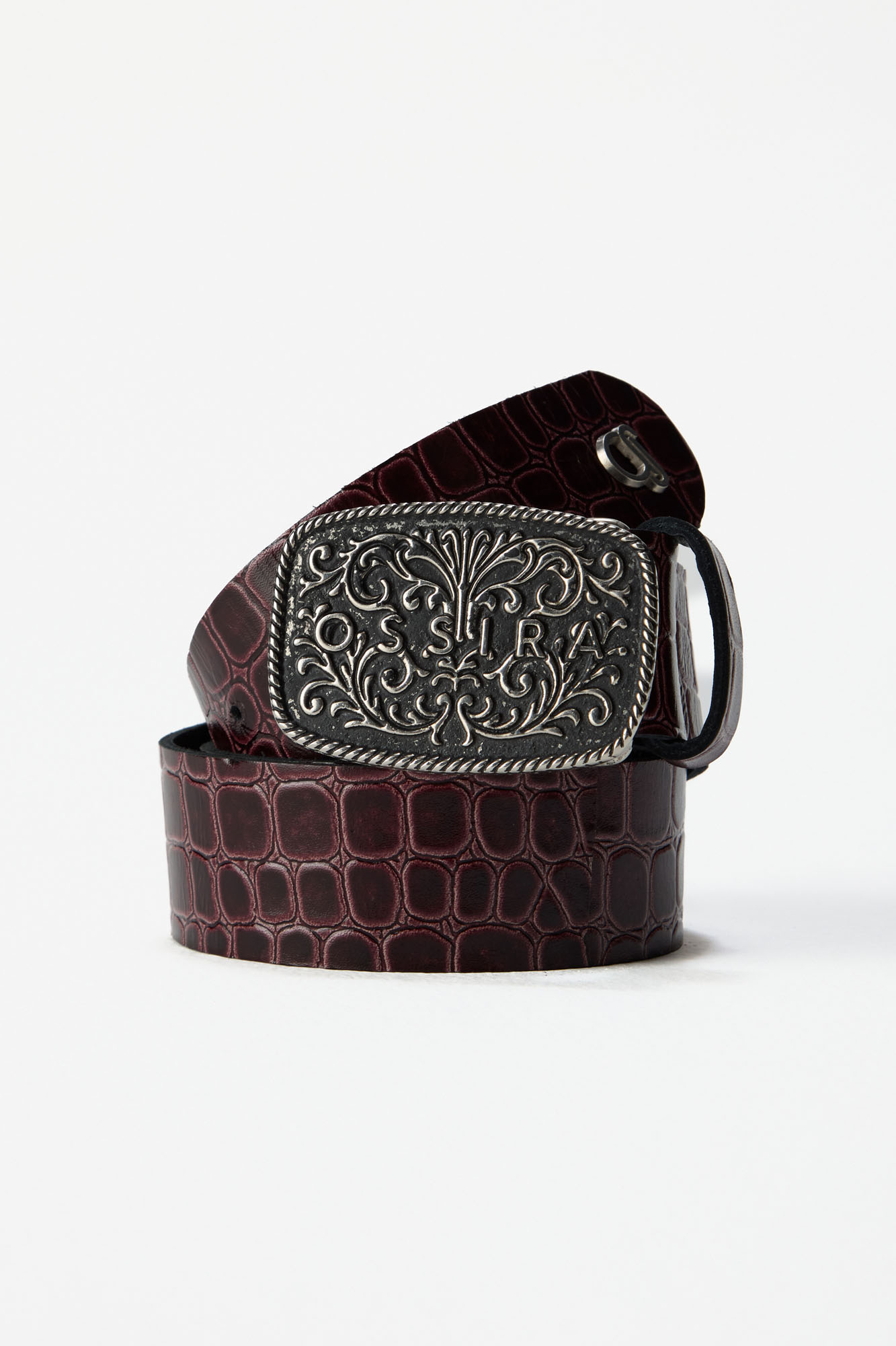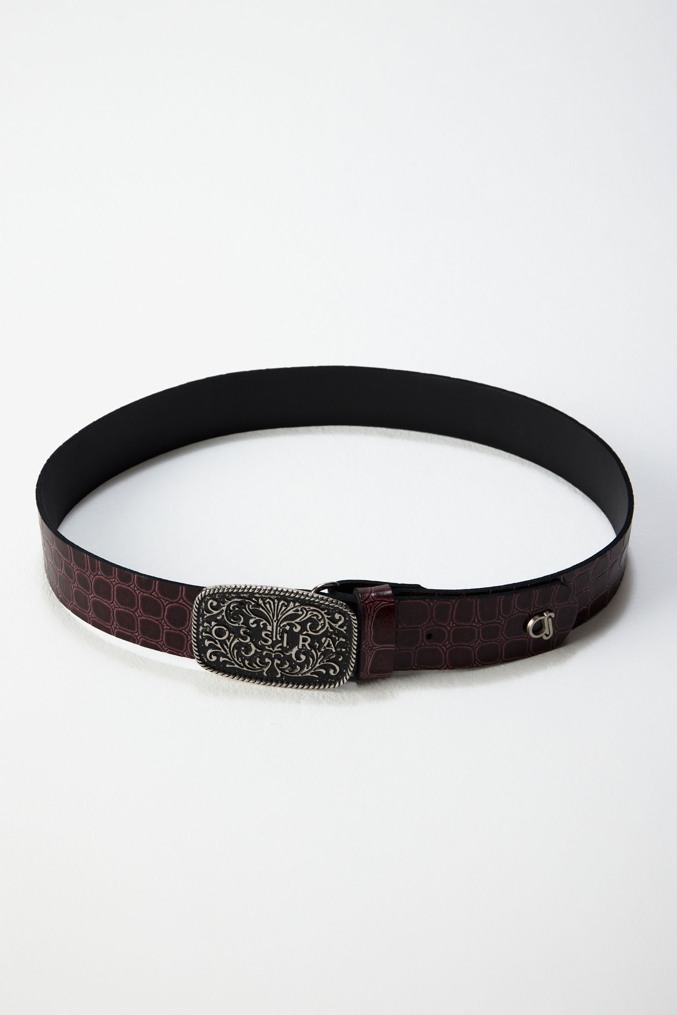 Cinturón con textura tipo reptil, de acabado brillante y diseño elegante. Hebilla metálica con grabado ornamental en relieve. Ajuste clásico con pasador. Material símil cuero vacuno y metal.