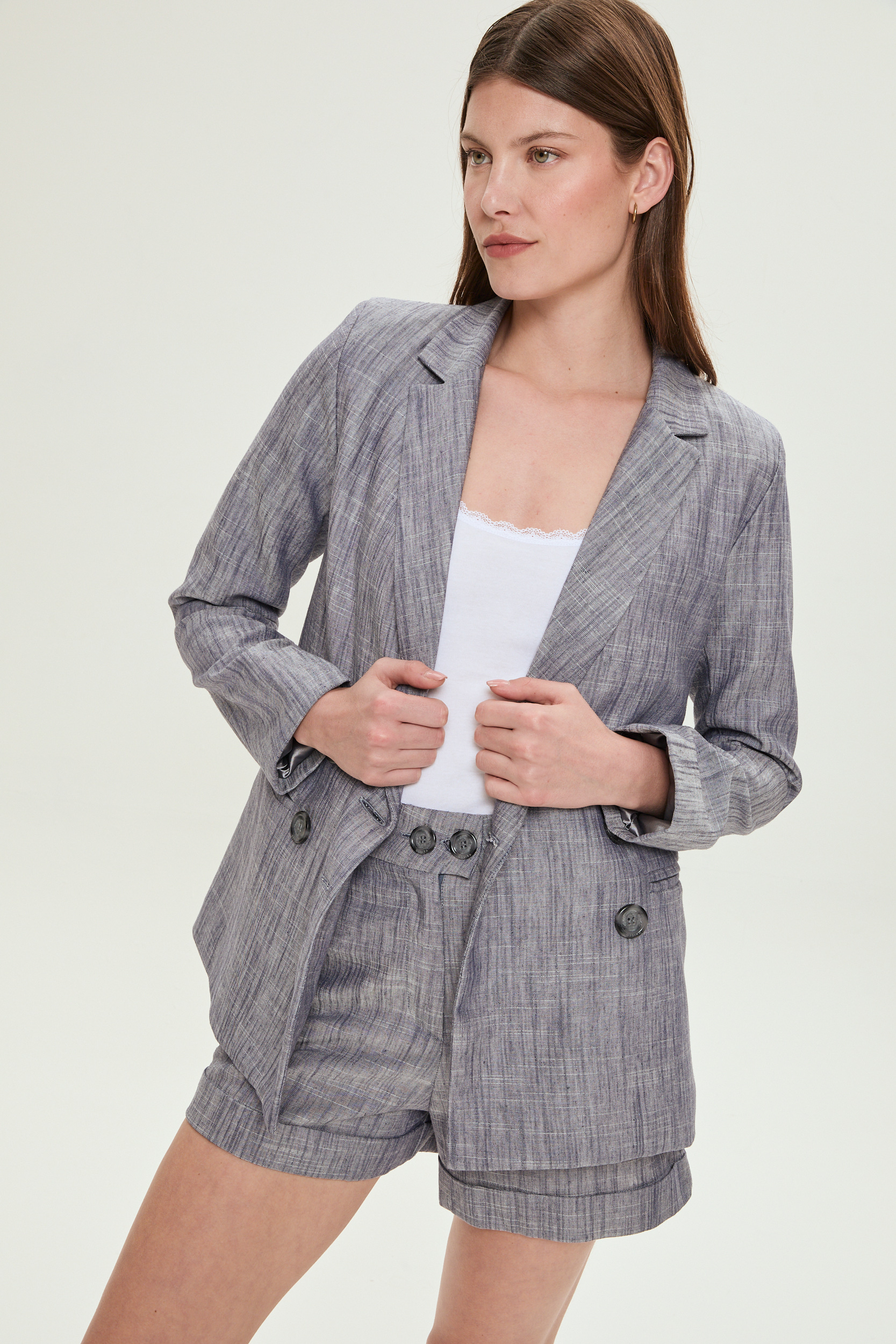 Confeccionado en lino fresco y ligero, perfecto para días cálidos. Diseño clásico con botones frontales que añaden un toque elegante. Ideal para looks formales o casuales.