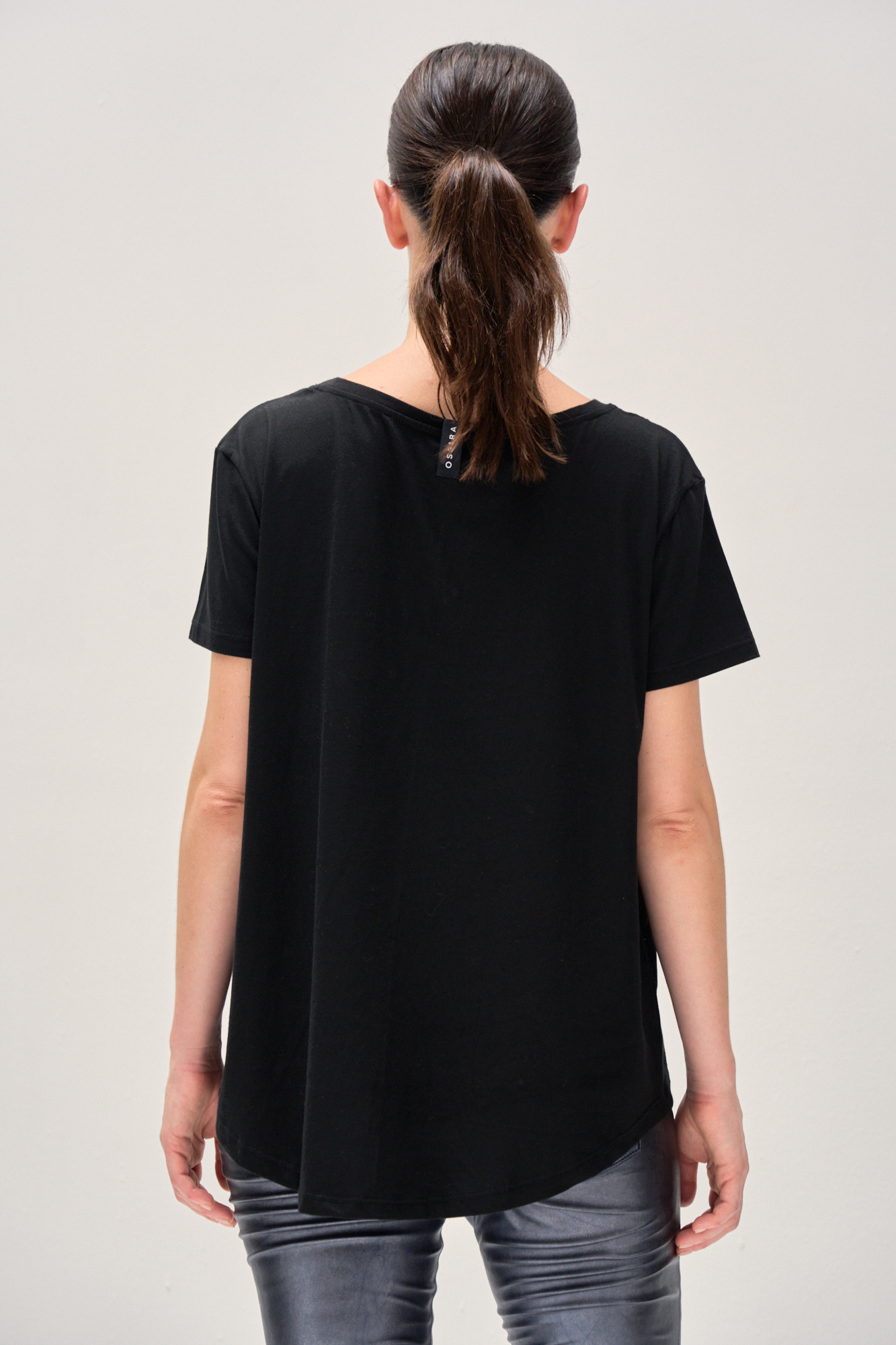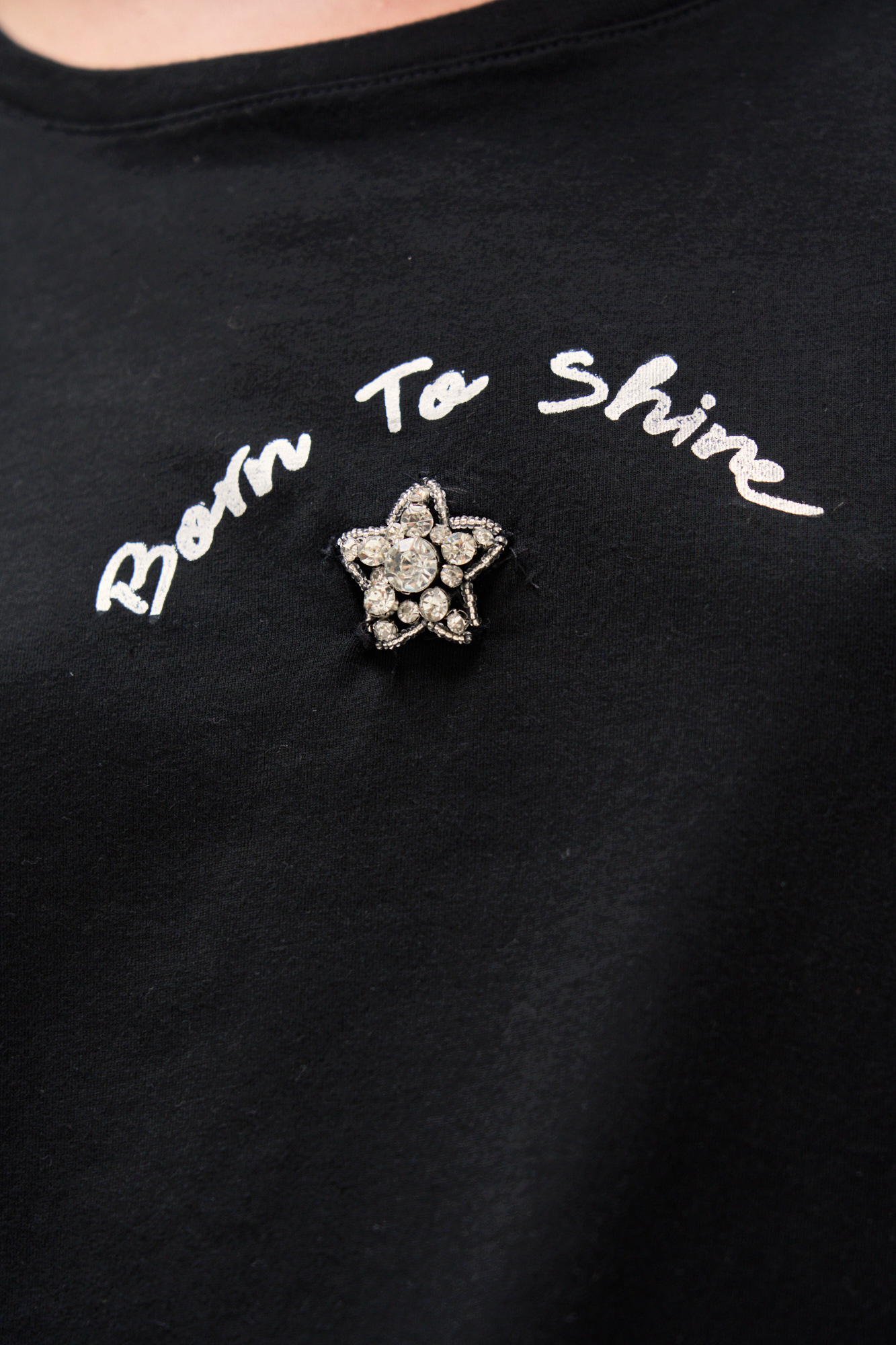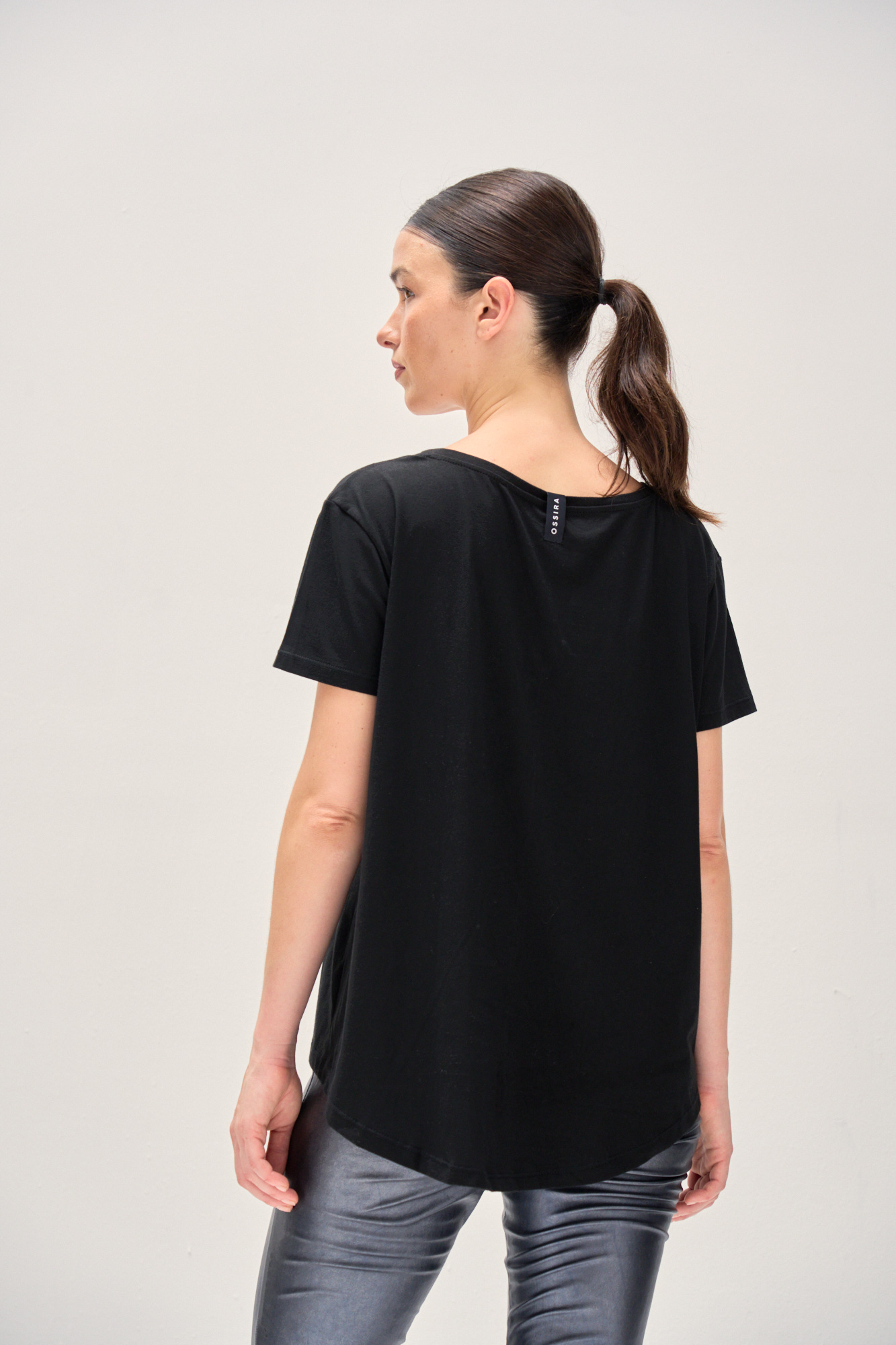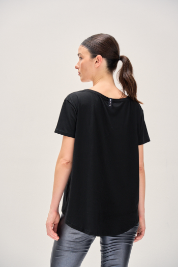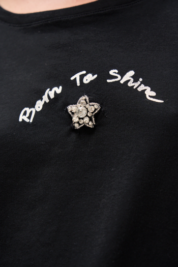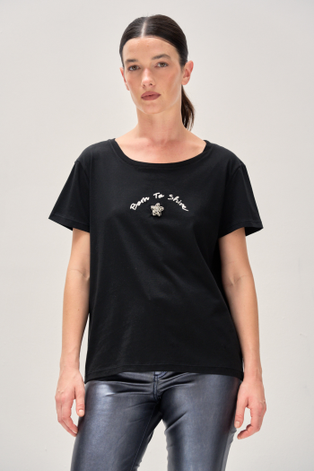 REMERA CON ESTAMPA DE FOIL Y ALIQUE CON STRASS.