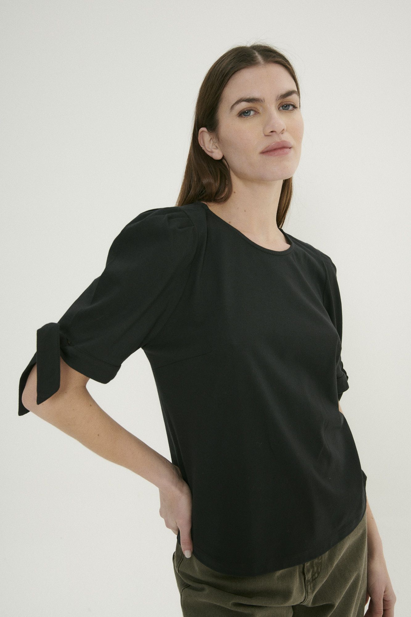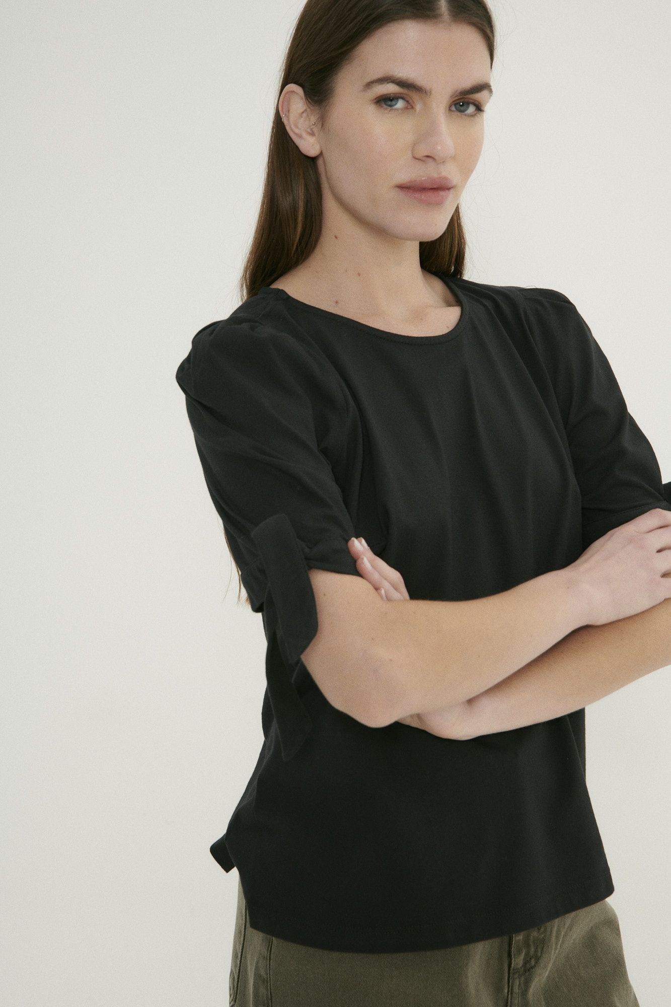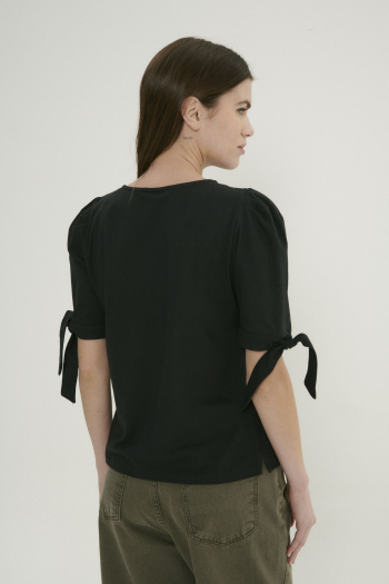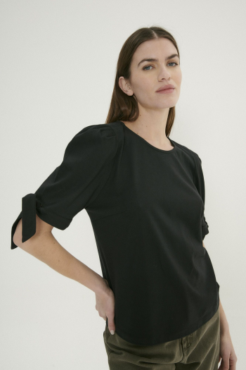 Remera con mangas princesa y un delicado lazo, perfecta para un look romántico y femenino.