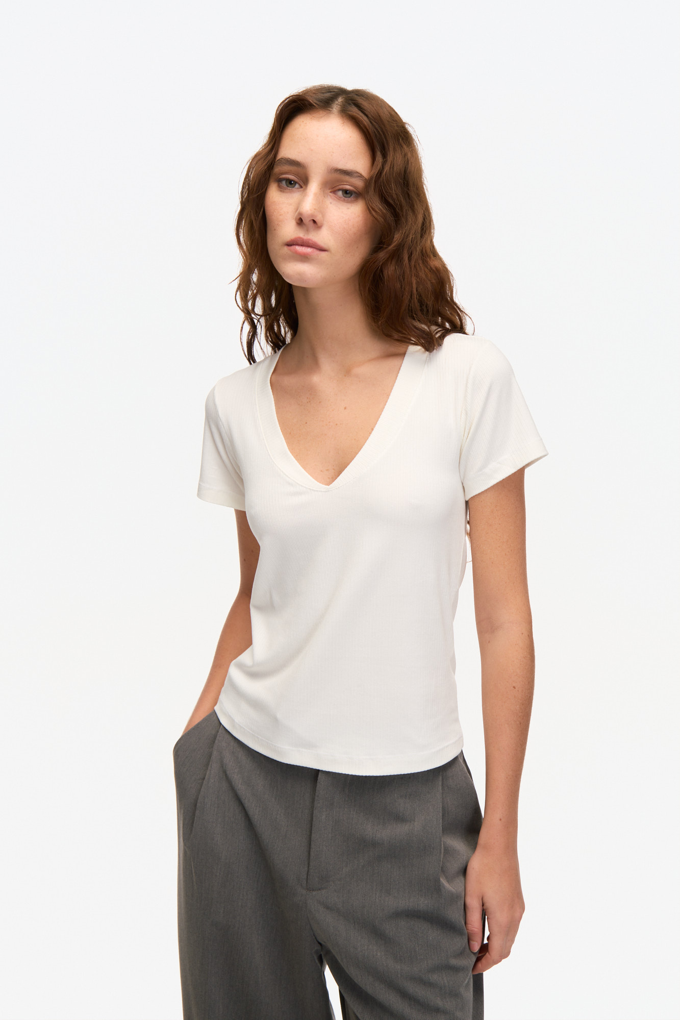 CONFECCIONADA EN TEJIDO MORLEY DE RAYÓN CON SPANDEX, SUAVE Y ELÁSTICO. DISEÑO DE MANGAS CORTAS, ESCOTE EN “V” Y SILUETA AL CUERPO CON LARGO A LA CADERA.