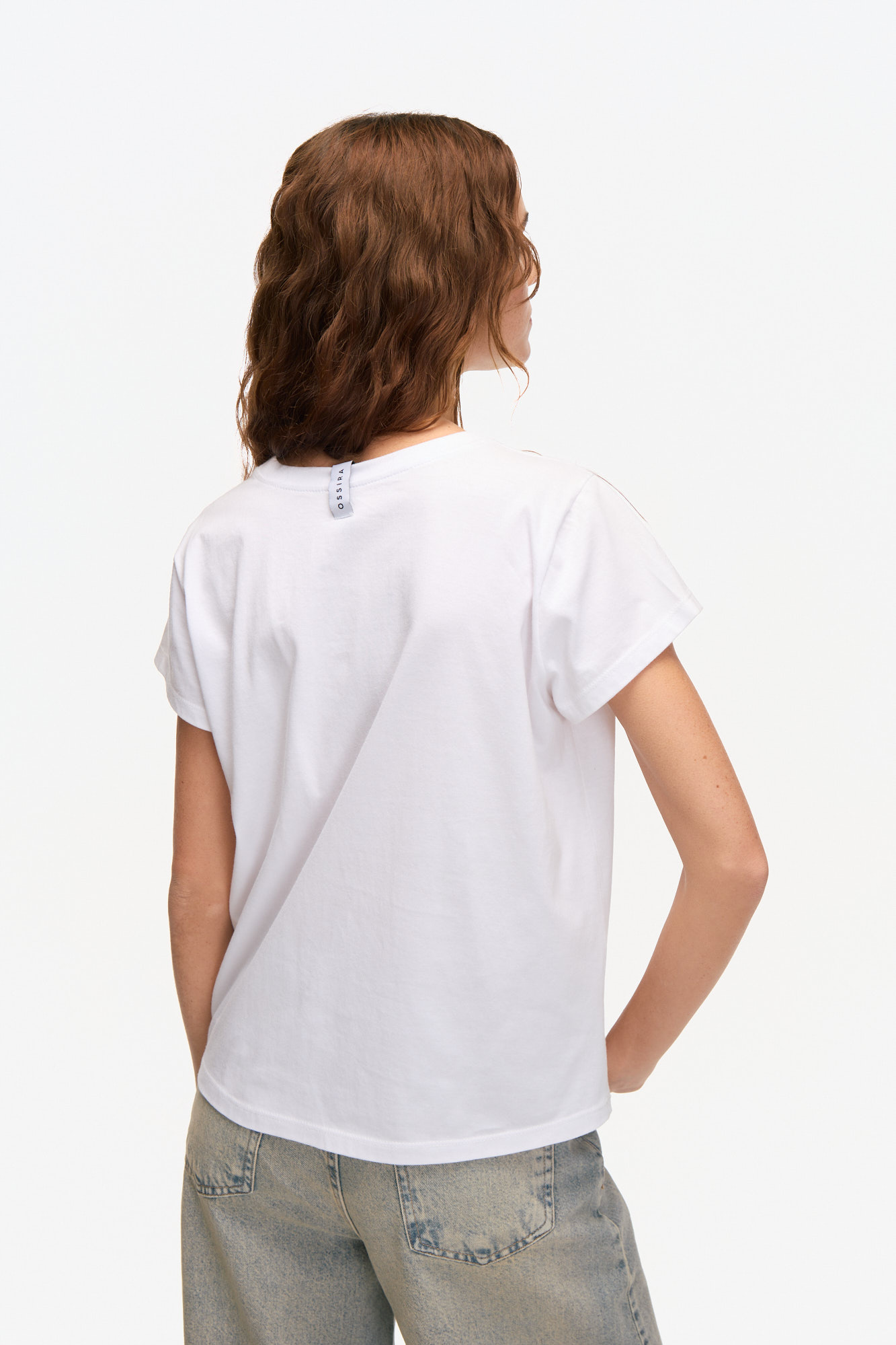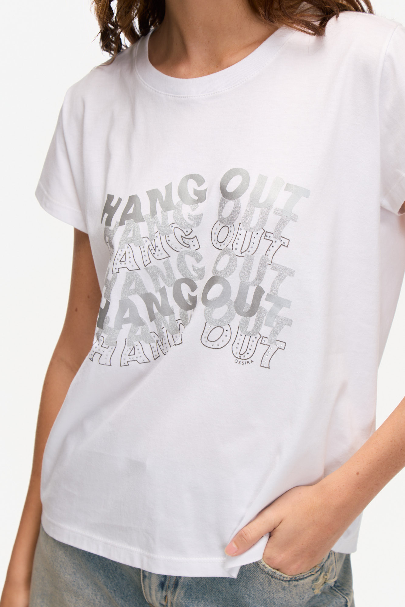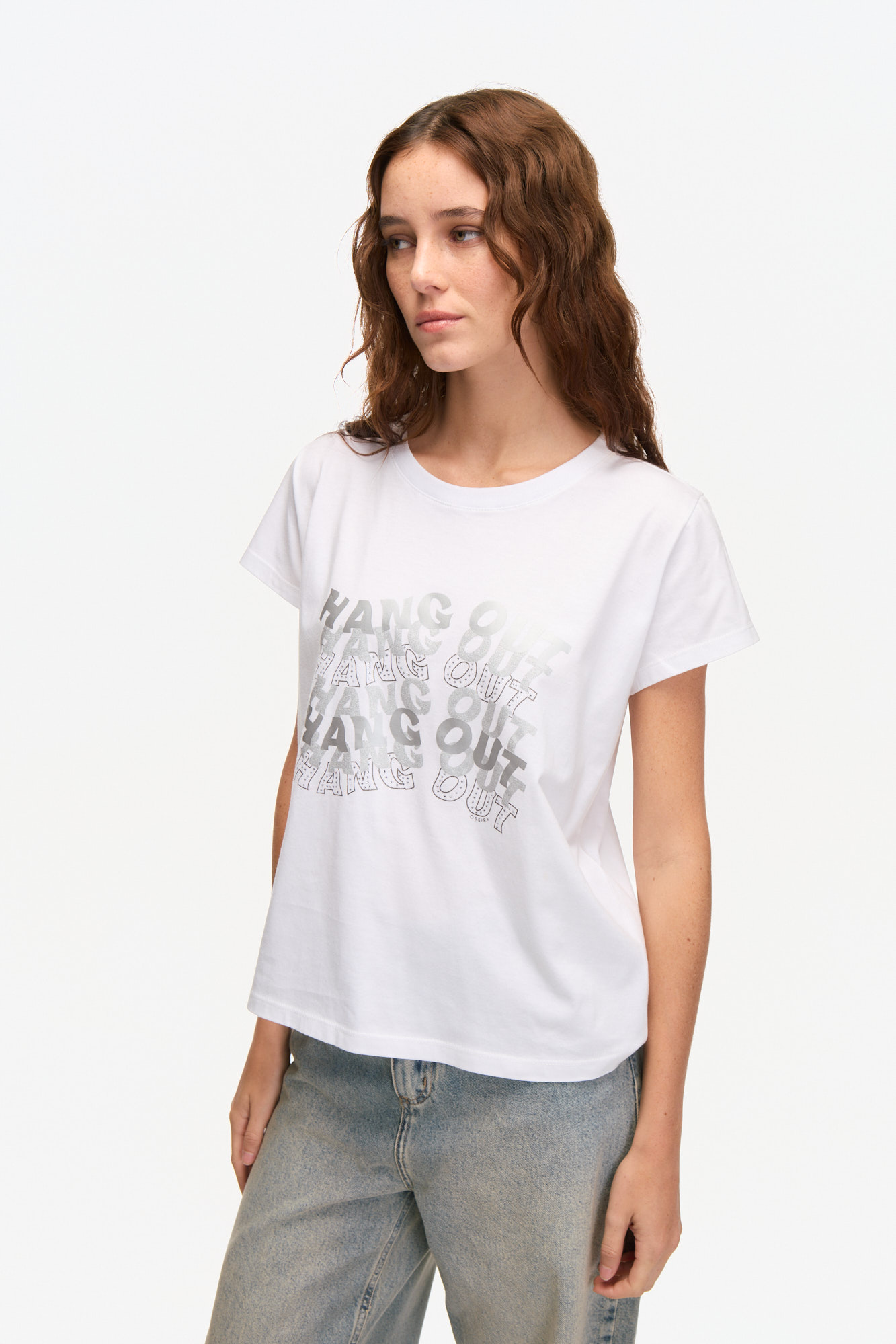 REMERA DE ALGODÓN CON ESTAMPA. CUELLO REDONDO CLÁSICO. MANGA CORTA Y SILUETA RELAJADA. GRÁFICO “HANG OUT” EN TONOS SUAVES.