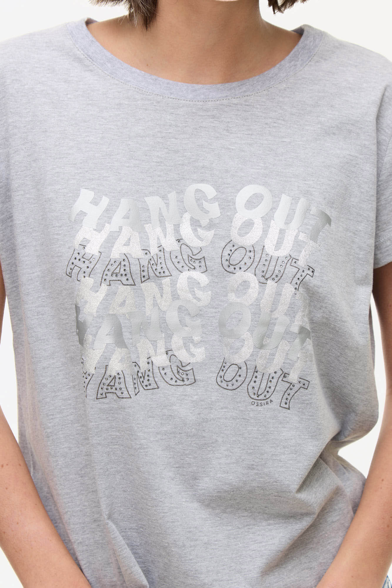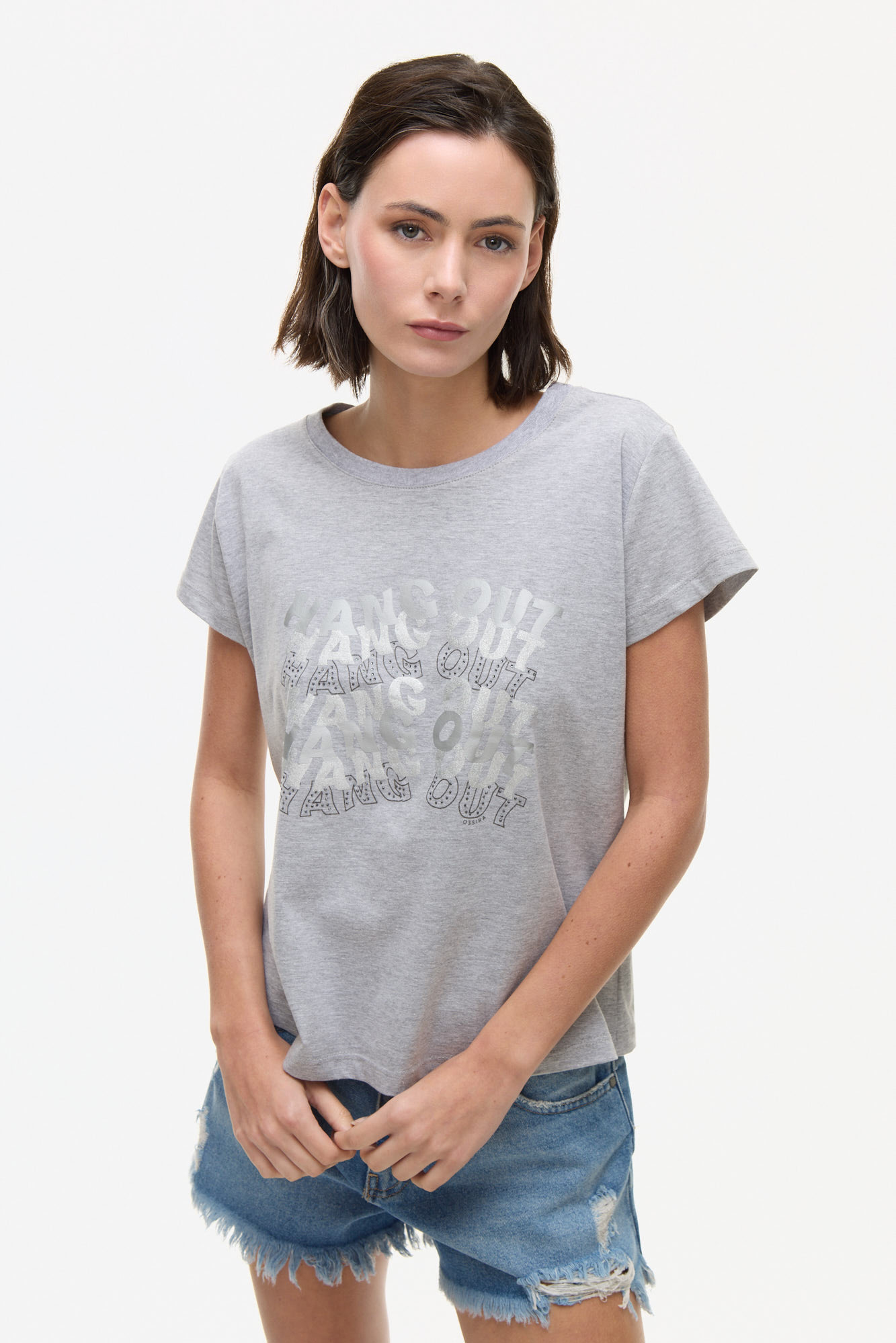 REMERA DE ALGODÓN CON ESTAMPA. CUELLO REDONDO CLÁSICO. MANGA CORTA Y SILUETA RELAJADA. GRÁFICO “HANG OUT” EN TONOS SUAVES. 100% ALGODÓN.