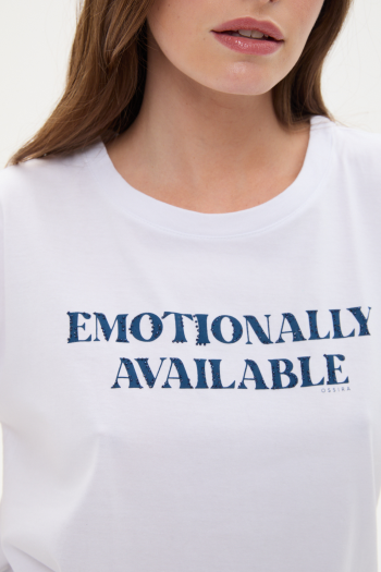 REMERA DE JERSEY CON CORTE CLÁSICO Y CUELLO REDONDO. ESTAMPA FRONTAL CON APLIQUE HOTFIX EN TONO AZUL QUE APORTA BRILLO Y PROTAGONISMO. MANGA CORTA Y CALCE RELAJADO, IDEAL PARA COMPLETAR LOOKS CASUALES.