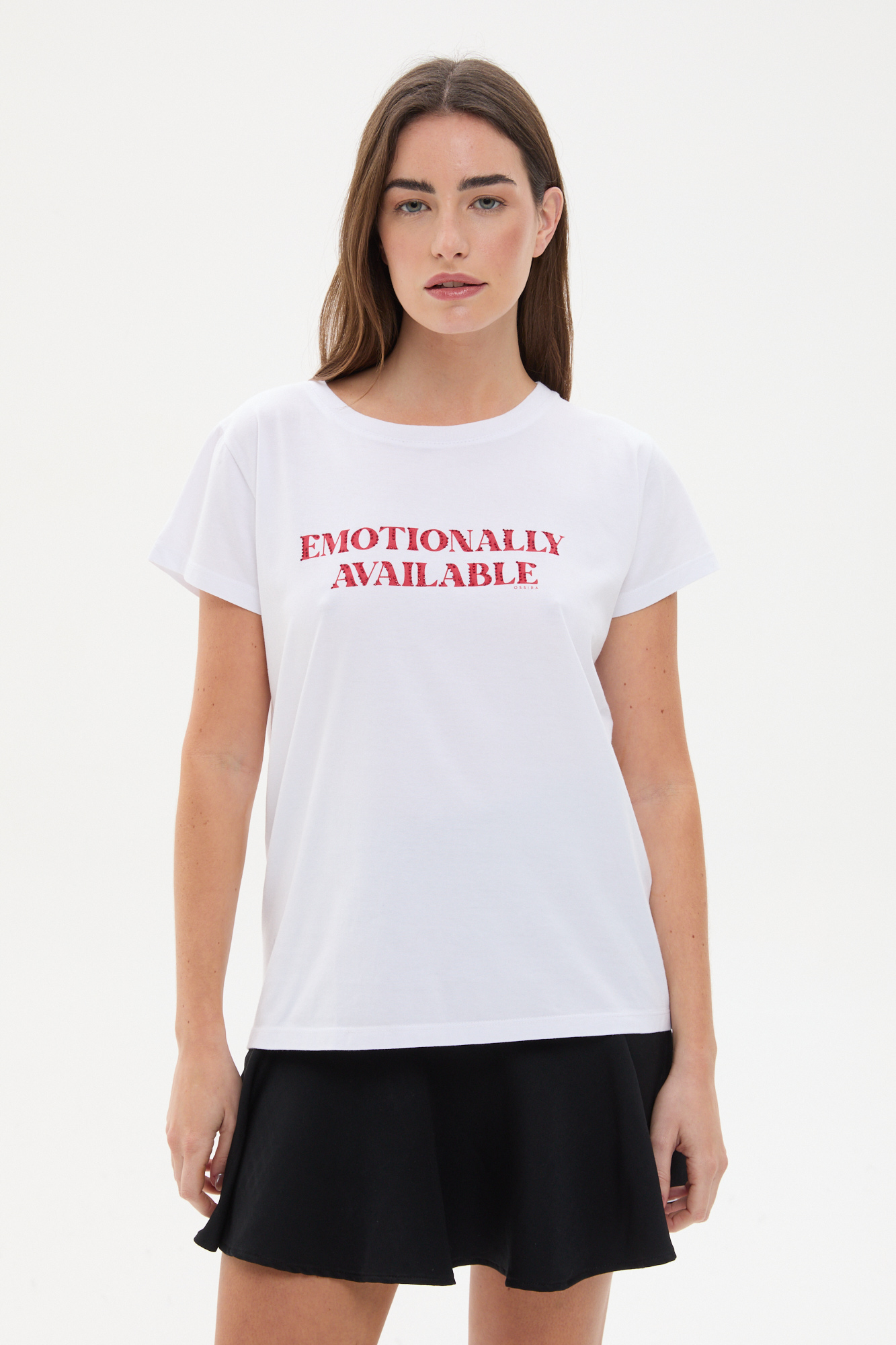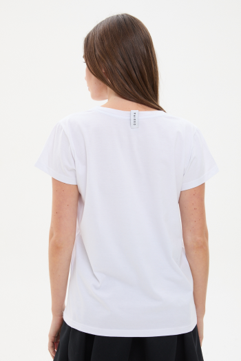 REMERA DE JERSEY CON CORTE CLÁSICO Y CUELLO REDONDO. ESTAMPA FRONTAL CON APLIQUE HOTFIX EN TONO AZUL QUE APORTA BRILLO Y PROTAGONISMO. MANGA CORTA Y CALCE RELAJADO, IDEAL PARA COMPLETAR LOOKS CASUALES.100% ALGODÓN