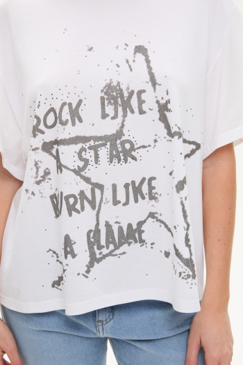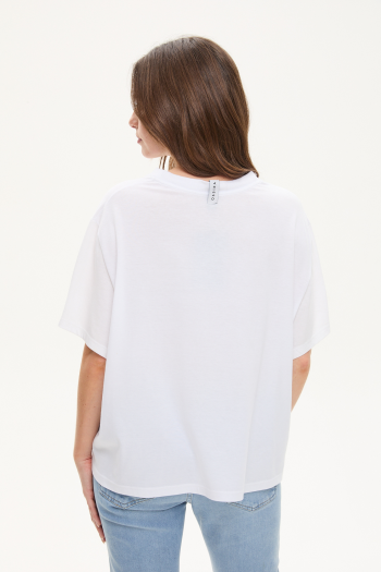 REMERA DE JERSEY DE ALGODÓN CON ESTAMPA AL FRENTE. DISEÑO DE CALCE HOLGADO, MANGAS CORTAS Y CUELLO REDONDO. LARGO A LA CADERA.100% ALGODÓN.