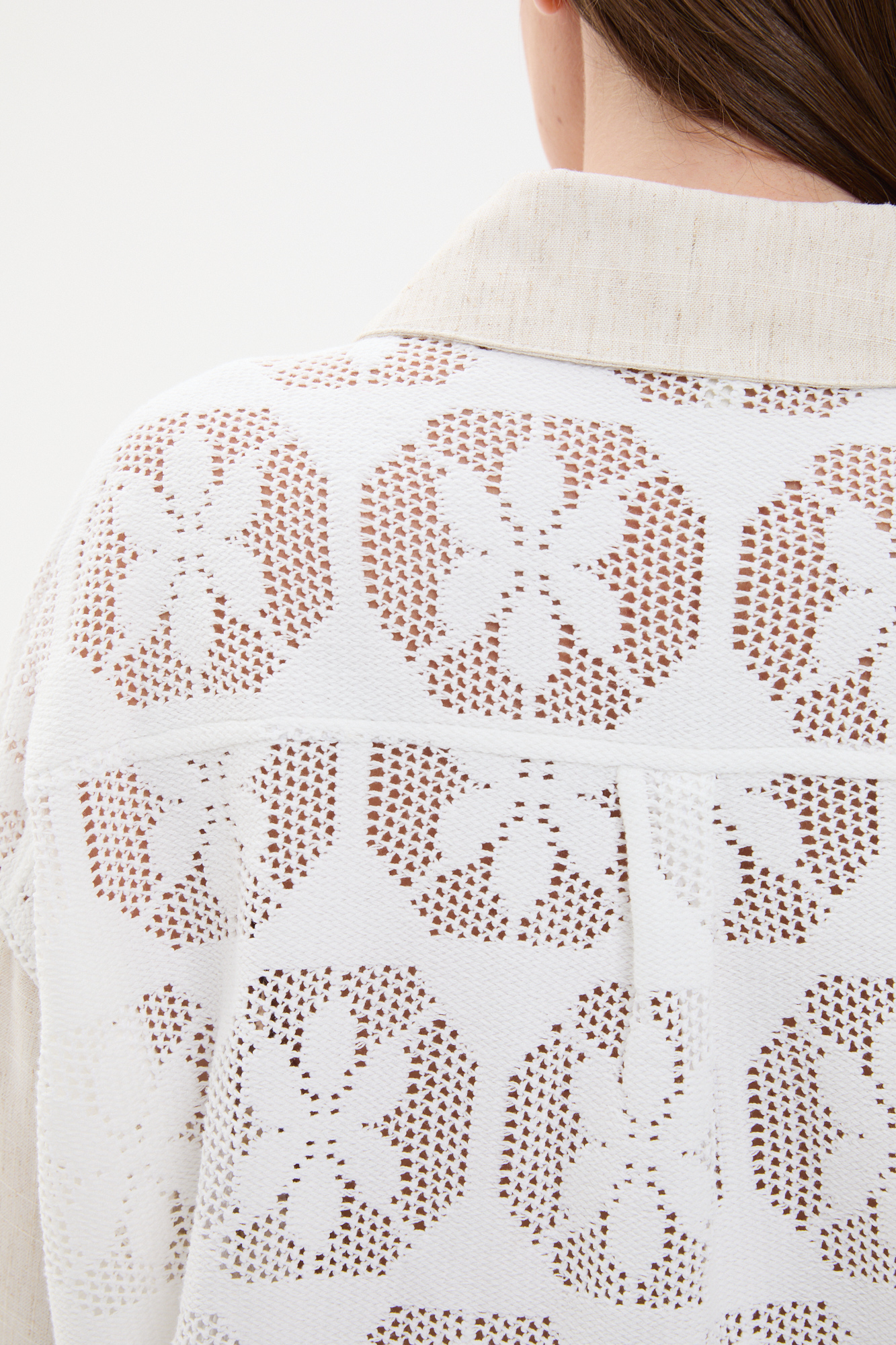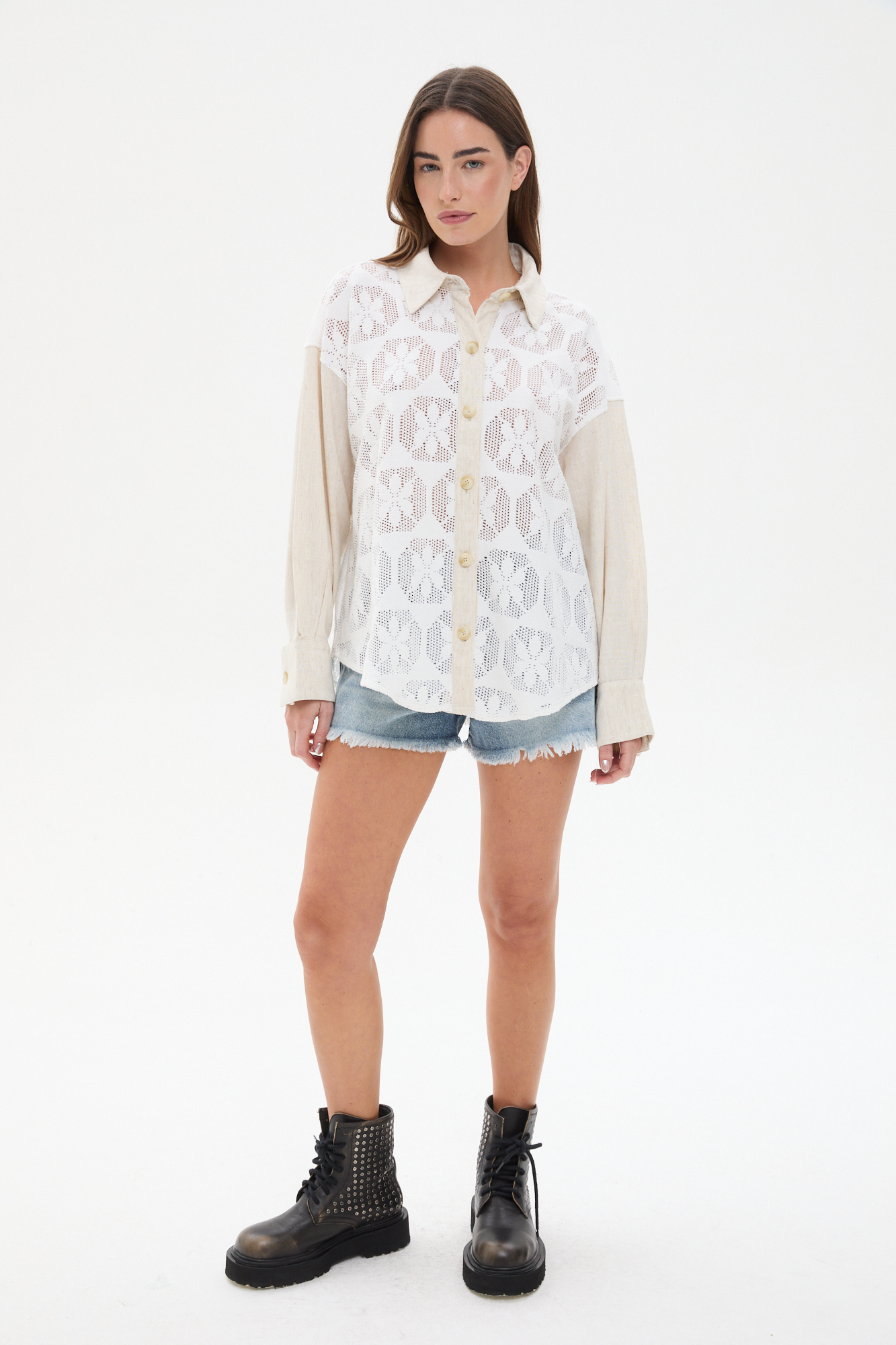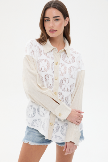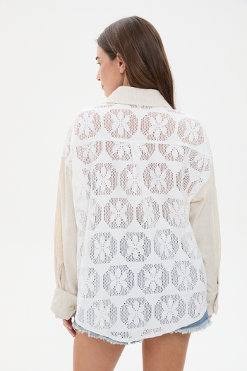 CAMISA COMBINADA EN GUIPURE Y TELA TIPO LINO. CORTE CLÁSICO CON CUELLO Y MANGA LARGA. DELANTERO Y ESPALDA EN ENCAJE GUIPURE CON TRANSPARENCIA. CARTERA CON BOTONES CAREY A TONO.