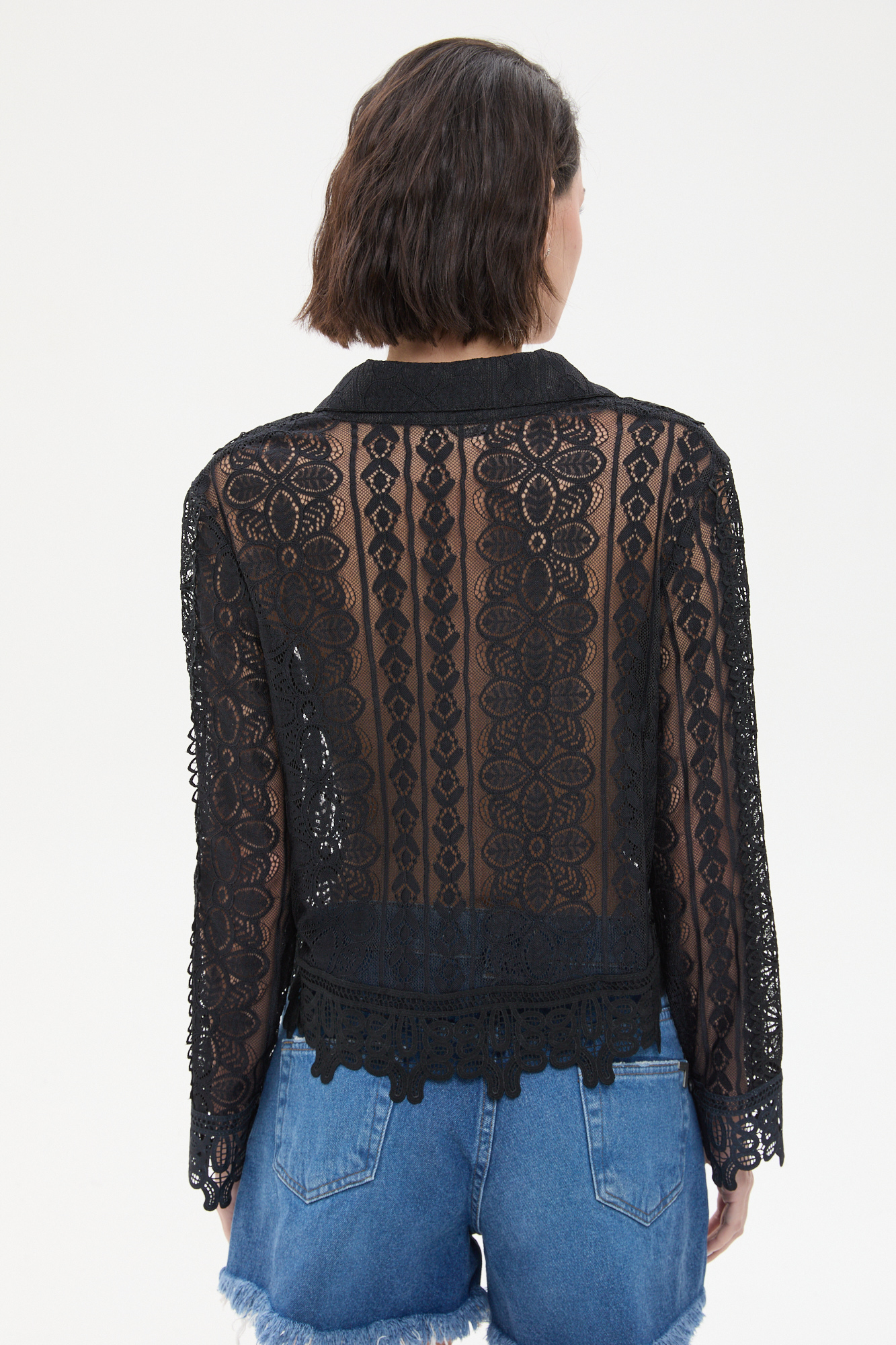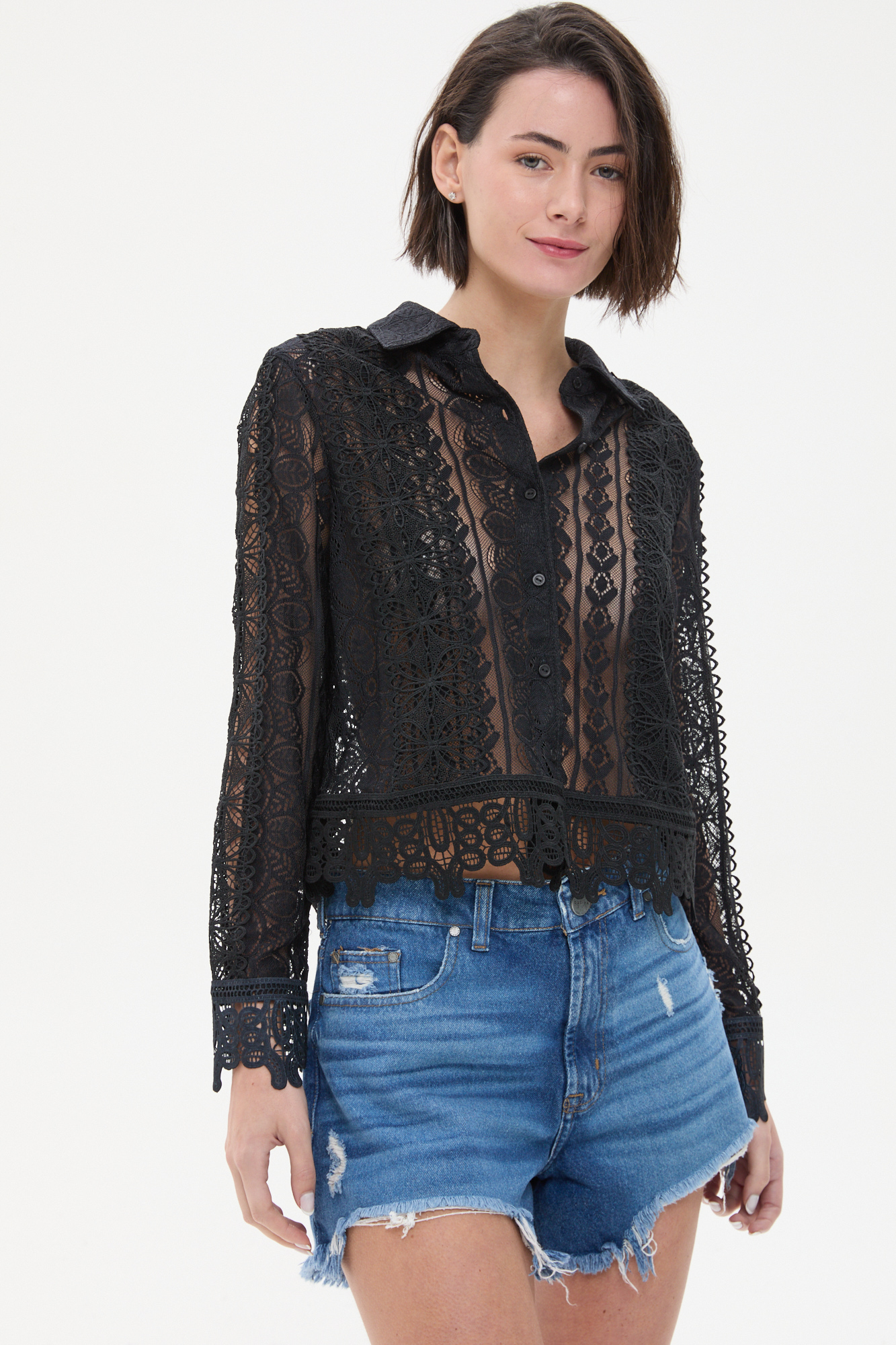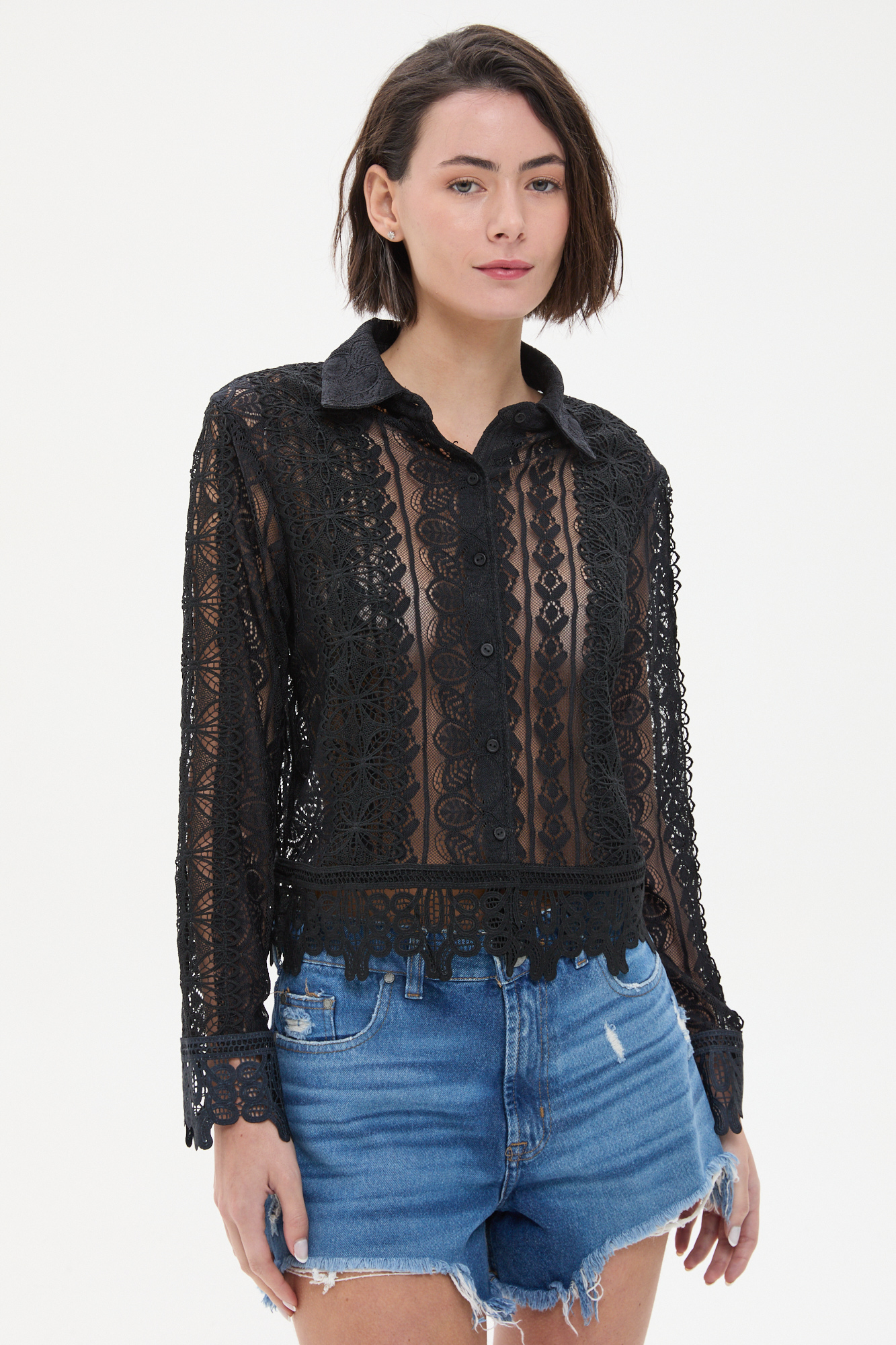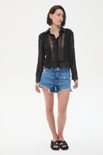 CAMISA OSSIRA CON ENCAJE. COMBINADO CON PUNTILLAS A TONO. POSEE BOTONES EN EL DELANTERO Y CUELLO A LA BASE.100% POLIESTER