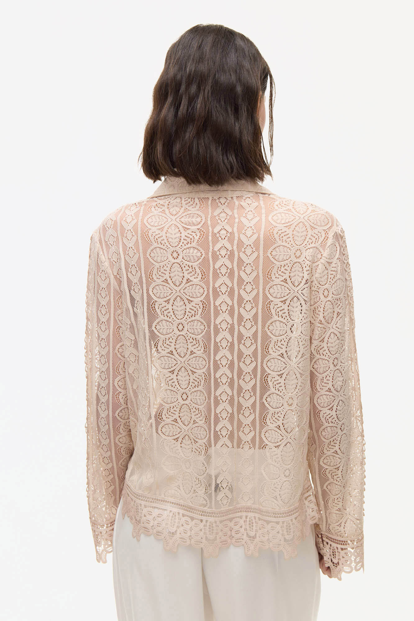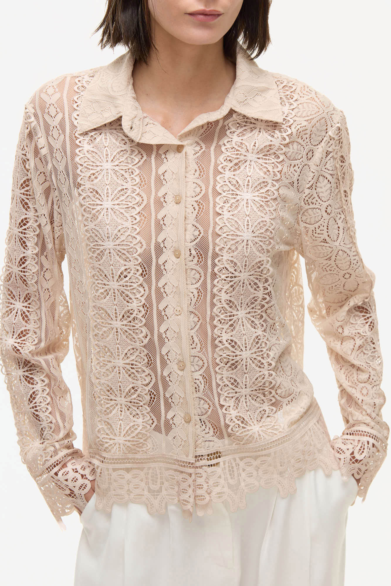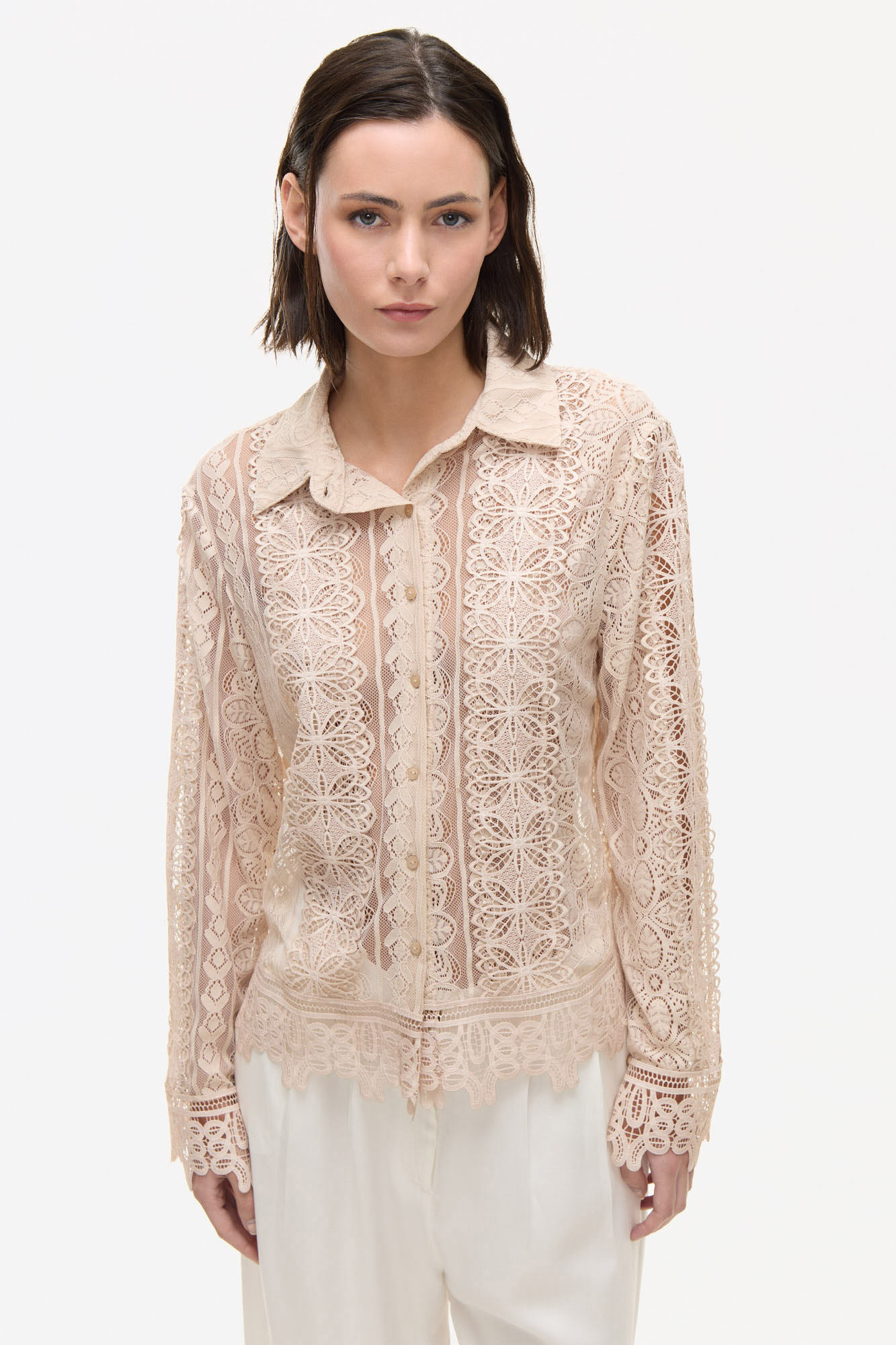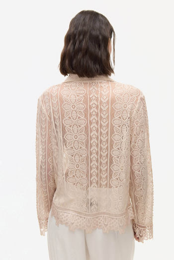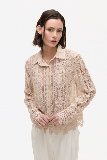 CAMISA OSSIRA CON ENCAJE. COMBINADO CON PUNTILLAS A TONO. POSEE BOTONES EN EL DELANTERO Y CUELLO A LA BASE.100% POLIESTER