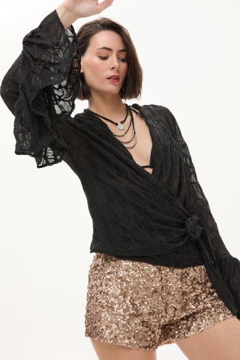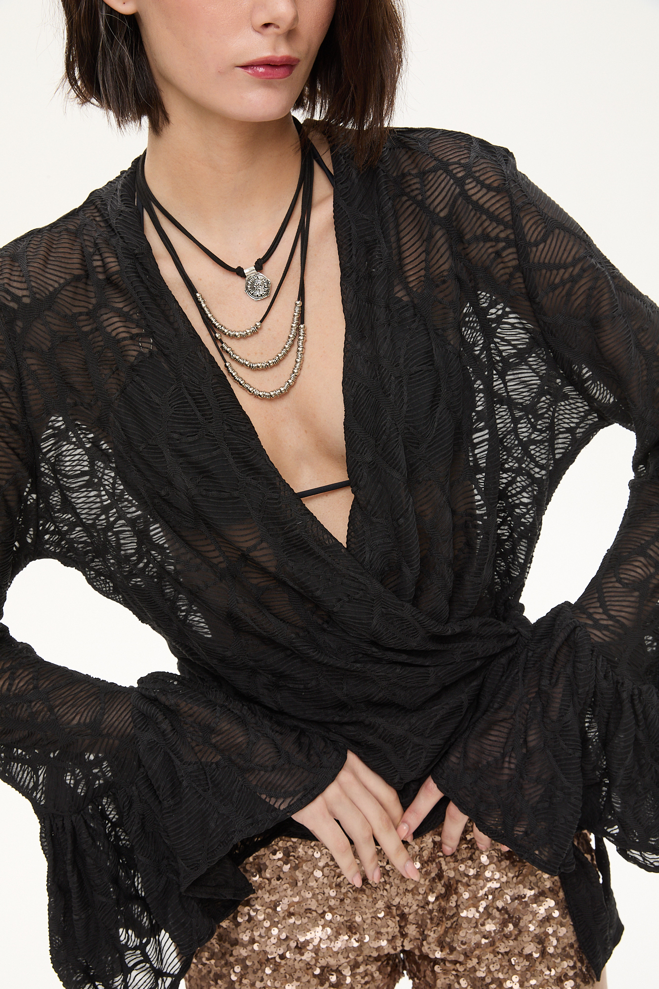 BLUSA DE GASA BORDADA. ESCOTE EN V CRUZADO. MANGA LARGA CON VOLADO EN PUÑO. TERMINACIÓN CON DETALLE DE ENCAJE. TEJIDO SEMITRANSPARENTE Y LIVIANO. 95% POLIÉSTER - 5% SPANDEX.