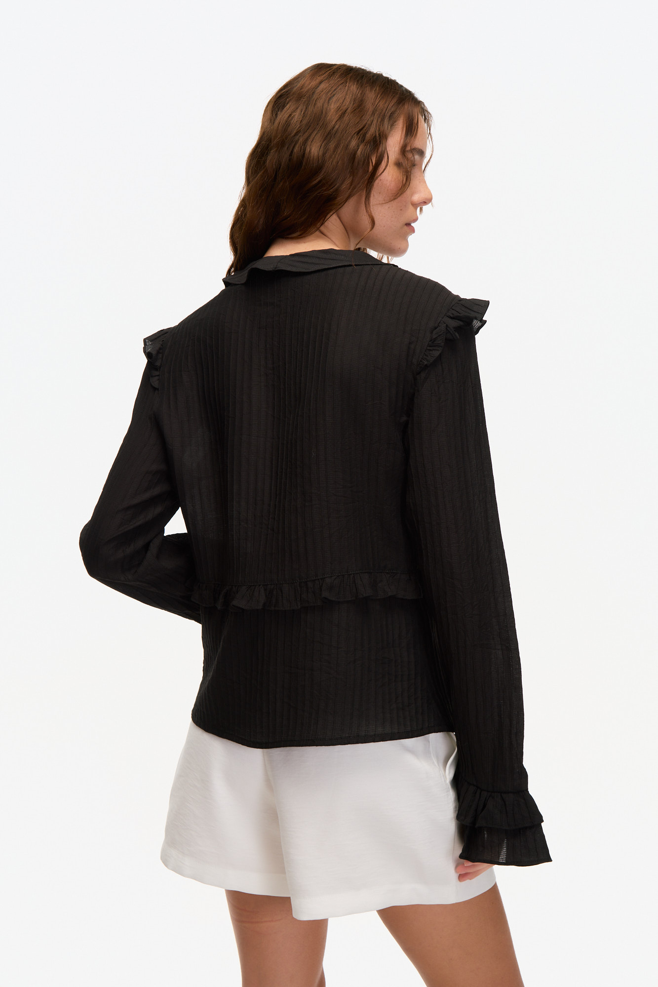 CONFECCIONADA EN TEJIDO LIVIANO CON TEXTURA LEVE. DISEÑO CON ESCOTE PROFUNDO EN V Y VOLADOS EN HOMBROS, PUÑOS Y CONTORNO. MANGA LARGA, CALCE SUELTO Y TERMINACIONES DELICADAS. 75% RAYÓN – 25% NYLON.