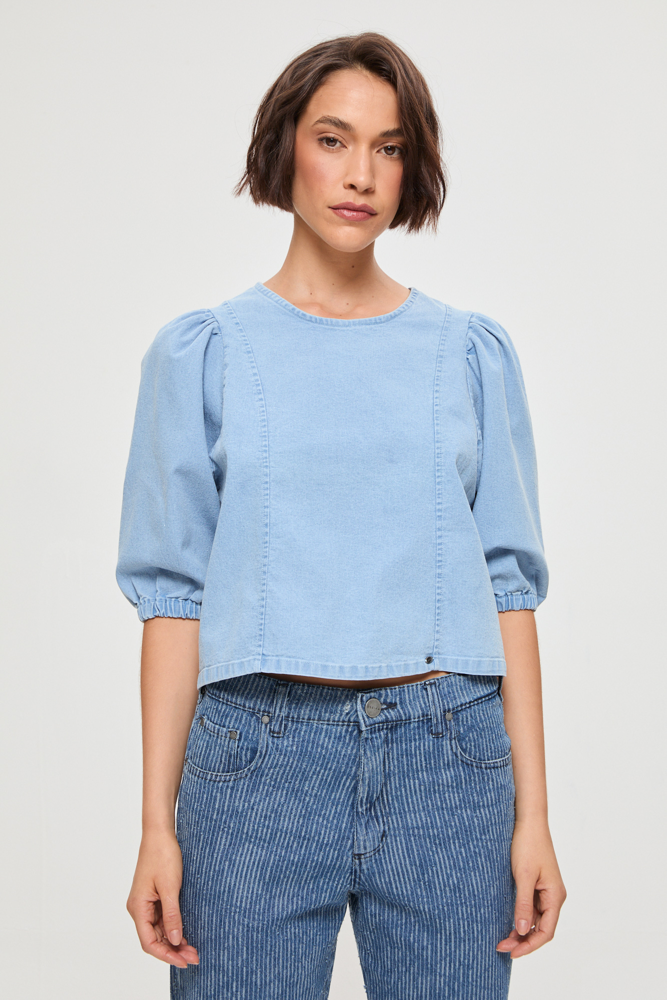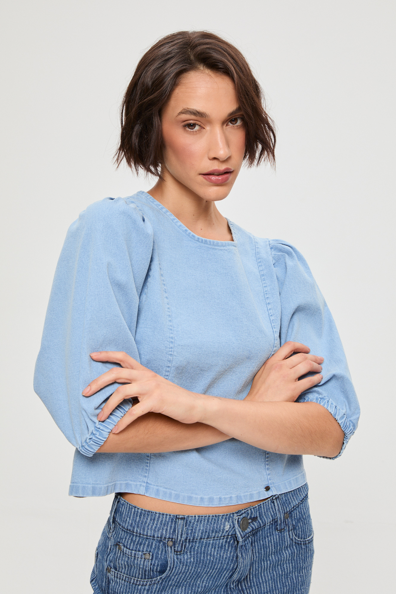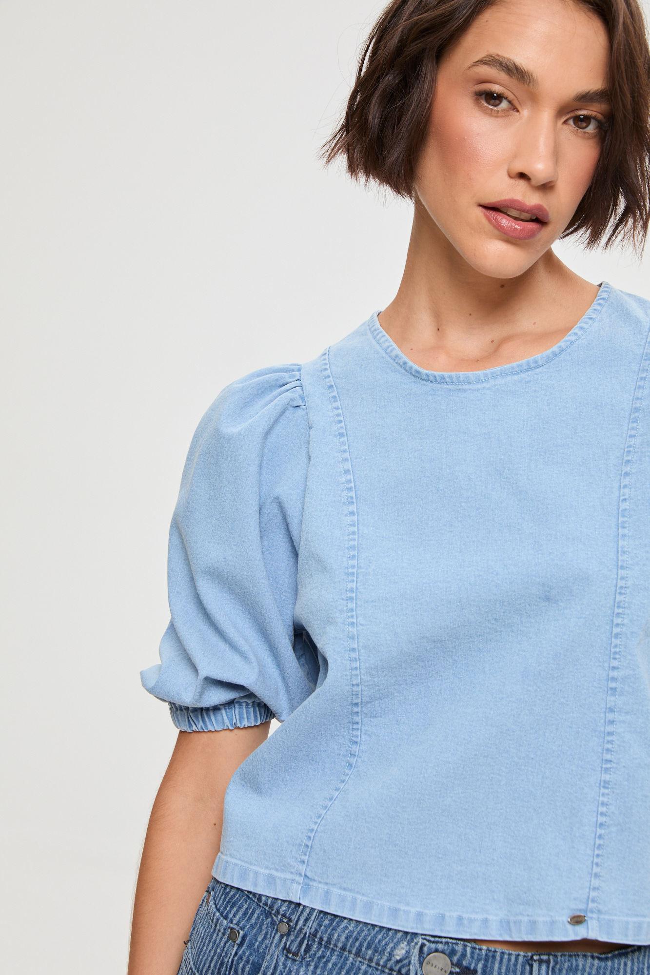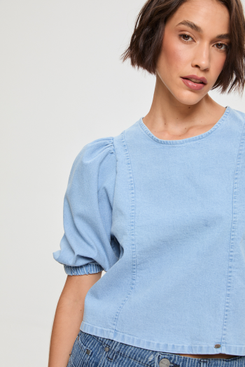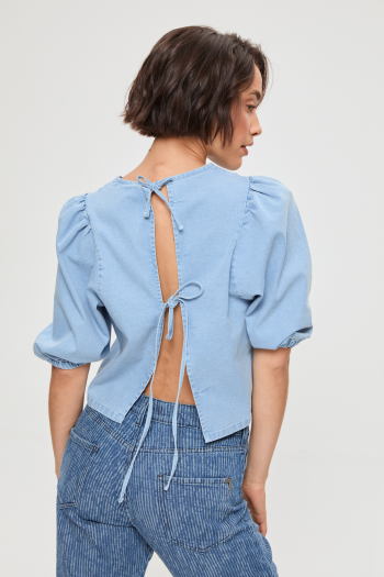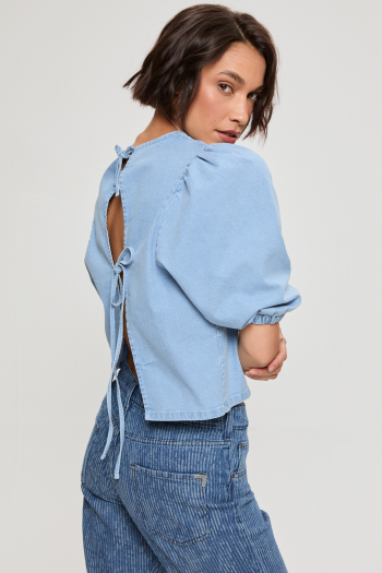BLUSA DENIM MANGA PRINCESA CON TIRAS LAVADO