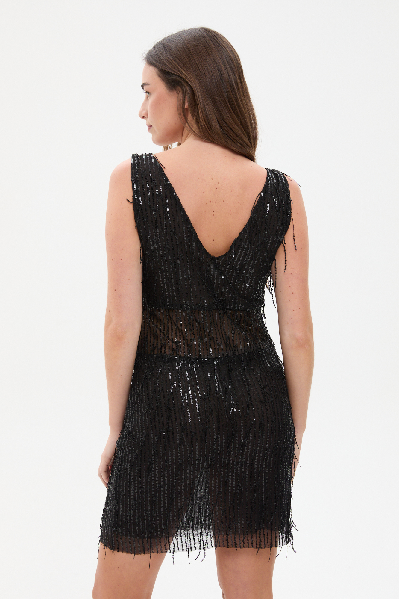 VESTIDO CORTO DE LENTEJUELAS CON FLECOS NEGRO