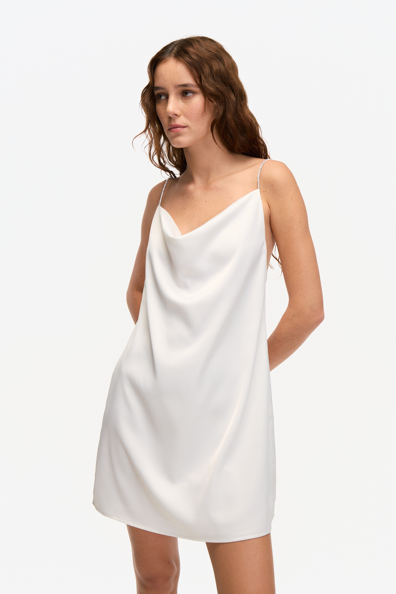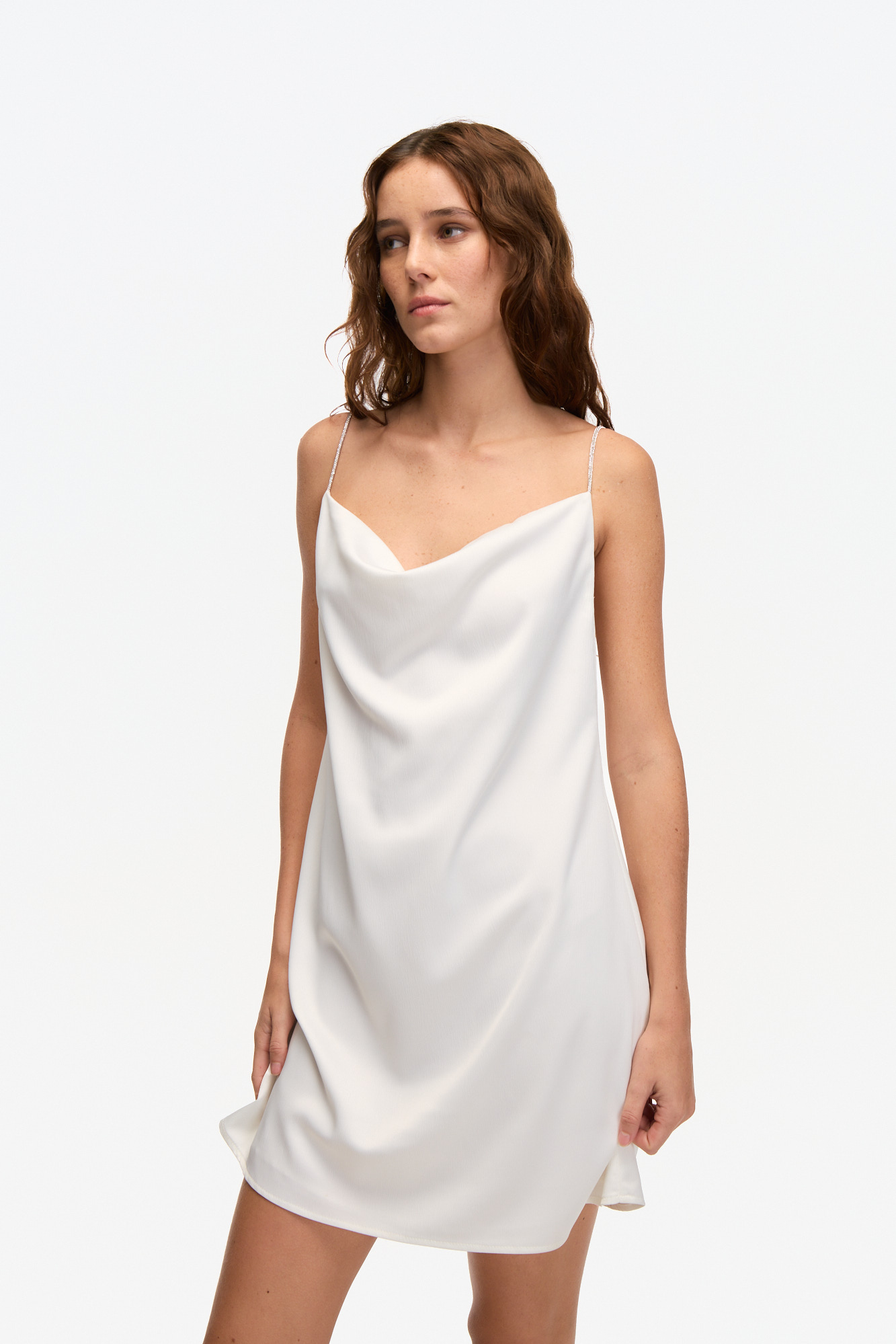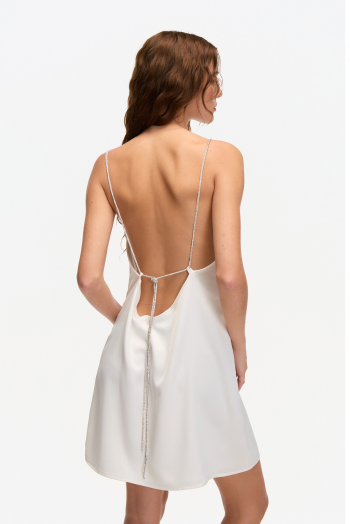 VESTIDO CORTO CONFECCIONADO EN TEJIDO TIPO SEDITA CON CAÍDA SUAVE. ESCOTE EN V Y ESPALDA DESCUBIERTA CON BRETELES FINOS DE STRASS CRUZADOS. CALCE RELAJADO Y LARGO MINI. 100% POLIÉSTER.LAS PRENDAS DE FIESTA NO TIENEN CAMBIO.