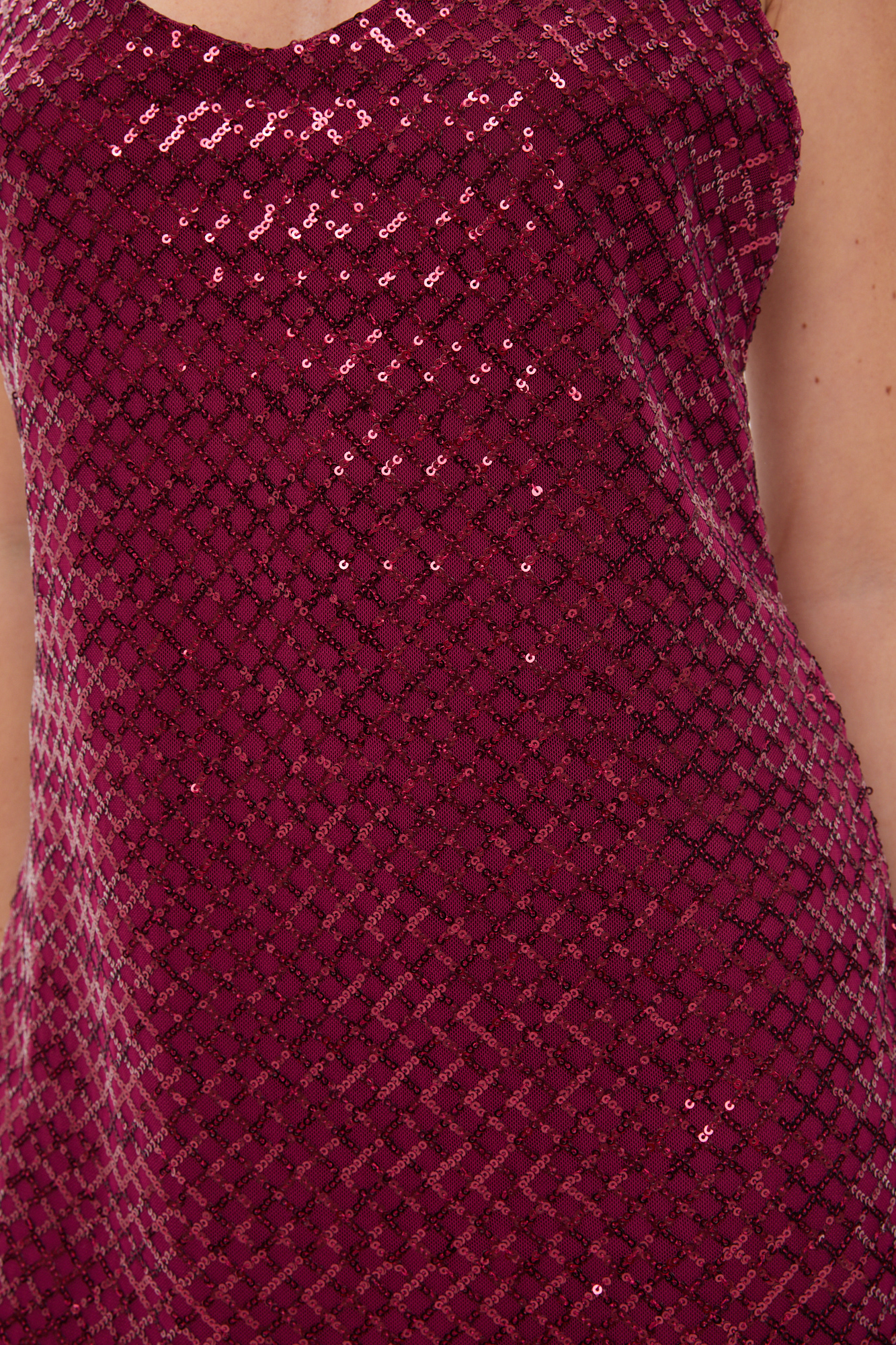 VESTIDO CORTO DE BRETEL FINO CON ESPALDA DESCUBIERTA Y LAZO AJUSTABLE. DISEÑO CON LENTEJUELAS Y FALDA CON CAÍDA SUAVE.100% POLIÉSTER.