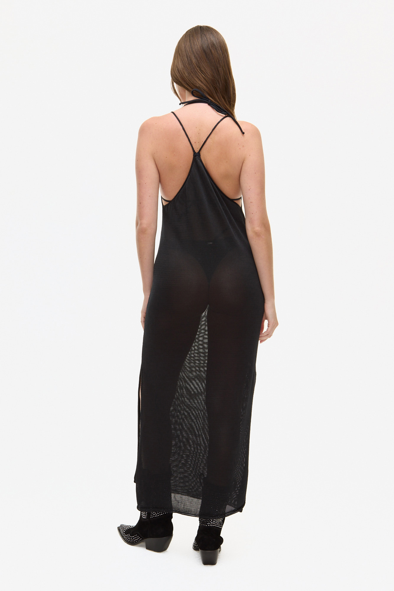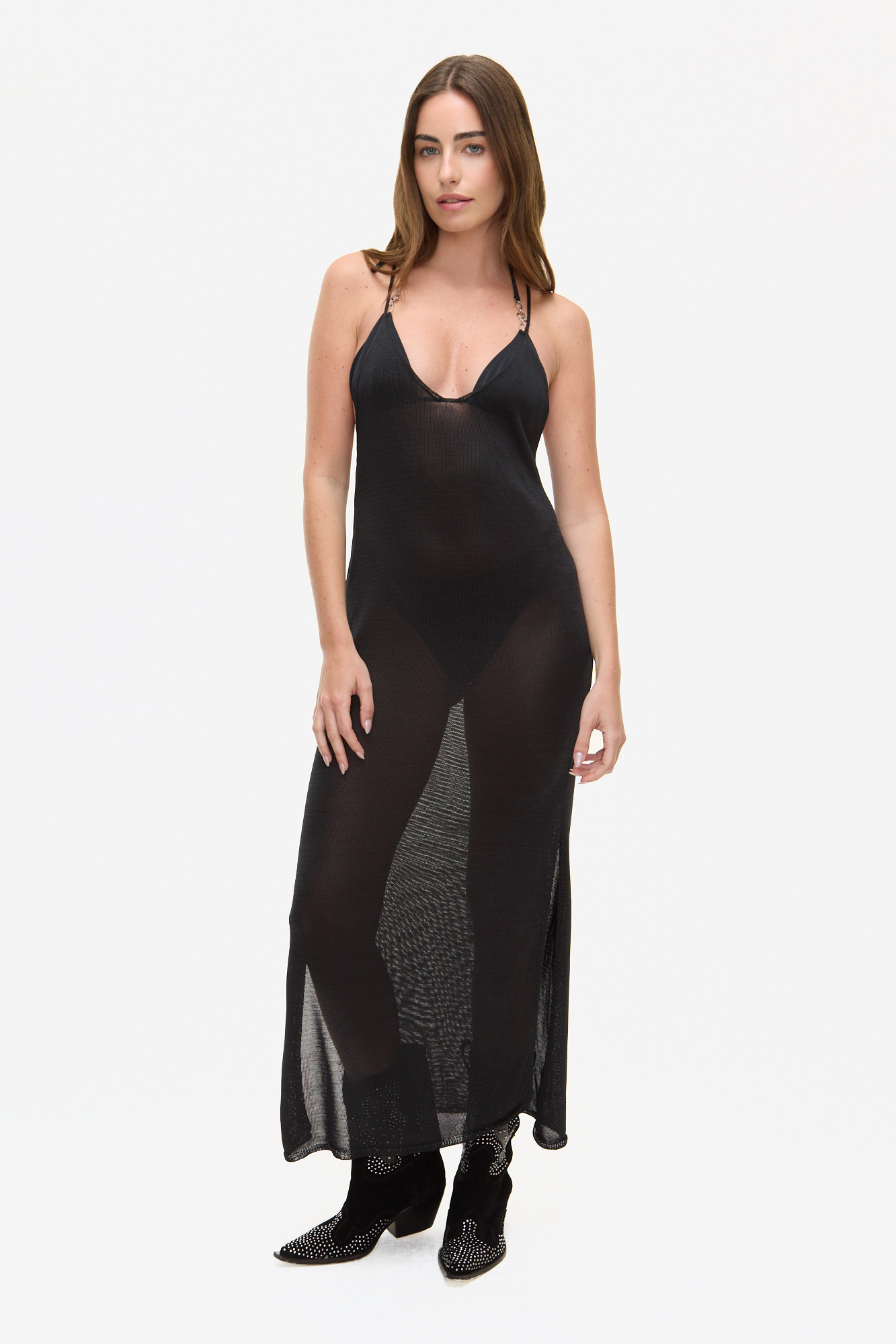 VESTIDO CONFECCIONADO EN TEJIDO DE RAYÓN. DISEÑO LARGO Y DE CALCE RELAJADO, CON ESCOTE EN V Y TIRAS FINAS. PRESENTA TEXTURA LIVIANA Y SEMITRANSPARENTE.100% RAYON.