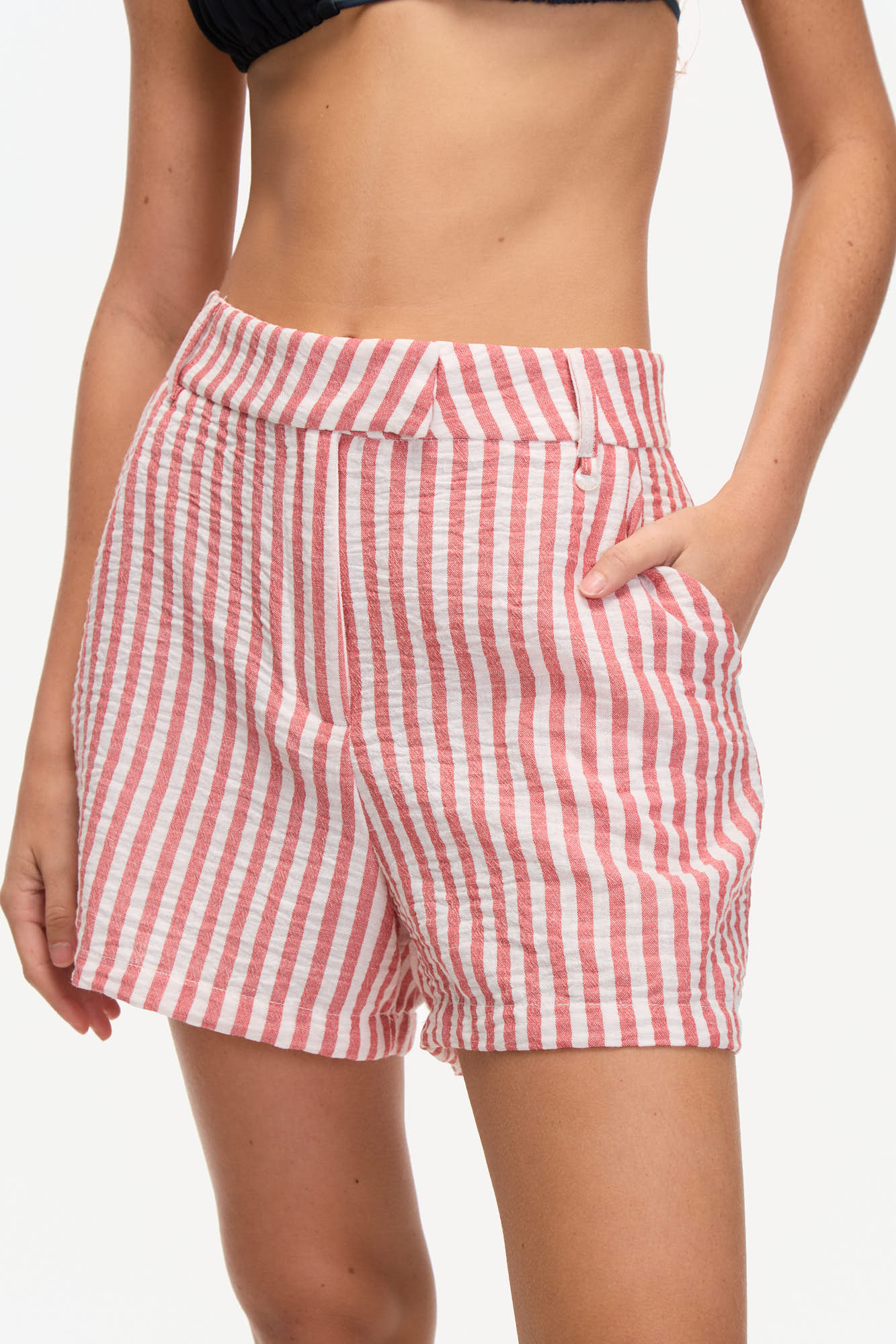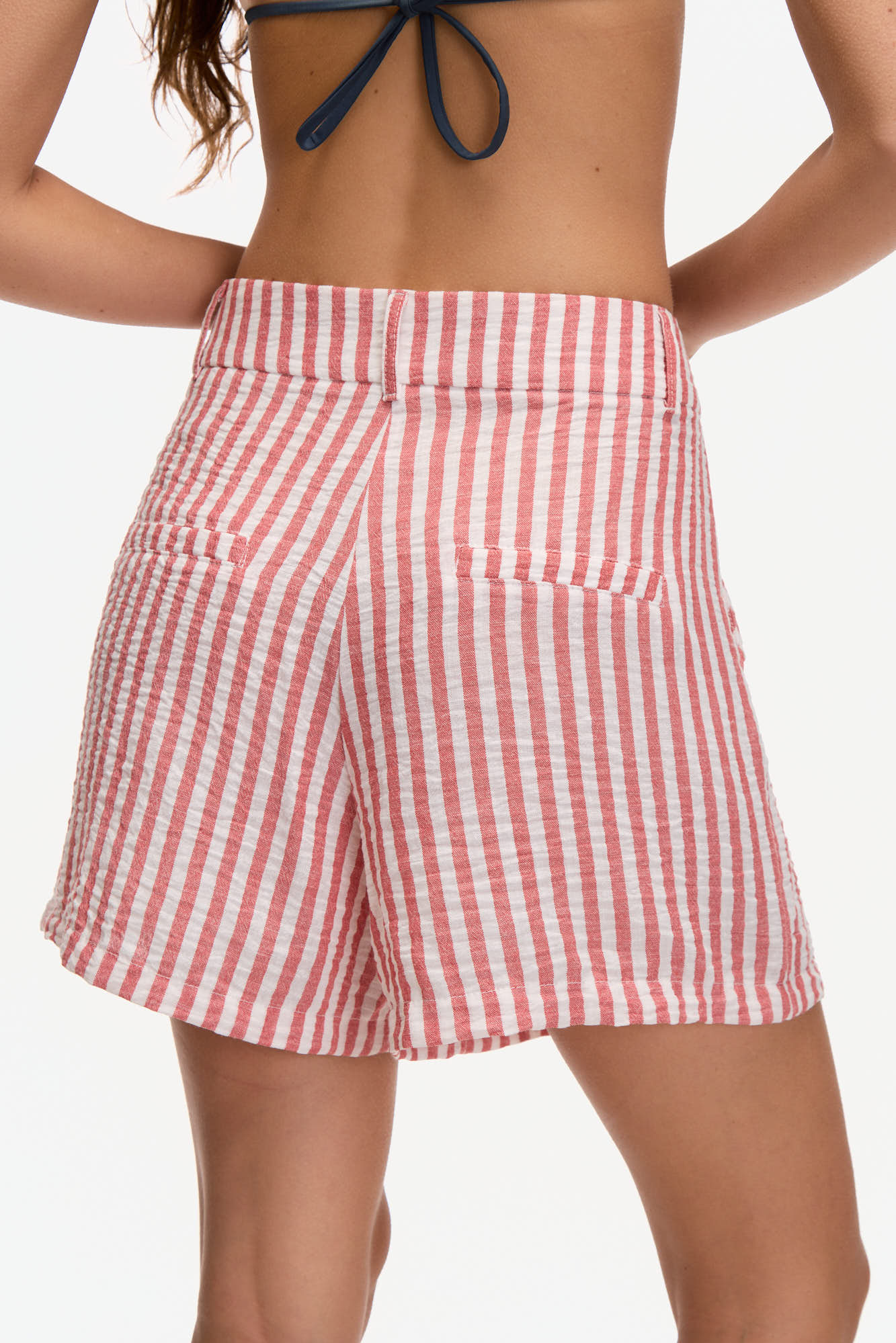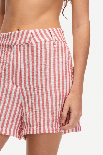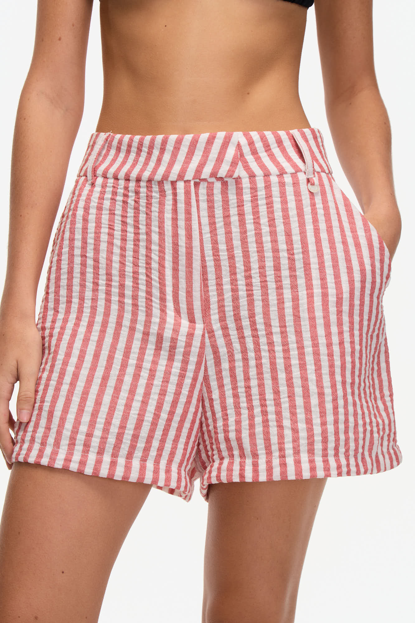 SHORT CONFECCIONADO EN TEJIDO DE POLIÉSTER CON TEXTURA Y ACABADO SIMILAR AL LINO. DISEÑO RAYADO, TIRO MEDIO Y SILUETA RECTA. CUENTA CON BOLSILLOS LATERALES Y CIERRE FRONTAL.