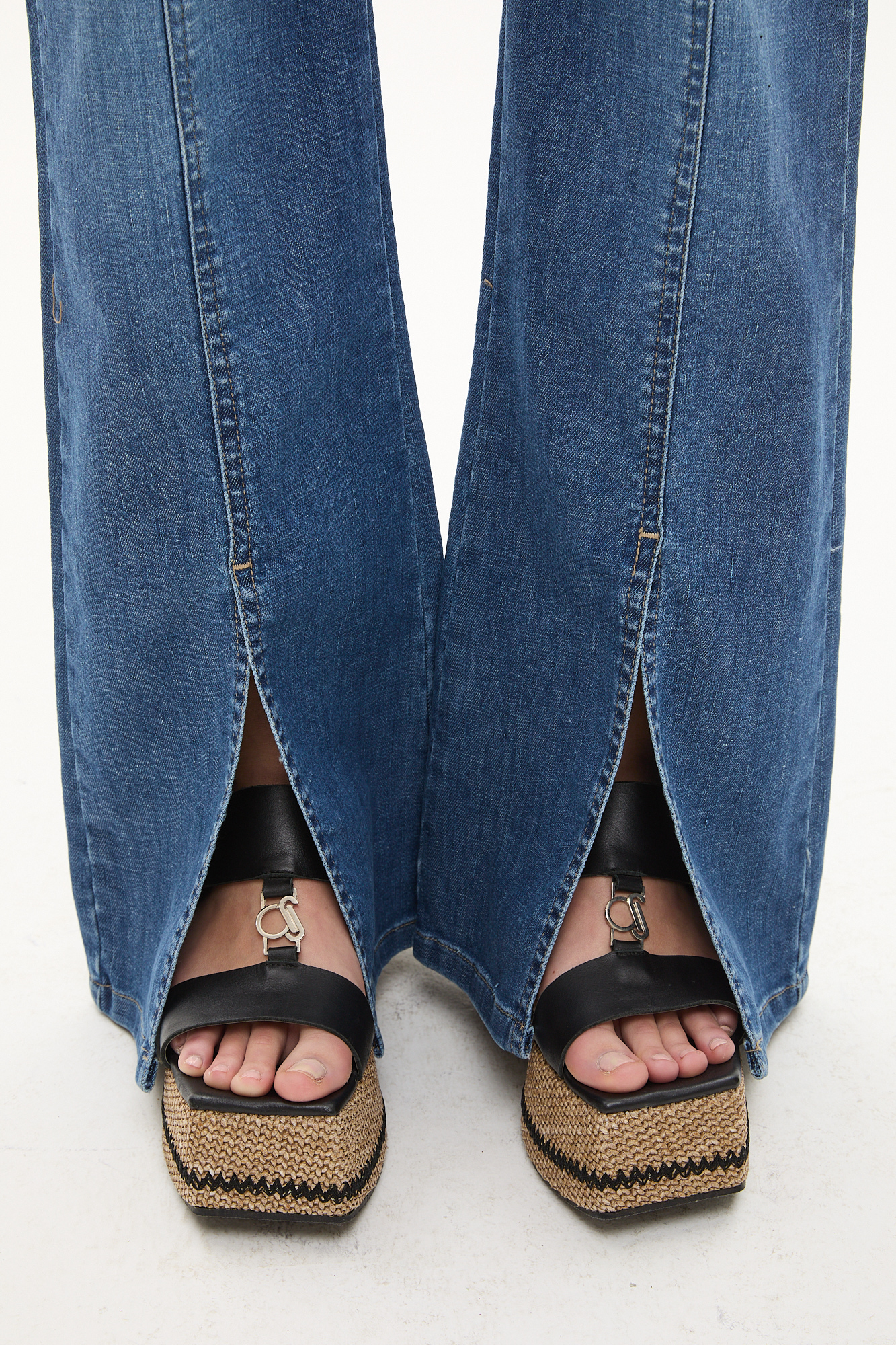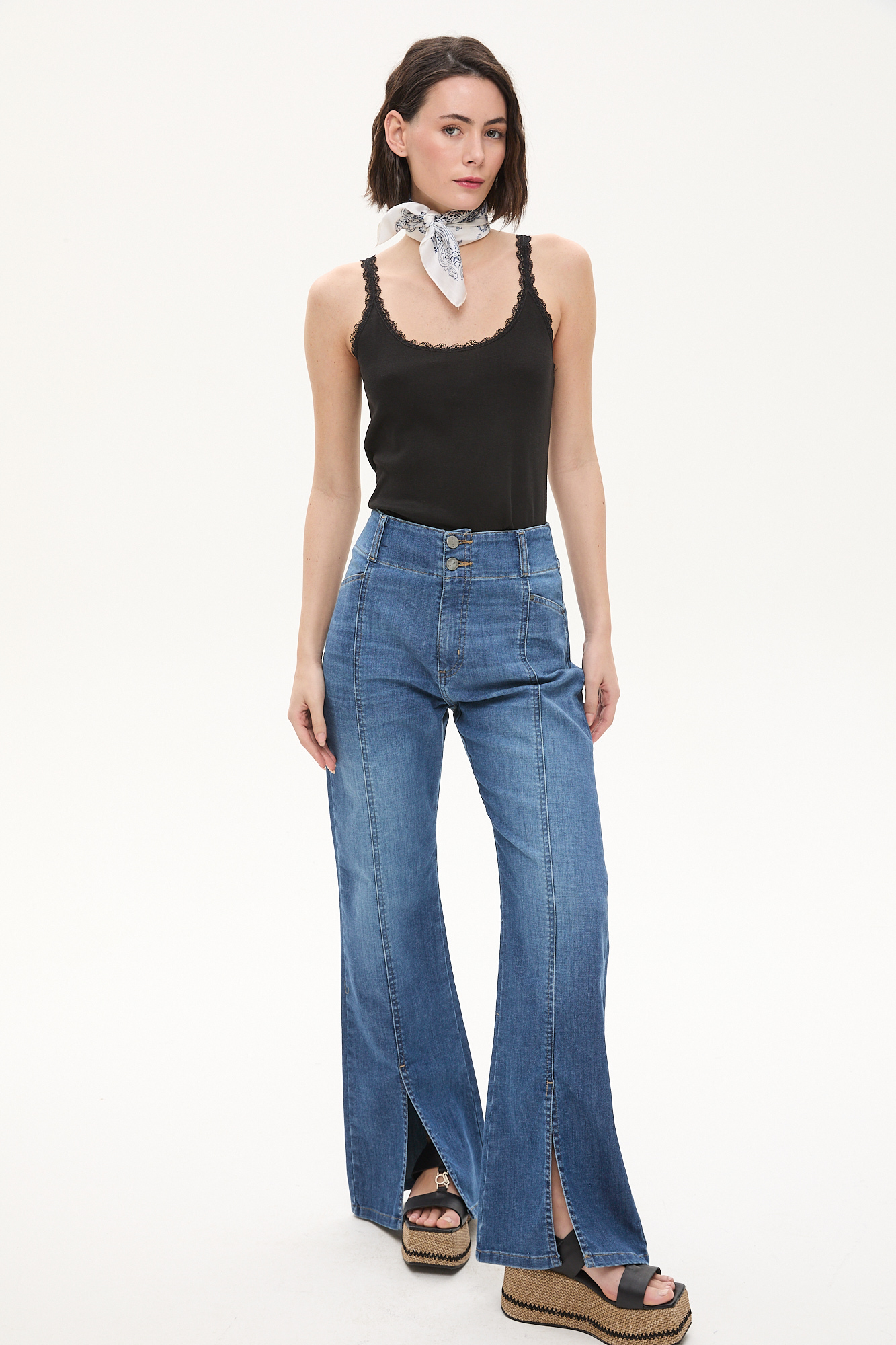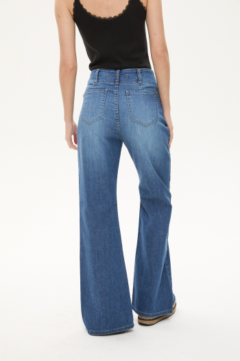 PANTALÓN DE DENIM TIRO ALTO CON COSTURAS VERTICALES Y ABERTURA FRONTAL EN LA BOTAMANGA. DISEÑO OXFORD CON CALCE CÓMODO Y CIERRE FRONTAL CON DOBLE BOTÓN. LARGO COMPLETO.78% ALGODÓN – 20% POLIÉSTER – 2% ELASTANO.