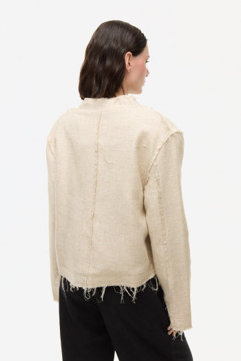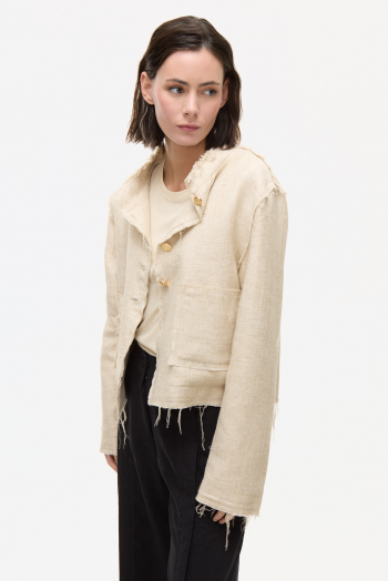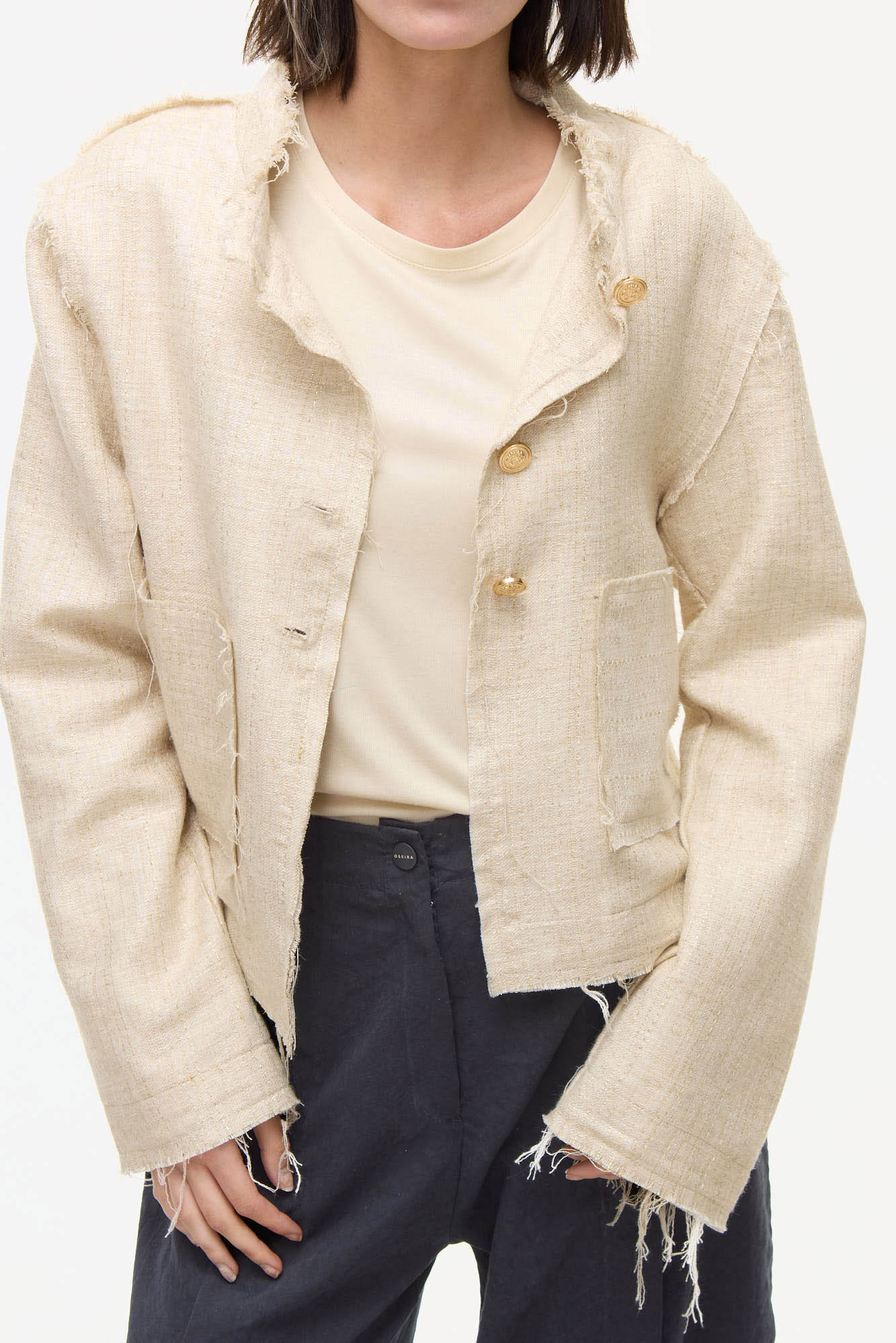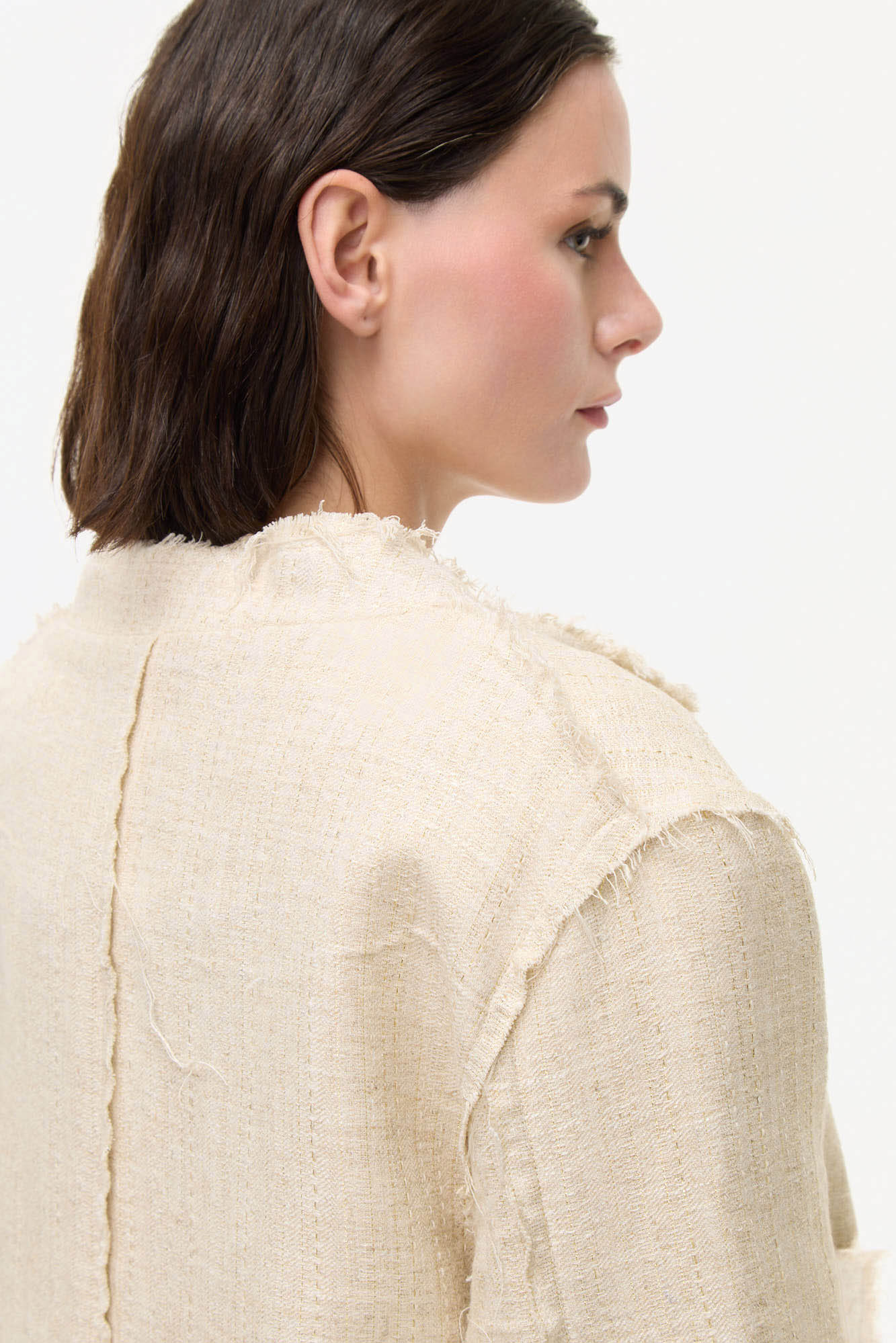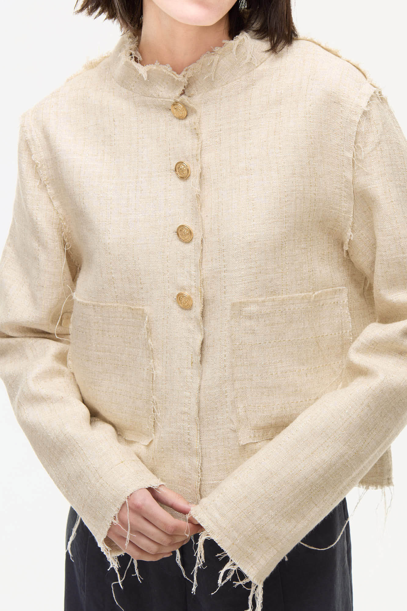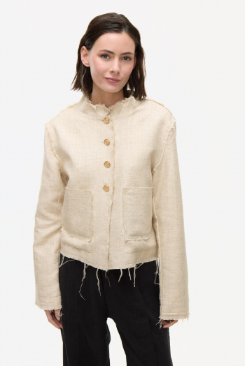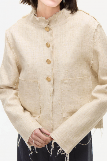 CONFECCIONADO EN TELA TIPO LINO CON LUREX. CUELLO REDONDO CON TERMINACIÓN DESFLECADA. CIERRE FRONTAL CON BOTONES DORADOS. BOLSILLOS PLAQUETA EN DELANTERO. HOMBROS CAÍDOS Y SILUETA RECTA. LARGO A LA CADERA.