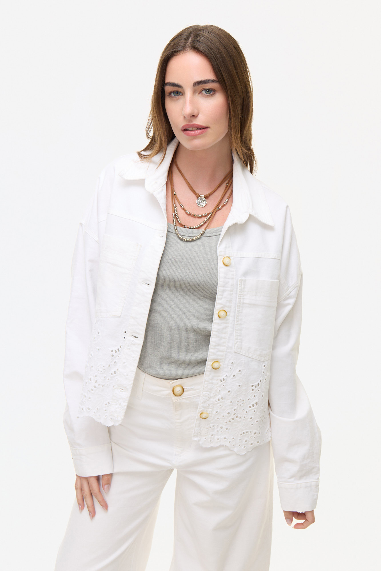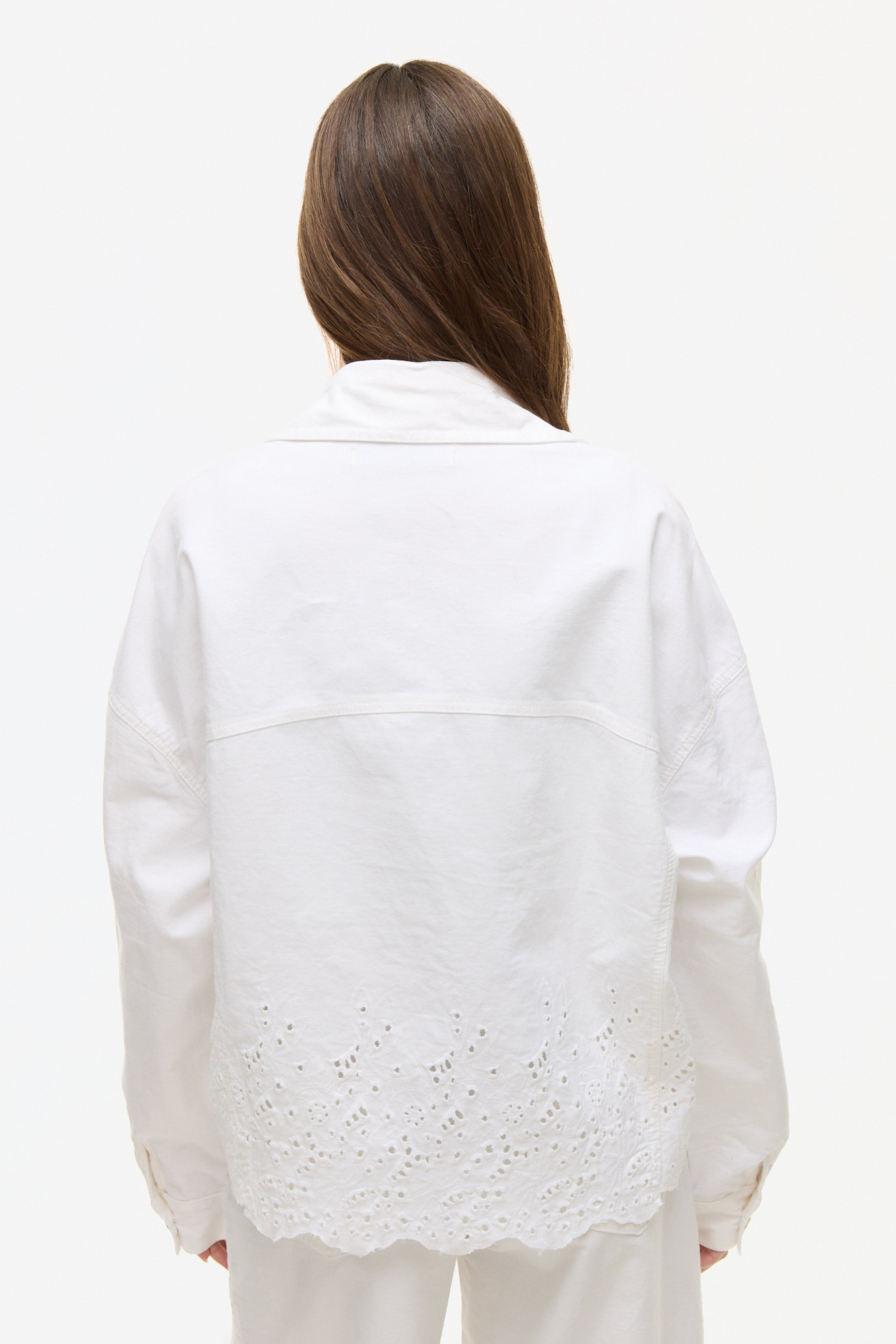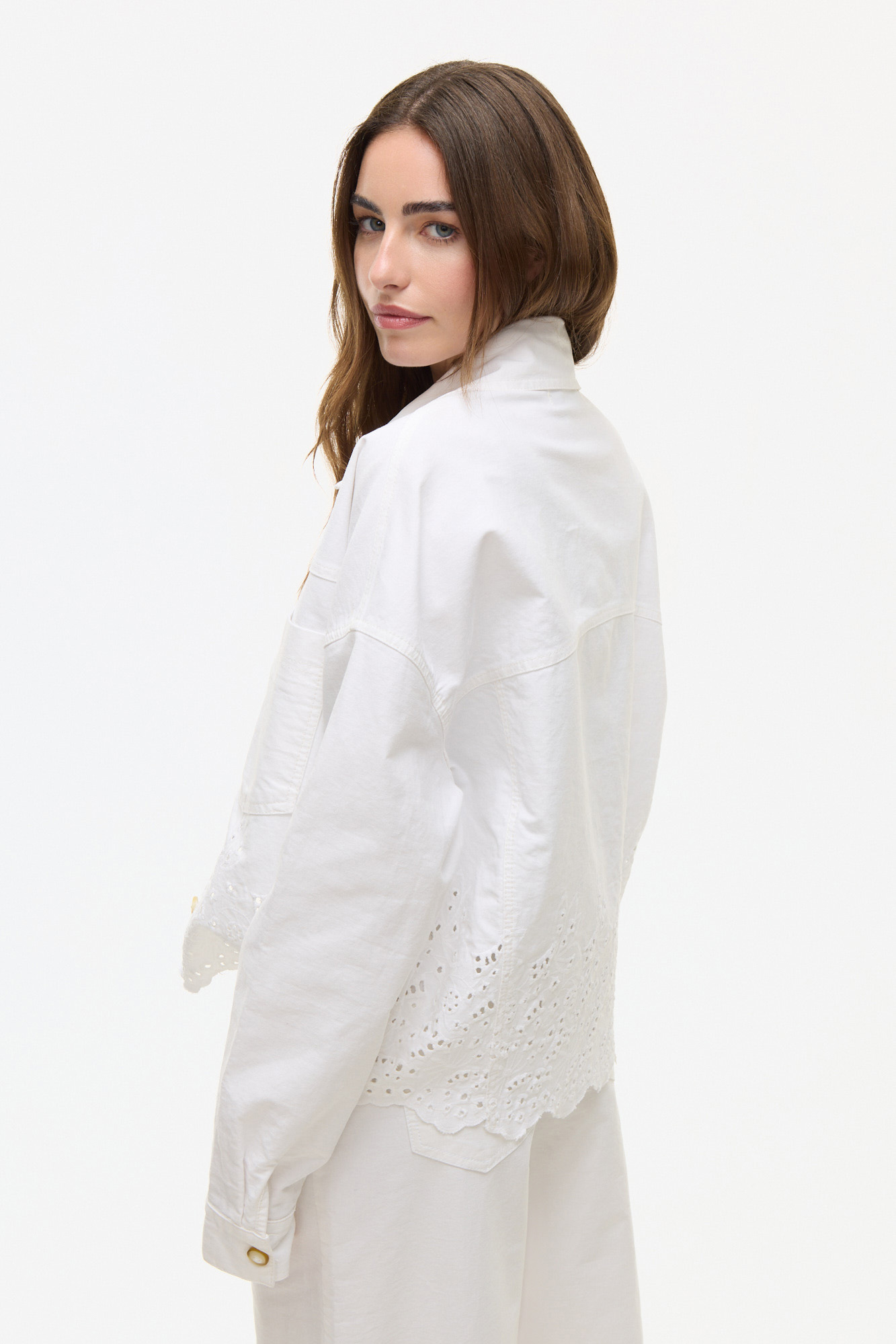 CAMPERA CONFECCIONADA EN GABARDINA DE ALGODÓN. CUELLO CAMISERO Y BOLSILLOS EN PECHO. RUEDO CON DETALLE DE BRODERIE Y CALCE OVERSIZE. CIERRE CON BOTONES TIPO CAREY A LA VISTA. 100% ALGODÓN.