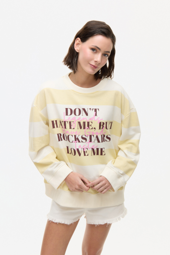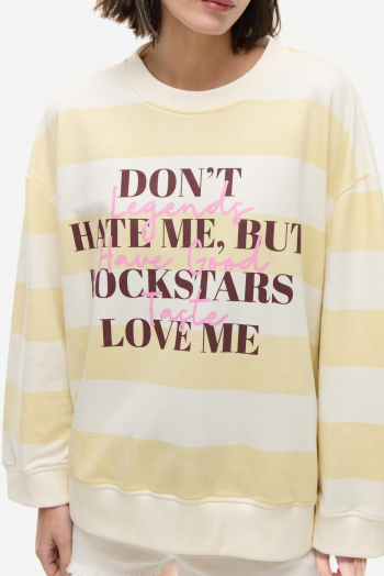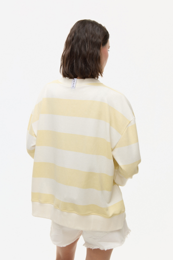 BUZO DE ALGODÓN RUSTICO RAYADO CON ESTAMPA EN COLOR. LARGO HASTA CADERA.