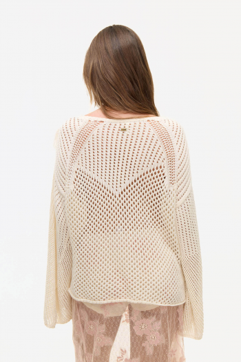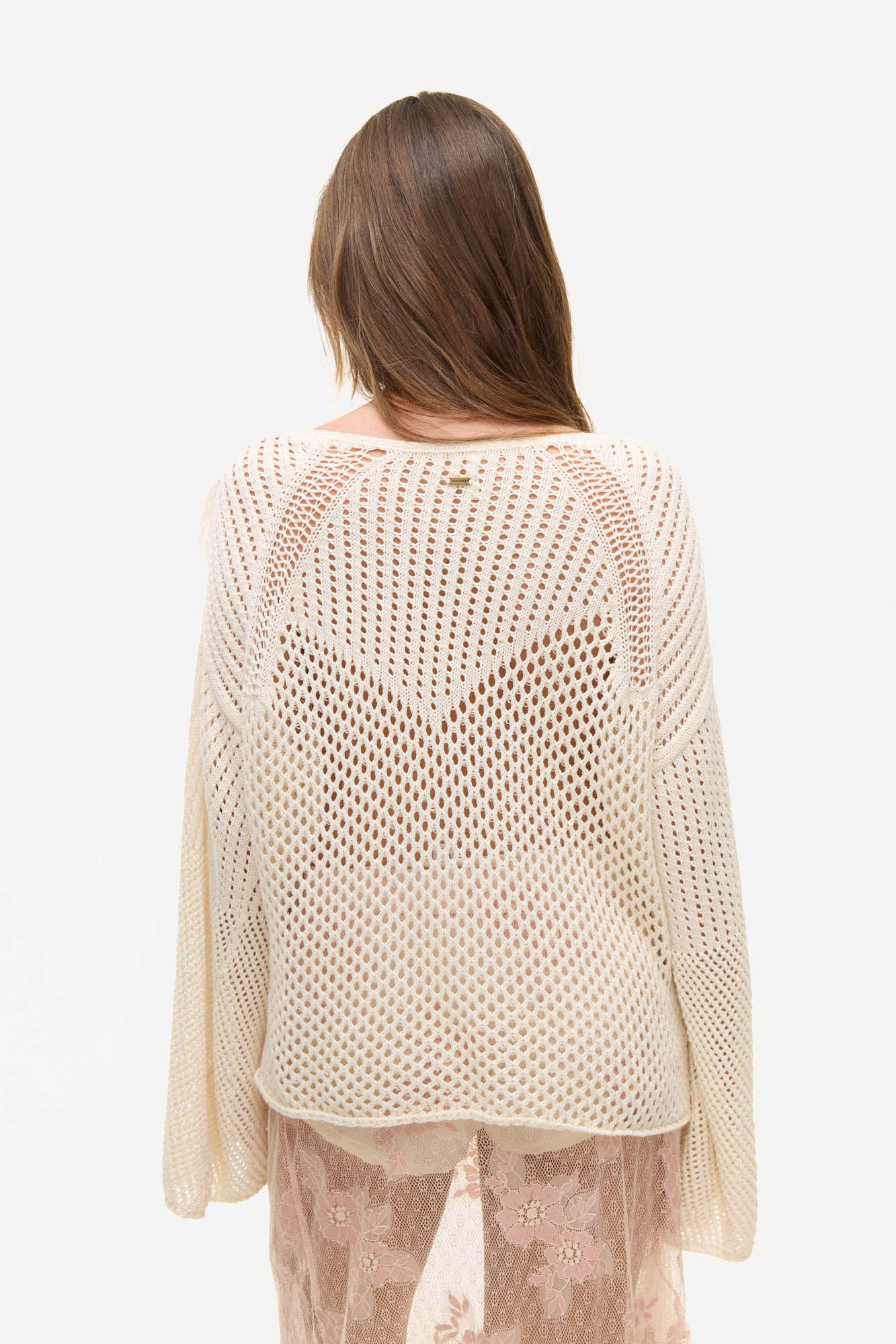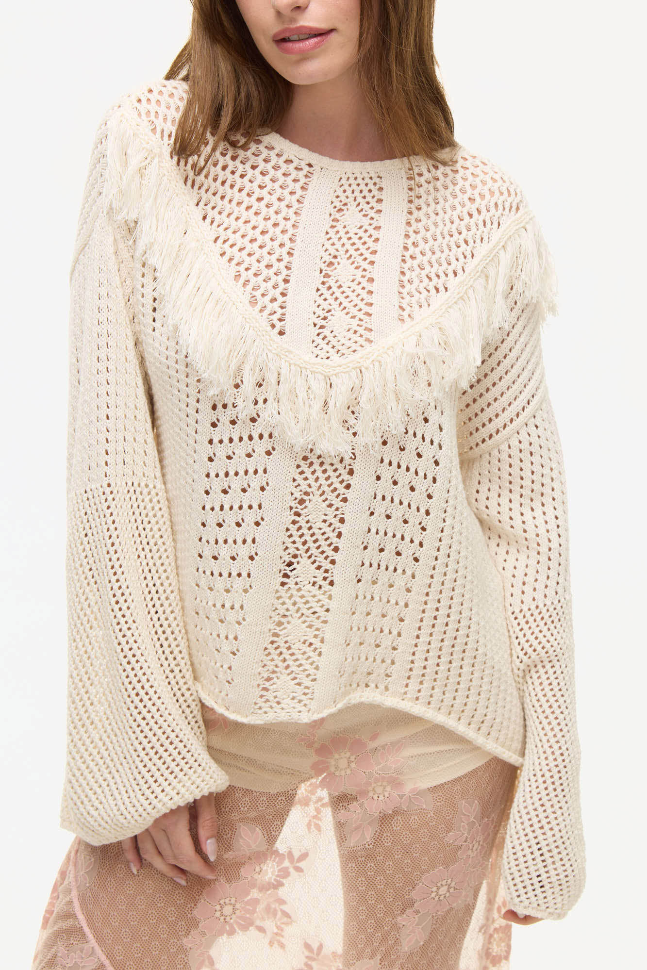 CONFECCIONADO EN TEJIDO ALGODÓN. DISEÑO CALADO CON FLECOS EN DELANTERO Y ESPALDA. CUELLO REDONDO Y MANGAS LARGAS. SILUETA HOLGADA Y LARGO A LA CADERA.100% ALGODÓN.