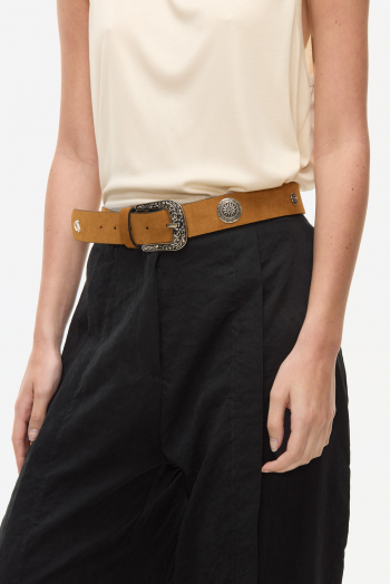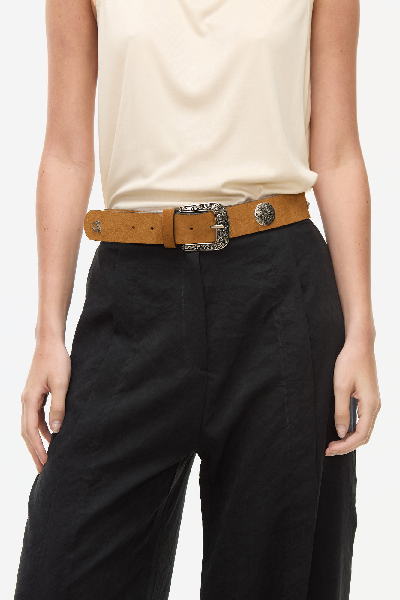 CINTURÓN DE GAMUZA CON HEBILLA, PASADOR Y PUNTERA METÁLICOS CON DETALLES GRABADOS. AJUSTE REGULABLE Y DISEÑO ESTILIZADO.90% GAMUZA – 10% METAL.