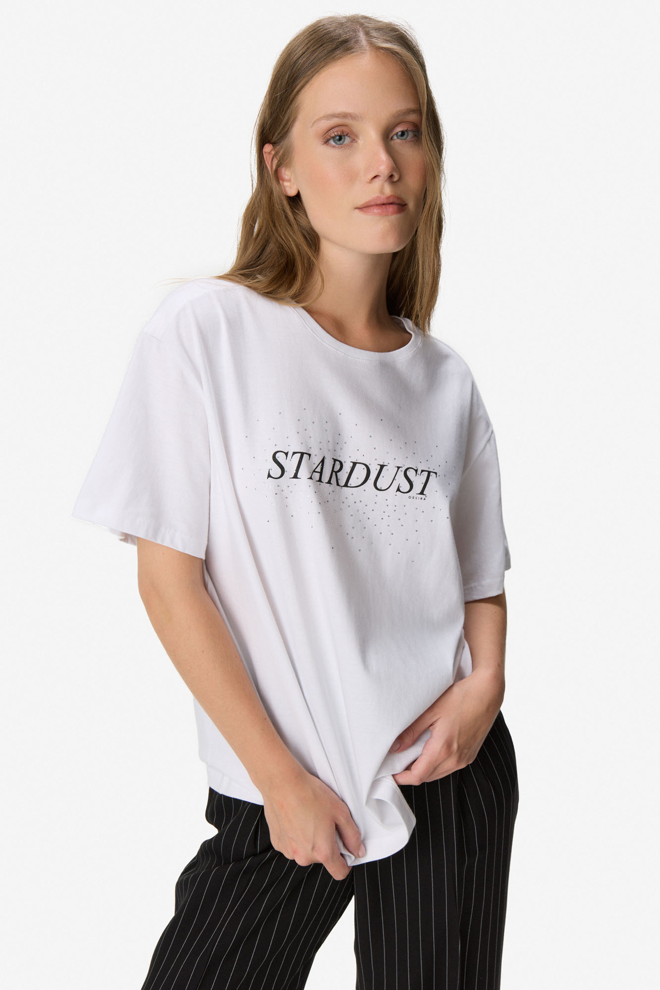 Remera de manga corta en jersey de algodón con escote redondo de ribb a tono. Presenta estampa frontal con inscripción “STARDUST” y diseño full print en espalda con motivos astrales. Un básico con impronta gráfica ideal para todos los días. 100% algodón