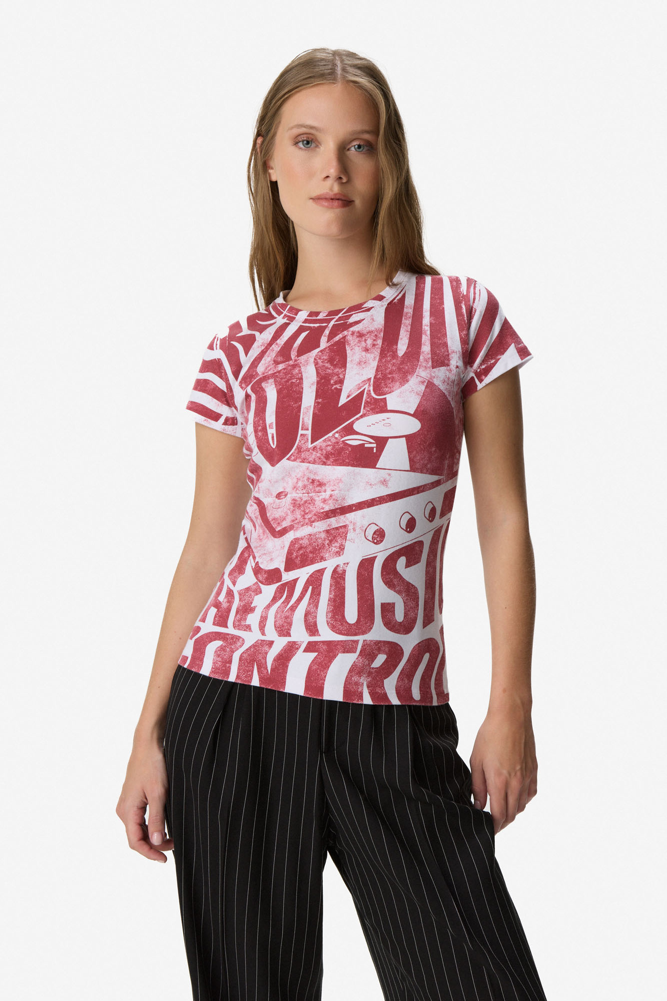 Remera de manga corta en algodón con estampa gráfica en alto contraste. Diseño de cuello redondo y calce cómodo que se adapta al cuerpo, ideal para el uso diario. Su print de inspiración urbana aporta un toque moderno y canchero, perfecto para combinar con prendas básicas o elevar looks casuales. 100% algodón.